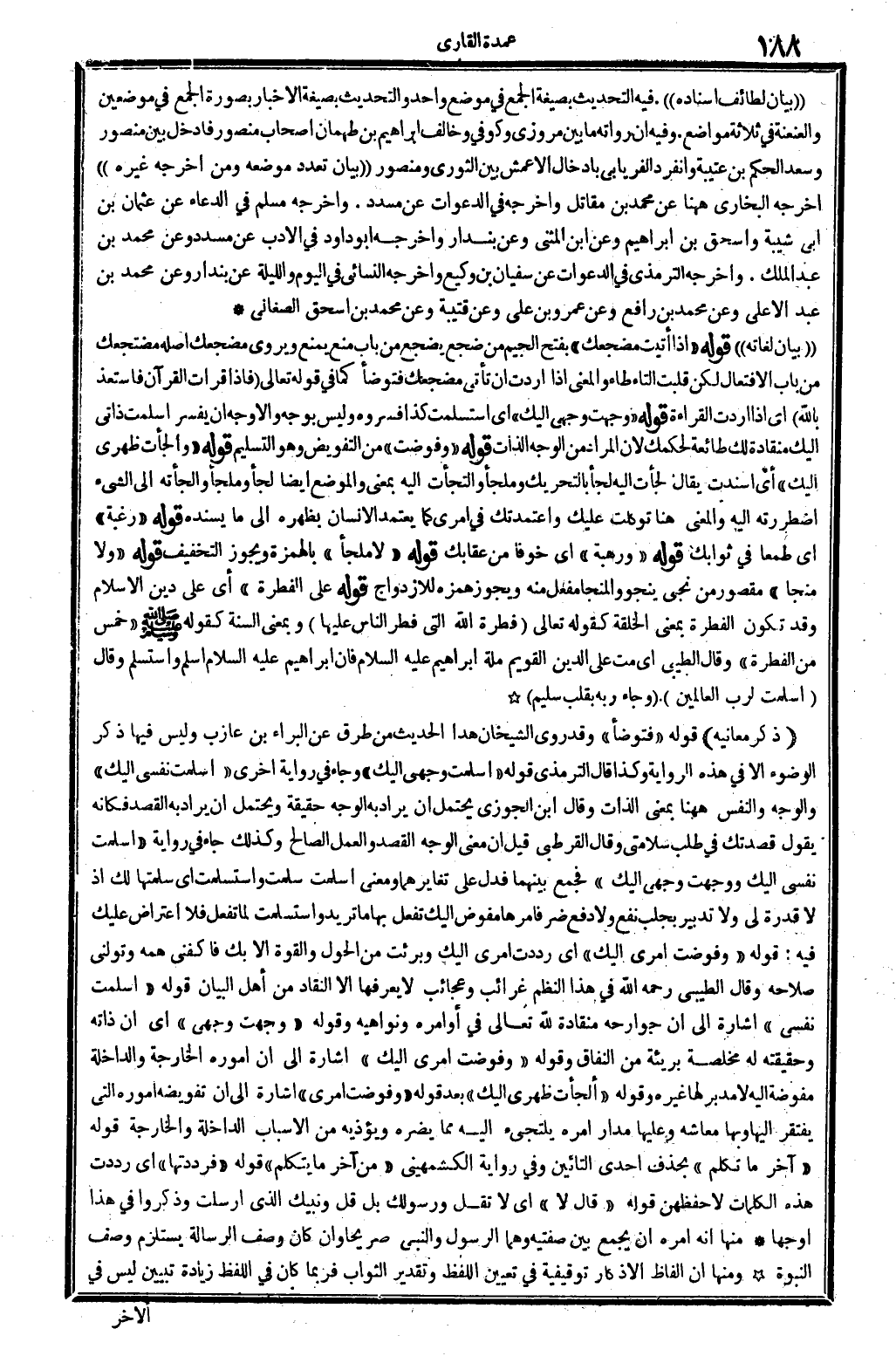 بَيَان لغاته قَوْله: (إِذا أثبت مضجعك) ، بِفَتْح الْجِيم من، ضجع من بَاب: منع يمْنَع ويروي: مضجعك أَصله مضتجعك، من بَاب الافتعال، لَكِن قتل التَّاء طاء وَالْمعْنَى: إِذا أردْت أَن يَأْتِي مضجعك فَتَوَضَّأ كَمَا فِي قَوْله تَعَالَى: {فَإِذا قَرَأت الْقُرْآن فاستعذ بِاللَّه} (سُورَة النَّحْل: 98 أَي إِذا أردْت الْقِرَاءَة قَوْله: (وجهت وَجْهي أليك) أَي: استسلمت، كَذَا فسره، وَلَيْسَ بِوَجْه. وَالْأَوْجه أَن يُفَسر: أسلمت ذاتي إِلَيْك منقادة لَك، طالعة لحكمك، لِأَن المُرَاد من الْوَجْه الذَّات. قَوْله: (وفوضت) من التَّفْوِيض وَهُوَ التَّسْلِيم: قَوْله: (والجأت ظَهْري إِلَيْك) أَي: أسندت. يُقَال: لجأت إِلَيْهِ لَجأ بِالتَّحْرِيكِ، وملجأ والتجأت إِلَيْهِ بِمَعْنى: والموضع أَيْضا، لَجأ وملجأ وألجأته إِلَى الشَّيْء اضطررته إِلَيْهِ، وَالْمعْنَى هُنَا، توكلت عَلَيْك واعتمدتك فِي أَمْرِي كَمَا يعْتَمد الْإِنْسَان بظهره إِلَى مَا يسْندهُ. قَوْله: (رَغْبَة) أَي: طَمَعا فِي ثوابك. قَوْله: (وَرَهْبَة) أَي: خوفًا من عقابك. قَوْله: (لَا ملْجأ) بِالْهَمْزَةِ وَيجوز التَّخْفِيف. قَوْله: (وَلَا منجأ) مَقْصُور من: نجى ينجو، والمنجأ مفعل مِنْهُ، وَيجوز همزَة للإزدواج قَوْله: (على الْفطْرَة) أَي: على دين الْإِسْلَام، وَقد تكون الْفطْرَة بِمَعْنى الْخلقَة، كَقَوْلِه تَعَالَى: {فطْرَة الله الَّتِي فطر النَّاس عَلَيْهَا} (سُورَة الرّوم: 30) وَبِمَعْنى السّنة كَقَوْلِه صلى الله عَلَيْهِ وَسلم: (خمس من الْفطْرَة) وقا الطيني: أَي: مت على الدّين القويم مِلَّة إِبْرَاهِيم عَلَيْهِ السَّلَام، فَإِن إِبْرَاهِيم عَلَيْهِ السَّلَام أسلم واستسلم، وَقَالَ: {} أسلمت لرب الْعَالمين (سُورَة الْبَقَرَة: 131) {وجار ربه بقلب سليم} (سُورَة الصافات: 84) .