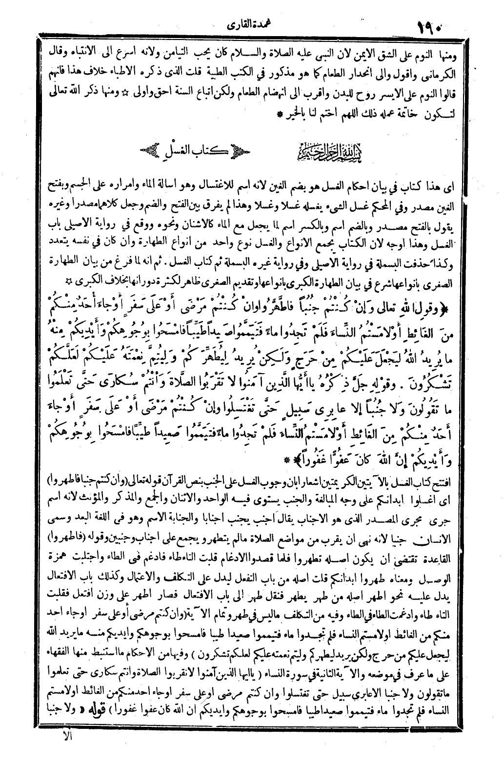 افْتتح كتاب الْغسْل بالآيتين الكريمتين إشعاراً بِأَن وجوب الْغسْل على الْجنب بِنَصّ الْقُرْآن قَوْله تَعَالَى: {وَإِن كُنْتُم جنبا فاطهروا} (سُورَة الْمَائِدَة: 6) أَي: إغسلوا أبدانكم على وَجه الْمُبَالغَة، وَالْجنب يَسْتَوِي فِيهِ الْوَاحِد والإثنان وَالْجمع والمذكر والمؤنث لِأَنَّهُ اسْم جرى مجْرى الْمصدر الَّذِي هُوَ الإجناب، يُقَال: أجنب يجنب إجناباً، والجنابة الِاسْم، وَهُوَ فِي اللُّغَة الْبعد، وَسمي الْإِنْسَان جنبا لِأَنَّهُ نهي أَن يقرب من مَوَاضِع الصَّلَاة مَا لم يتَطَهَّر، وَيجمع على أجناب وجنبين. وَقَوله: {فاطهروا} الْقَاعِدَة تَقْتَضِي أَن يكون أَصله، تطهروا فَلَمَّا قصدُوا الْإِدْغَام قلبت التَّاء طاء فأدغم فِي الطَّاء، واجتلبت همزَة الْوَصْل، وَمَعْنَاهُ: طهروا أبدانكم. قلت: أَصله من بَاب التفعل ليدل على التَّكَلُّف والاعتمال، وَكَذَلِكَ بَاب الافتعال يدل عَلَيْهِ، نَحْو: اطهر أَصله من: طهر يطهر، فَنقل طهر، إِلَى بَاب الافتعال، فَصَارَ: أطهر، على وزن افتعل فقلبت التَّاء طاء وأدغمت الطَّاء فِي الطَّاء وَفِيه من التَّكَلُّف مَا لَيْسَ فِي طهر، وَتَمام الْآيَة {وَإِن كُنْتُم مرضى أَو على سفر أَو جَاءَ أحد مِنْكُم من الْغَائِط أَو لامستم النِّسَاء فَلم تَجدوا مَاء فَتَيَمَّمُوا صَعِيدا طيبا فامسحوا بوجوهكم وَأَيْدِيكُمْ مِنْهُ مَا يُرِيد الله ليجعل عَلَيْكُم من حرج وَلَكِن يُرِيد ليطهركم وليتم نعْمَته عَلَيْكُم لَعَلَّكُمْ تشكرون} (سُورَة النِّسَاء:) وفيهَا من الْأَحْكَام مَا استنبط مِنْهَا الْفُقَهَاء على مَا عرف فِي مَوْضِعه.