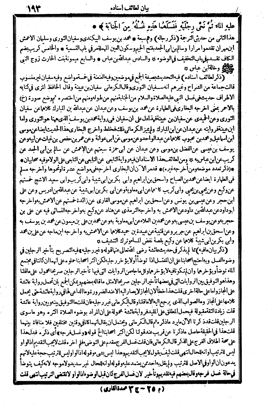 ذكر لطائف إِسْنَاده فِيهِ: التحديث بِصِيغَة الْجمع فِي موضِعين وَفِيه العنعنة فِي خَمْسَة مَوَاضِع: وَفِيه: سُفْيَان غير مَنْسُوب، قَالَت جمَاعَة من الشُّرَّاح وَغَيرهم: إِنَّه سُفْيَان الثَّوْريّ، وَقَالَ الْكرْمَانِي: سُفْيَان بن عُيَيْنَة. وَقَالَ الْحَافِظ الْمزي فِي كِتَابه (الْأَطْرَاف) حَدِيث فِي غسل النَّبِي، عَلَيْهِ الصَّلَاة وَالسَّلَام، من الْجَنَابَة مِنْهُم من طوله، وَمِنْهُم من اختسره، ثمَّ وضع صُورَة (خَ) بالأحمر بِمَعْنى: أخرجه البُخَارِيّ فِي الطَّهَارَة عَن مُحَمَّد بن يُوسُف، وَعَن عَبْدَانِ عَن عبد الله بن الْمُبَارك، كِلَاهُمَا عَن سُفْيَان الثَّوْريّ وَعَن الْحميدِي عَن سُفْيَان بن عُيَيْنَة، فَهَذَا دلّ على أَن سُفْيَان فِي رِوَايَة مُحَمَّد بن يُوسُف الَّذِي هَاهُنَا هُوَ الثَّوْريّ، وَأما ابْن عُيَيْنَة فروايته عَن عَبْدَانِ عَن ابْن الْمُبَارك، وَلم يُمَيّز الْكرْمَانِي ذَلِك فخلط. وَأخرج البُخَارِيّ هَذَا الحَدِيث أَيْضا عَن مُوسَى ابْن إِسْمَاعِيل وَمُحَمّد بن مَحْبُوب، كِلَاهُمَا عَن عبد الْوَاحِد، وَعَن مُوسَى عَن أبي عوَانَة، وَعَن عمر بن حَفْص بن غياث عَن أَبِيه، وَعَن يُوسُف بن عِيسَى عَن الْفضل بن مُوسَى، وَعَن عَبْدَانِ عَن أبي حَمْزَة، سبعتهم عَن الْأَعْمَش عَن سَالم بن أبي الْجَعْد عَن كريب عَن ابْن عَبَّاس بِهِ، وَمن لطائف هَذَا الْإِسْنَاد أَن فِيهِ: رِوَايَة التَّابِعِيّ عَن التَّابِعِيّ على التَّابِعِيّ عَن الْوَلَاء وَفِيه: صحابيان.