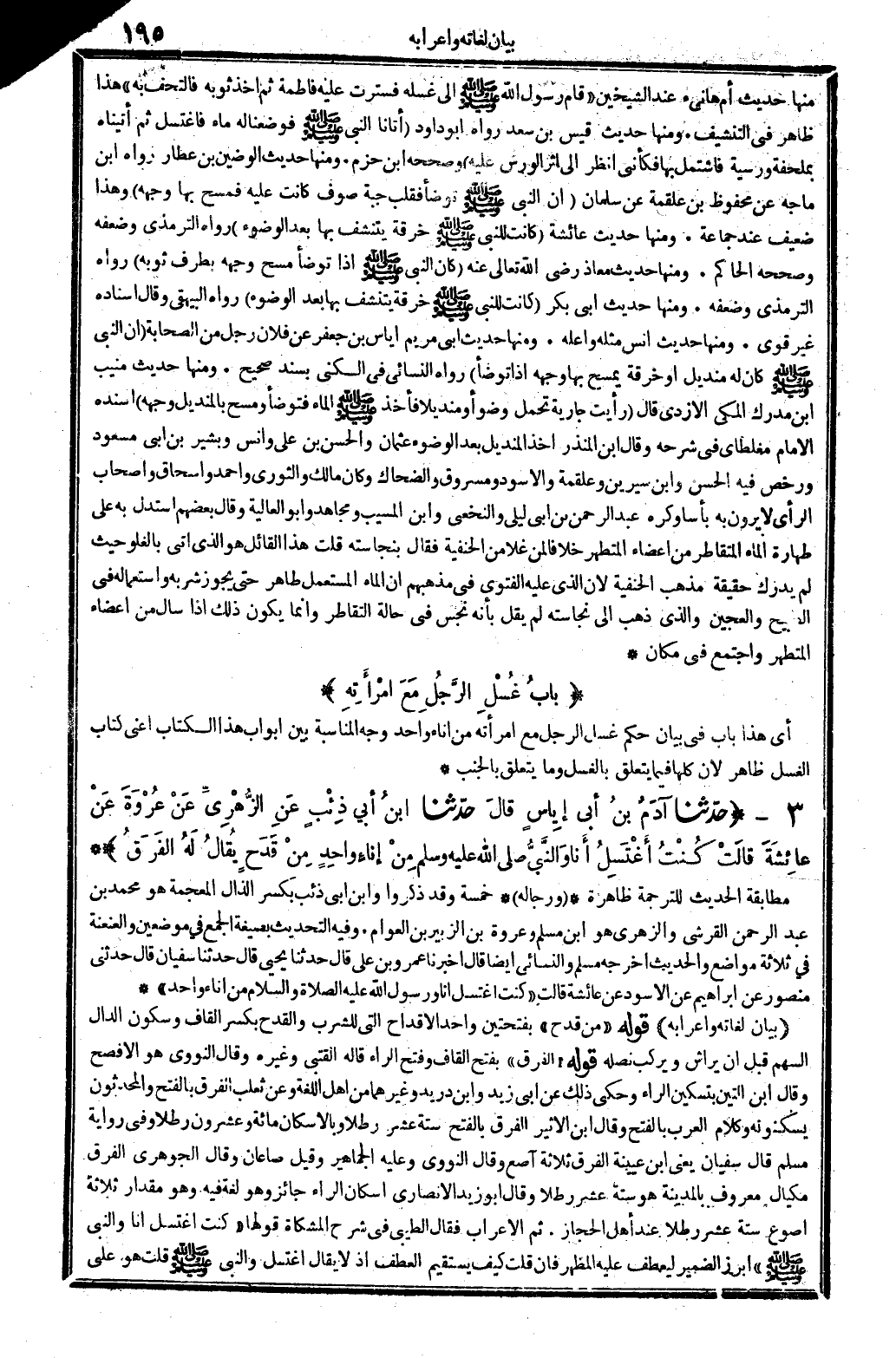 بَيَان لغاته وَإِعْرَابه قَوْله: (من قدح) بِفتْحَتَيْنِ، وَاحِد الْأَقْدَام الَّتِي للشُّرْب، والقدم: بِكَسْر الْقَاف وَسُكُون الدَّال، السهْم قبل أَن يراش ويركب نصله. قَوْله: (الْفرق) بِفَتْح الْقَاف وَفتح الرَّاء، قَالَه القتني وَغَيره، وَقَالَ النَّوَوِيّ: هُوَ الْأَفْصَح وَقَالَ ابْن التِّين بتسكين الرَّاء، وَحكى ذَلِك عَن أبي زيد وَابْن دُرَيْد وَغَيرهمَا من أهل اللُّغَة، وَعَن ثَعْلَب الْفرق بِالْفَتْح، والمحدثون يسكنونه، وَكَلَام الْعَرَب بِالْفَتْح، وَقَالَ ابْن الْأَثِير: الْفرق بِالْفَتْح، سِتَّة عشرَة رطلا، وبالإسكان مائ وَعِشْرُونَ رطلا وَفِي رِوَايَة مُسلم: قَالَ سُفْيَان؟ يَعْنِي ابْن عُيَيْنَة: الْفرق ثَلَاثَة آصَع، وَقَالَ النَّوَوِيّ: وَعَلِيهِ الجماهير. وَقيل: صَاعَانِ. وَقَالَ الْجَوْهَرِي: الْفرق مكيال مَعْرُوف بِالْمَدِينَةِ هُوَ سِتَّة عشر رطلا. وَقَالَ أَبُو زيد الْأنْصَارِيّ إسكان الرَّاء جَائِز، وَهُوَ لُغَة فِيهِ، وَهُوَ مِقْدَار ثَلَاثَة أصوع سِتَّة عشر رطلا عِنْد أهل الْحجاز.