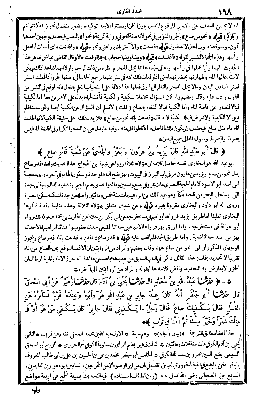 5 - (حَدثنَا عبد الله بن مُحَمَّد قَالَ حَدثنَا يحيى بن آدم قَالَ حَدثنَا زُهَيْر عَن أبي إِسْحَاق قَالَ حَدثنَا أَبُو جَعْفَر أَنه كَانَ عِنْد جَابر بن عبد الله هُوَ وَأَبوهُ وَعِنْده قوم فَسَأَلُوهُ عَن الْغسْل فَقَالَ يَكْفِيك صَاع فَقَالَ رجل مَا يَكْفِينِي فَقَالَ جَابر كَانَ يَكْفِي من هُوَ أوفى مِنْك شعرًا وَخير مِنْك ثمَّ أمنا فِي ثوب) هَذَا أَيْضا مُطَابق للتَّرْجَمَة. (بَيَان رِجَاله) وهم سَبْعَة الأول عبد الله بن مُحَمَّد الْجعْفِيّ تقدم عَن قريب الثَّانِي يحيى بن آدم الْكُوفِي مَاتَ سنة ثَلَاث وَمِائَتَيْنِ الثَّالِث زُهَيْر بِضَم الزَّاي بن مُعَاوِيَة الْكُوفِي ثمَّ الْجَزرِي الرَّابِع أَبُو اسحق السبيعِي بِفَتْح السِّين عَمْرو بن عبد الله الْكُوفِي الْخَامِس أَبُو جَعْفَر مُحَمَّد بن عَليّ بن الْحُسَيْن بن عَليّ بن أبي طَالب الْمَعْرُوف بالباقر دفن بِالبَقِيعِ فِي الْقبَّة الْمَشْهُورَة بِالْعَبَّاسِ تقدم فِي بَاب من لم ير الْوضُوء إِلَّا من المخرجين. السَّادِس أَبوهُ هُوَ زين العابدين. السَّابِع جَابر الصَّحَابِيّ رَضِي الله تَعَالَى عَنهُ. (بَيَان لطائف إِسْنَاده) فِيهِ التحديث بِصِيغَة الْجمع فِي أَرْبَعَة مَوَاضِع