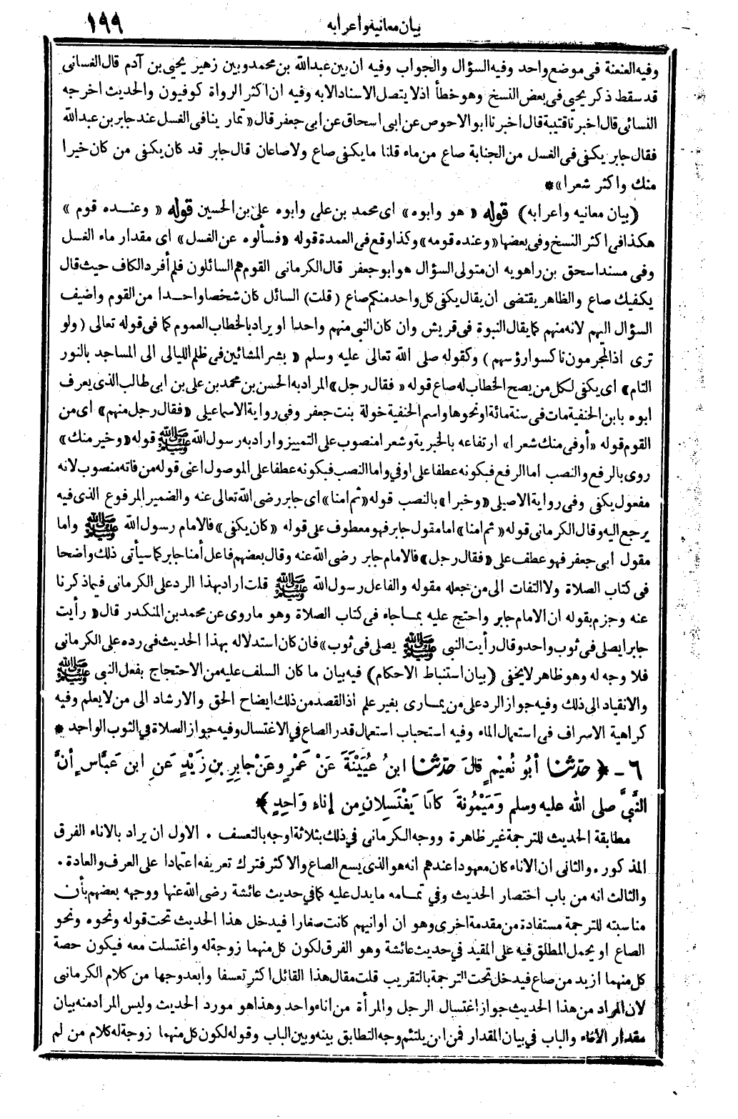 وَفِيه العنعنة فِي مَوضِع وَاحِد وَفِيه السُّؤَال وَالْجَوَاب وَفِيه أَن بَين عبد الله بن مُحَمَّد وَبَين زُهَيْر يحيى بن آدم قَالَ الغساني قد سقط ذكر يحيى فِي بعض النّسخ وَهُوَ خطأ إِذْ لَا يتَّصل الْإِسْنَاد إِلَّا بِهِ وَفِيه أَن أَكثر الروَاة كوفيون والْحَدِيث أخرجه النَّسَائِيّ قَالَ أخبرنَا قُتَيْبَة قَالَ أخبرنَا أَبُو الْأَحْوَص عَن أبي إِسْحَاق عَن أبي جَعْفَر قَالَ " تمار يُنَافِي الْغسْل عِنْد جَابر بن عبد الله فَقَالَ جَابر يَكْفِي فِي الْغسْل من الْجَنَابَة صَاع من مَاء قُلْنَا مَا يَكْفِي صَاع وَلَا صَاعَانِ قَالَ جَابر قد كَانَ يَكْفِي من كَانَ خيرا مِنْك وَأكْثر شعرًا ". (بَيَان مَعَانِيه وَإِعْرَابه) قَوْله " هُوَ وَأَبوهُ " أَي مُحَمَّد بن عَليّ وَأَبوهُ عَليّ بن الْحُسَيْن قَوْله " وَعِنْده قوم " هَكَذَا فِي أَكثر النّسخ وَفِي بَعْضهَا " وَعِنْده قومه " وَكَذَا وَقع فِي الْعُمْدَة قَوْله " فَسَأَلُوهُ عَن الْغسْل " أَي مِقْدَار مَاء الْغسْل وَفِي مُسْند اسحق بن رَاهَوَيْه أَن مُتَوَلِّي السُّؤَال هُوَ أَبُو جَعْفَر قَالَ الْكرْمَانِي الْقَوْم هم السائلون فَلم أفرد الْكَاف حَيْثُ قَالَ يَكْفِيك صَاع وَالظَّاهِر يَقْتَضِي أَن يُقَال يَكْفِي كل وَاحِد مِنْكُم صَاع (قلت) السَّائِل كَانَ شخصا وَاحِدًا من الْقَوْم وأضيف السُّؤَال إِلَيْهِم لِأَنَّهُ مِنْهُم كَمَا يُقَال النُّبُوَّة فِي قُرَيْش وَإِن كَانَ النَّبِي مِنْهُم وَاحِدًا أَو يُرَاد بِالْخِطَابِ الْعُمُوم كَمَا فِي قَوْله تَعَالَى {وَلَو ترى إِذْ المجرمون ناكسوا رُؤْسهمْ} وَكَقَوْلِه - صَلَّى اللَّهُ عَلَيْهِ وَسَلَّم َ - " بشر الْمَشَّائِينَ فِي ظلم اللَّيَالِي إِلَى الْمَسَاجِد بِالنورِ التَّام " أَي يَكْفِي لكل مَا يَصح الْخطاب لَهُ صَاع قَوْله " فَقَالَ رجل " المُرَاد بِهِ الْحسن بن مُحَمَّد بن عَليّ بن أبي طَالب الَّذِي يعرف أَبوهُ بِابْن الْحَنَفِيَّة مَاتَ فِي سنة مائَة أَو نَحْوهَا وَاسم الْحَنَفِيَّة خَوْلَة بنت جَعْفَر وَفِي رِوَايَة الْإِسْمَاعِيلِيّ " فَقَالَ رجل مِنْهُم " أَي من الْقَوْم قَوْله " أوفى مِنْك شعرًا " ارتفاعه بالخبرية وشعرا مَنْصُوب على التَّمْيِيز وَأَرَادَ بِهِ رَسُول الله - صَلَّى اللَّهُ عَلَيْهِ وَسَلَّم َ - قَوْله " وَخير مِنْك " روى بِالرَّفْع وَالنّصب أما الرّفْع فبكونه عطفا على أوفى وَأما النصب فبكونه عطفا على الْمَوْصُول أَعنِي قَوْله من فَاتَهُ مَنْصُوب لِأَنَّهُ مفعول يَكْفِي وَفِي رِوَايَة الْأصيلِيّ " وخبرا " بِالنّصب قَوْله " ثمَّ أمنا " أَي جَابر رَضِي الله تَعَالَى عَنهُ وَالضَّمِير الْمَرْفُوع الَّذِي فِيهِ يرجع إِلَيْهِ وَقَالَ الْكرْمَانِي قَوْله " ثمَّ أمنا " أما مقول جَابر فَهُوَ مَعْطُوف على قَوْله " كَانَ يَكْفِي " فالإمام رَسُول الله - صَلَّى اللَّهُ عَلَيْهِ وَسَلَّم َ - وَأما مقول أبي جَعْفَر فَهُوَ عطف على " فَقَالَ رجل " فالإمام جَابر رَضِي الله عَنهُ وَقَالَ بَعضهم فَاعل أمنا جَابر كَمَا سَيَأْتِي ذَلِك وَاضحا فِي كتاب الصَّلَاة وَلَا الْتِفَات إِلَى من جعله مقوله وَالْفَاعِل رَسُول الله - صَلَّى اللَّهُ عَلَيْهِ وَسَلَّم َ - قلت أَرَادَ بِهَذَا الرَّد على الْكرْمَانِي فِيمَا ذكرنَا عَنهُ وَجزم بقوله أَن الإِمَام جَابر وَاحْتج عَلَيْهِ بِمَا جَاءَ فِي كتاب الصَّلَاة وَهُوَ مَا روى عَن مُحَمَّد بن الْمُنْكَدر قَالَ " رَأَيْت جَابِرا يُصَلِّي فِي ثوب وَاحِد وَقَالَ رَأَيْت النَّبِي - صَلَّى اللَّهُ عَلَيْهِ وَسَلَّم َ - يُصَلِّي فِي ثوب " فَإِن كَانَ استدلاله بِهَذَا الحَدِيث فِي رده على الْكرْمَانِي فَلَا وَجه لَهُ وَهُوَ ظَاهر لَا يخفى. (بَيَان استنباط الْأَحْكَام) فِيهِ بَيَان مَا كَانَ السّلف عَلَيْهِ من الِاحْتِجَاج بِفعل النَّبِي - صَلَّى اللَّهُ عَلَيْهِ وَسَلَّم َ - والانقياد إِلَى ذَلِك وَف