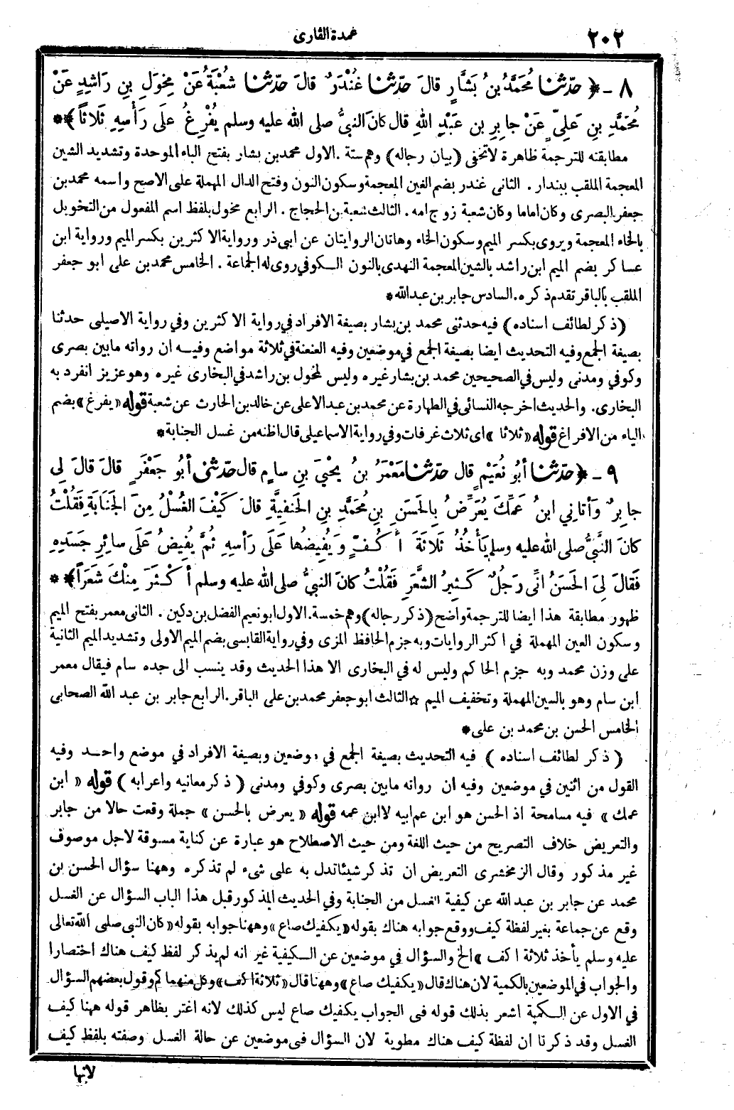 9 - (حَدثنَا أَبُو نعيم قَالَ حَدثنَا معمر بن يحيى بن سَام قَالَ حَدثنِي أَبُو جَعْفَر قَالَ قَالَ لي جَابر وأتاني ابْن عمك يعرض بالْحسنِ بن مُحَمَّد بن الْحَنَفِيَّة قَالَ كَيفَ الْغسْل من الْجَنَابَة فَقلت كَانَ النَّبِي - صَلَّى اللَّهُ عَلَيْهِ وَسَلَّم َ - يَأْخُذ ثَلَاثَة أكف ويفيضها على رَأسه ثمَّ يفِيض على سَائِر جسده فَقَالَ لي الْحسن إِنِّي رجل كثير الشّعْر فَقلت كَانَ النَّبِي - صَلَّى اللَّهُ عَلَيْهِ وَسَلَّم َ - أَكثر مِنْك شعرًا) ظُهُور مُطَابقَة هَذَا أَيْضا للتَّرْجَمَة وَاضح. (ذكر رِجَاله) وهم خَمْسَة. الأول أَبُو نعيم الْفضل بن دُكَيْن. الثَّانِي معمر بِفَتْح الْمِيم وَسُكُون الْعين الْمُهْملَة فِي أَكثر الرِّوَايَات وَبِه جزم الْحَافِظ الْمزي وَفِي رِوَايَة الْقَابِسِيّ بِضَم الْمِيم الأولى وَتَشْديد الْمِيم الثَّانِيَة على وزن مُحَمَّد وَبِه جزم الْحَاكِم وَلَيْسَ لَهُ فِي البُخَارِيّ إِلَّا هَذَا الحَدِيث وَقد ينْسب إِلَى جده سَام فَيُقَال معمر ابْن سَام وَهُوَ بِالسِّين الْمُهْملَة وَتَخْفِيف الْمِيم الثَّالِث أَبُو جَعْفَر مُحَمَّد بن عَليّ الباقر. الرَّابِع جَابر بن عبد الله الصَّحَابِيّ. الْخَامِس الْحسن بن مُحَمَّد بن عَليّ (ذكر لطائف إِسْنَاده) فِيهِ التحديث بِصِيغَة الْجمع فِي موضِعين وبصيغة الْإِفْرَاد فِي مَوضِع وَاحِد وَفِيه القَوْل من اثْنَيْنِ فِي موضِعين وَفِيه أَن رُوَاته مَا بَين بَصرِي وكوفي ومدني. (ذكر مَعَانِيه وَإِعْرَابه) قَوْله " ابْن عمك " فِيهِ مُسَامَحَة إِذْ الْحسن هُوَ ابْن عَم أَبِيه لَا ابْن عَمه قَوْله " يعرض بالْحسنِ " جملَة وَقعت حَالا من جَابر والتعريض خلاف التَّصْرِيح من حَيْثُ اللُّغَة وَمن حَيْثُ الِاصْطِلَاح هُوَ عبارَة عَن كِنَايَة مسوقة لأجل مَوْصُوف غير مَذْكُور وَقَالَ الزَّمَخْشَرِيّ التَّعْرِيض أَن تذكر شَيْئا تدل بِهِ على شَيْء لم تذكره وَهَهُنَا سُؤال الْحسن بن مُحَمَّد عَن جَابر بن عبد الله عَن كَيْفيَّة الْغسْل من الْجَنَابَة وَفِي الحَدِيث الْمَذْكُور قبل هَذَا الْبَاب السُّؤَال عَن الْغسْل وَقع عَن جمَاعَة بِغَيْر لَفْظَة كَيفَ وَوَقع جَوَابه هُنَاكَ بقوله " يَكْفِيك صَاع " وَهَهُنَا جَوَابه بقوله " كَانَ النَّبِي - صَلَّى اللَّهُ عَلَيْهِ وَسَلَّم َ - يَأْخُذ ثَلَاثَة أكف " الخ وَالسُّؤَال فِي موضِعين عَن الْكَيْفِيَّة غير أَنه لم يذكر لفظ كَيفَ هُنَاكَ اختصارا وَالْجَوَاب فِي الْمَوْضِعَيْنِ بالكمية لِأَن هُنَاكَ قَالَ " يَكْفِيك صَاع " وَهَهُنَا قَالَ " ثَلَاثَة أكف " وكل مِنْهُمَا كم وَقَول بَعضهم السُّؤَال فِي الأول عَن الكمية أشعر بذلك قَوْله فِي الْجَواب يَكْفِيك صَاع لَيْسَ كَذَلِك لِأَنَّهُ اغْترَّ بِظَاهِر قَوْله هَهُنَا كَيفَ الْغسْل وَقد ذكرنَا أَن لفظ كَيفَ هُنَاكَ مطوية لِأَن السُّؤَال فِي موضِعين عَن حَالَة الْغسْل وَصفته بِلَفْظ كَيفَ