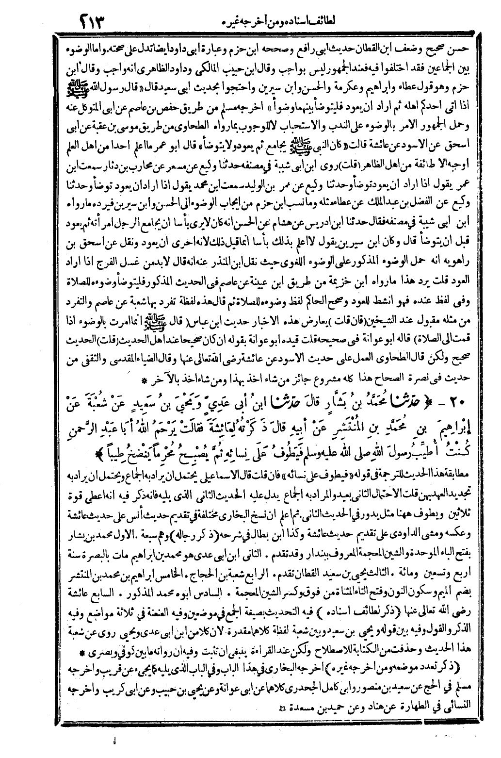 ذكر لطائف إِسْنَاده فِيهِ: التحديث بِصِيغَة الْجمع فِي موضِعين وَفِيه: العنعنة فِي ثَلَاثَة مَوَاضِع. وَفِيه: الذّكر وَالْقَوْل وَفِيه: قَوْله: وَيحيى بن سعيد، وَبَين شُعْبَة لَفْظَة: كِلَاهُمَا مقدرَة، لِأَن كلاًّ من ابْن أبي عدي وَيحيى روى عَن شُعْبَة هَذَا الحَدِيث، وحذفت من الْكِتَابَة للاصطلاح، وَلَكِن عِنْد الْقِرَاءَة يَنْبَغِي أَن تثبت. وَفِيه: أَن رُوَاته مَا بَين كُوفِي وبصري.