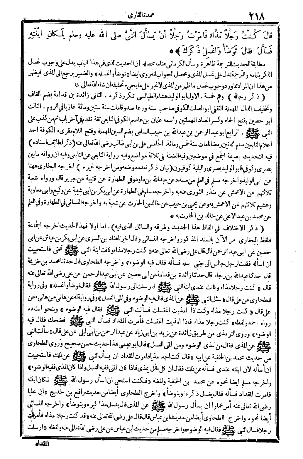 قالَ كُنْتُ رَجخلاً مَدَّاءً فَأَمَرْتُ رَجُلاً أنْ يَسْأَلَ النبيُّ صلى الله عَلَيْهِ وَسلم لِمَكانٍ ابْنَتِهِ فَسَأَلَ فقالَ تَوَضَّأْ وَاغْسِلْ ذَكَرَكَ.