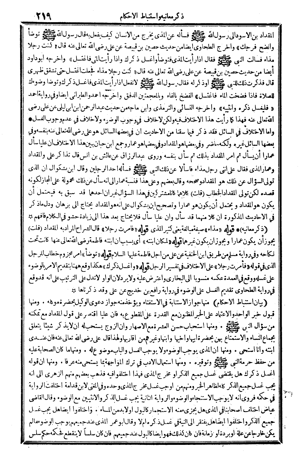 الْمِقْدَاد بن الْأسود إِلَى رَسُول الله صلى الله عَلَيْهِ وَسلم، فَسَأَلَهُ عَن الْمَذْي يخرج من الْإِنْسَان، كَيفَ يفعل: قَالَ رَسُول الله صلى الله عَلَيْهِ وَسلم: تَوَضَّأ وانضح فرجك) وَأخرج الطَّحَاوِيّ أَيْضا من حَدِيث حُصَيْن بن قبيصَة عَن عَليّ، رَضِي الله تَعَالَى عَنهُ. قَالَ: (كنت رجلا مذاءً فَسَأَلت النَّبِي صلى الله عَلَيْهِ وَسلم، فَقَالَ: إِذا رَأَيْت الْمَذْي فَتَوَضَّأ واغسل ذكرك، وَإِذا رَأَيْت الْمَنِيّ فاغتسل) وَأخرجه أَبُو دَاوُد أَيْضا من حَدِيث حُصَيْن بن قبيصَة عَن عَليّ، رَضِي الله تَعَالَى عَنهُ، قَالَ: (كنت رجلا مذاءً، فَجعلت اغْتسل حَتَّى تشقق ظَهْري قَالَ: فَذكرت ذَلِك للنَّبِي صلى الله عَلَيْهِ وَسلم أَو ذكر لَهُ، فَقَالَ رَسُول الله صلى الله عَلَيْهِ وَسلم: لَا تفعل إِذا رَأَيْت الْمَذْي فاغسل ذكرك وَتَوَضَّأ وضوءك للصَّلَاة فَإِذا فضخت المَاء فاغتسل) الفضخ، بِالْفَاءِ وبالمعجمتين، الدفق، وَأخرجه أَحْمد وَالطَّبَرَانِيّ أَيْضا وَفِي رِوَايَة أَحْمد (فليغسل ذكره وأنثييه) وَأخرجه النَّسَائِيّ وَالتِّرْمِذِيّ وَابْن مَاجَه من حَدِيث عبد الرَّحْمَن ابْن أبي ليلى عَن عَليّ، رَضِي الله تَعَالَى عَنهُ، فَهَذَا كَمَا رَأَيْت هَذَا الِاخْتِلَاف فِيهِ، وَلَكِن لَا خلاف فِي وجوب الْوضُوء، وَلَا خلاف فِي عدم وجوب الْغسْل.