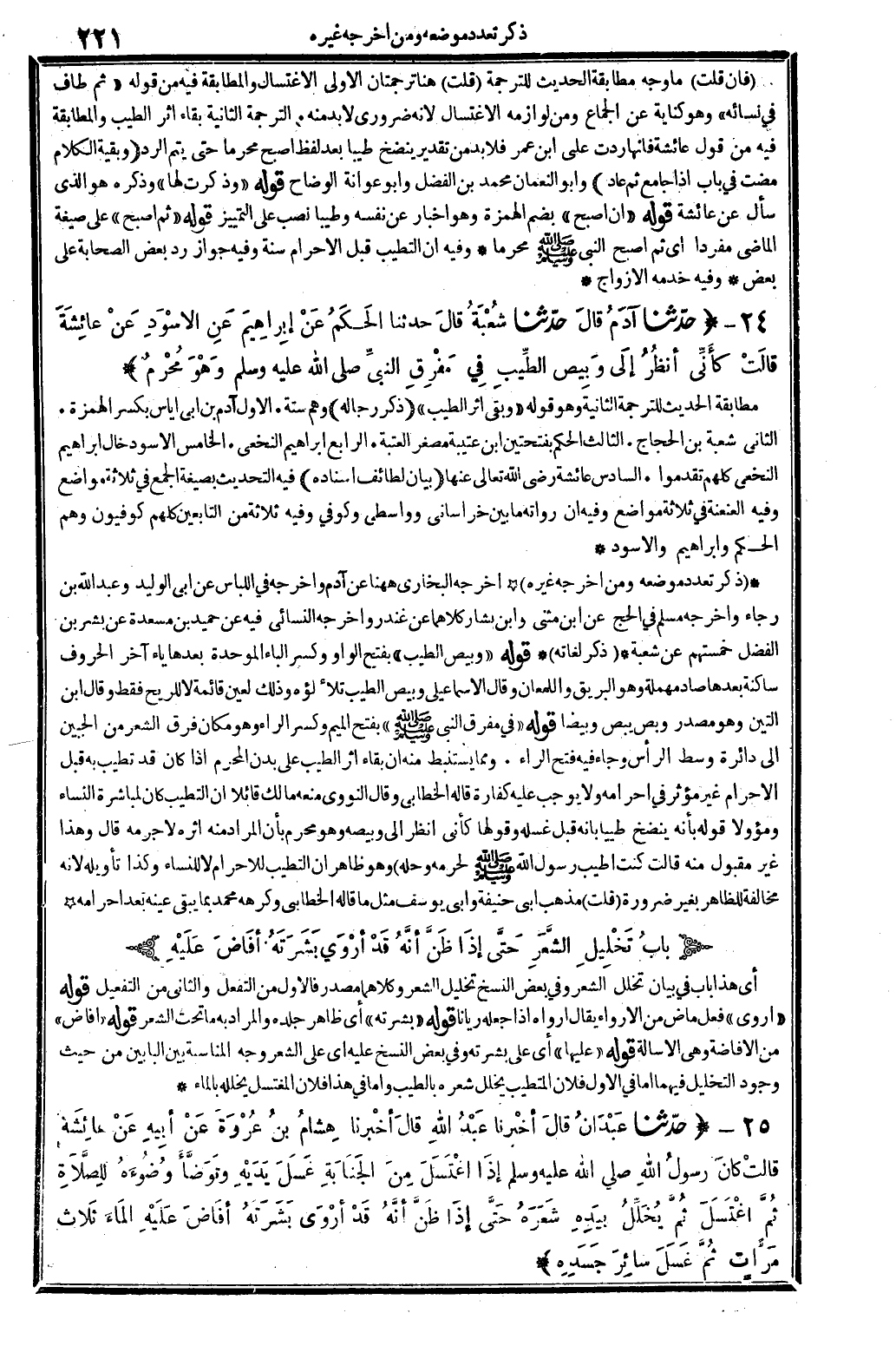 271 - حدّثنا آدَمُ قالَ حدّثنا شُعْبَةُ قالَ حدّثنا الحَكَمُ عَنْ إبْراهِيمَ عَنِ الأسْوَدِ عَنْ عائِشَةَ قالَتْ كأنِّى أَنْظُرُ إِلَى وَبِيص الطِّيبِ فِي مَفْرِقِ النبيِّ صلى الله عَلَيْهِ وَسلم وَهُوَ مُحْرمُ..