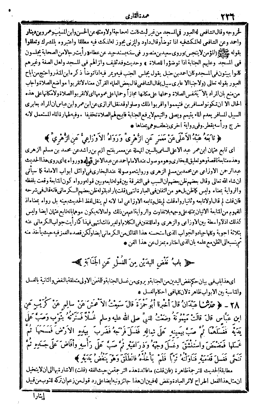 لِخُرُوجِهِ وَقَالَ الشَّافِعِي لَهُ العبور فِي الْمَسْجِد من غير لبث كَانَت لَهُ حَاجَة أَو لَا وَمثله عَن الْحسن وَابْن الْمسيب وَعَمْرو بن دِينَار وَأحمد وَعَن الشَّافِعِي لَهُ الْمكْث فِيهِ إِذا تَوَضَّأ وَقَالَ دَاوُد والمزني يجوز لَهُ الْمكْث فِيهِ مُطلقًا واعتبره بالمشرك وتعلقوا بقوله - صَلَّى اللَّهُ عَلَيْهِ وَسَلَّم َ - (الْمُؤمن لَا ينجس) وروى سعيد بن مَنْصُور فِي سنَنه بِسَنَد جيد عَن عَطاء " رَأَيْت رجَالًا من الصَّحَابَة يَجْلِسُونَ فِي الْمَسْجِد وَعَلَيْهِم الْجَنَابَة إِذا توضؤوا للصَّلَاة " وَحَدِيث وَفد ثَقِيف وَإِنْزَالهمْ فِي الْمَسْجِد وَأهل الصّفة وَغَيرهم كَانُوا يبيتُونَ فِي الْمَسْجِد وَكَانَ أَحْمد بن حَنْبَل يَقُول يجلس الْجنب فِيهِ ويمر فِيهِ إِذا تَوَضَّأ ذكره ابْن الْمُنْذر وَاحْتج من أَبَاحَ العبور بقوله تَعَالَى {وَلَا جنبا إِلَّا عابري سَبِيل} قَالَ الشَّافِعِي قَالَ بعض الْعلمَاء الْقُرْآن مَعْنَاهُ لَا تقربُوا مَوَاضِع الصَّلَاة وَأجَاب من منع بِأَن المُرَاد بِالْآيَةِ نفس الصَّلَاة وَحملهَا على مَكَانهَا مجَازًا وَحملهَا على عمومها أَي لَا تقربُوا الصَّلَاة وَلَا مَكَانهَا على هَذِه الْحَال إِلَّا أَن تَكُونُوا مسافرين فَتَيَمَّمُوا وأقربوا ذَلِك وصلوا وَقد نقل الرَّازِيّ عَن ابْن عمر وَابْن عَبَّاس أَن المُرَاد بعابري السَّبِيل الْمُسَافِر يعْدم المَاء يتَيَمَّم وَيُصلي وَالتَّيَمُّم لَا يرفع الْجَنَابَة فأبيح لَهُم الصَّلَاة تَخْفِيفًا. وَفِي طَهَارَة المَاء الْمُسْتَعْمل لِأَنَّهُ خرج وَرَأسه يقطر. وَفِي رِوَايَة أُخْرَى ينطف وَهِي بمعناها