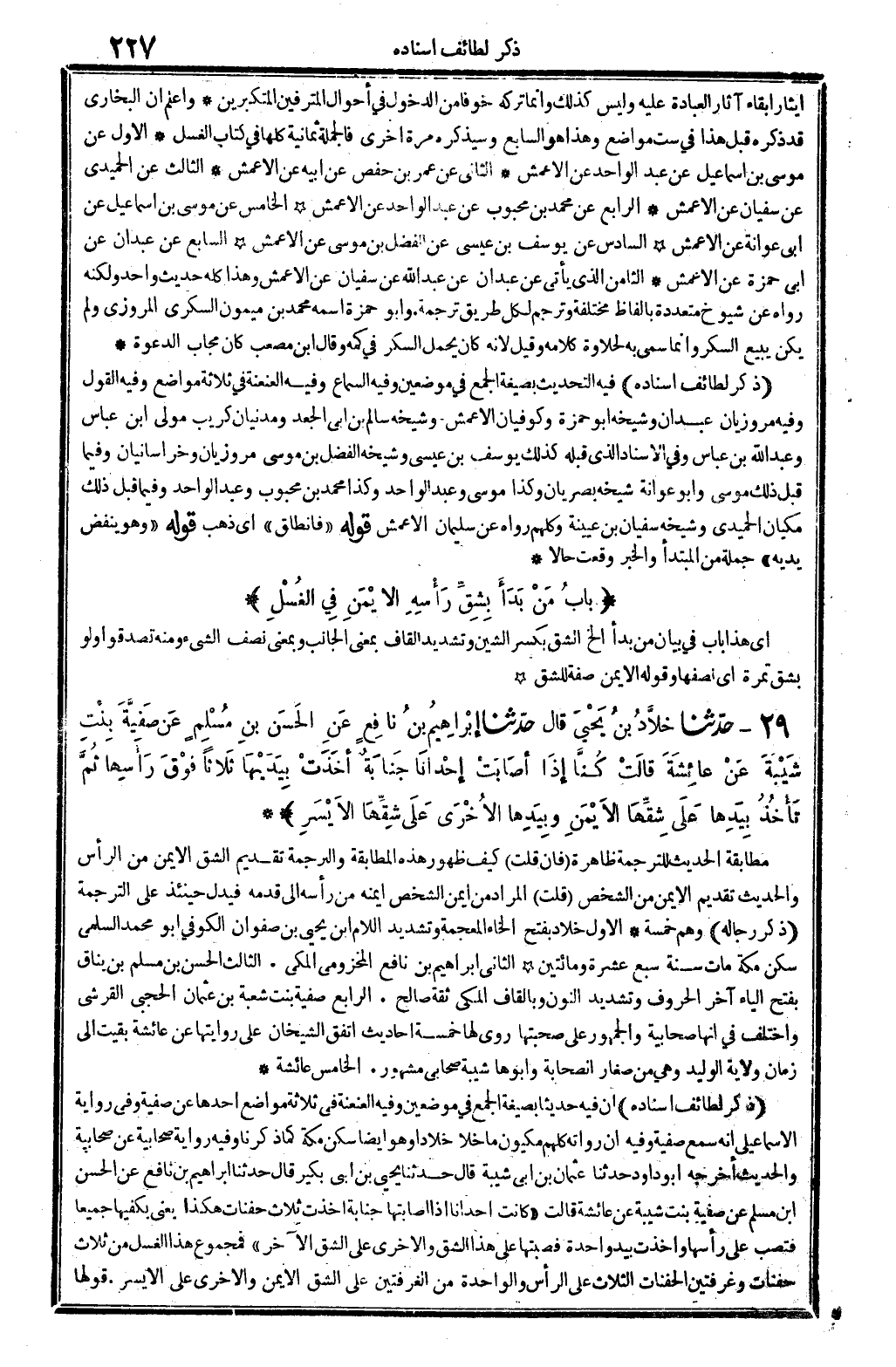 ذكر لطائف إِسْنَاده فِيهِ: التحديث بِصِيغَة الْجمع فِي موضِعين، وَفِيه: السماع. وَفِيه: العنعنة فِي ثَلَاثَة مَوَاضِع. وَفِيه: القَوْل. وَفِيه: مروزيان، عَبْدَانِ وَشَيْخه أَبُو حَمْزَة، وكوفيان الْأَعْمَش وَشَيْخه سَالم بن أبي الْجَعْد ومدنيان: كريب مولى ابْن عَبَّاس وَعبد الله بن عَبَّاس وَفِي الْإِسْنَاد الَّذِي قبله كَذَلِك: يُوسُف بن عِيسَى وَشَيْخه الْفضل بن مُوسَى مروزيان وخراسانيان، وَفِيمَا قبل ذَلِك، مُوسَى وَأَبُو عوَانَة شَيْخه بصريان، وَكَذَا مُوسَى وَعبد الْوَاحِد، وَكَذَا مُحَمَّد بن مَحْبُوب وَعبد الْوَاحِد، وَفِيمَا قبل ذَلِك: مكيان الْحميدِي وَشَيخ سُفْيَان بن عُيَيْنَة، وَكلهمْ رَوَاهُ عَن سُلَيْمَان الْأَعْمَش.