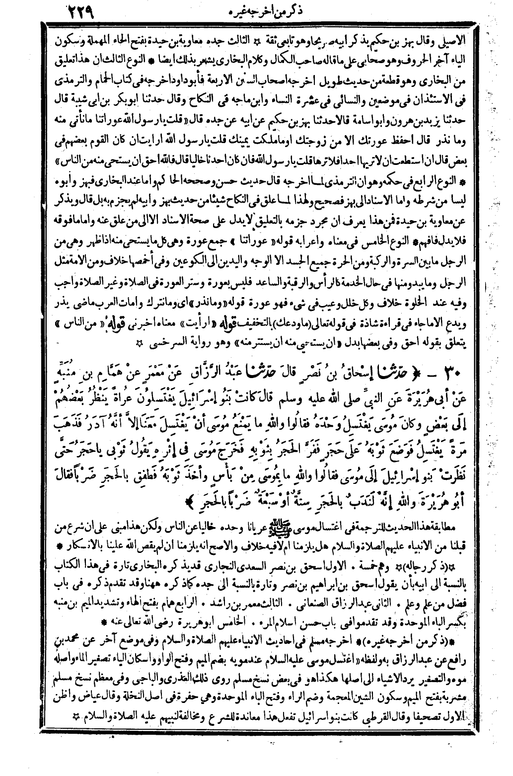 278 - حدّثنا إسْحَاقُ بنُ نَصْرٍ قالَ حدّثنا عَبْدُ الرَّزَّاقِ عَنْ مَعْمَرِ عَنْ هَمَّامِ بنِ مُنَبَّهٍ عَنْ أبِي هُرَيْرَةَ عَنِ النَّبيِّ صلى الله عَلَيْهِ وَسلم قالَ كَانَتْ بَنُوا إسْرَائِيلَ يَغْتَسِلُونَ عُرَاةً يَنْظُرُ بَعْضُهُمْ إلَى بَعْضٍ وَكَانَ مُوسَى يَغْتَسِلُ وَحْدَهُ فقالُوا واللَّهِ مَا يَمْنَعُ مُوسَى أنْ يَغْتَسِلَ مَعْنَا إلاَّ أنَّهُ فَذَهَبَ مَرَّةً يَغْتَسِلُ فَوَضَعَ ثَوْبَهُ عَلَى حَجَرٍ فَفَرَّ الحَجَرُ بِثَّوْبِهِ فَخَرَجَ مُوسَى فِي إثْرِهِ يَقُولُ ثَوْبِي يَا حَجَرُ حَتَّى نَظَرتْ بَنُو إسْرَائِيلَ إلَى مُوسَى فقالُوا واللَّهِ مَا بِمُوسَى مِنْ بَأْسٍ وَأَخَذَ ثَوْبِهِ فَطَفِق بالحَجَرِ ضَرْباً فقالَ أَبُو هُرَيْرَةَ واللَّهِ إنَّهُ لَنَدَبٌ بالحَجَرِ سِتَّةٌ أَوْ سَبْعَةٌ ضَرْباً بِالْحَجَرِ.