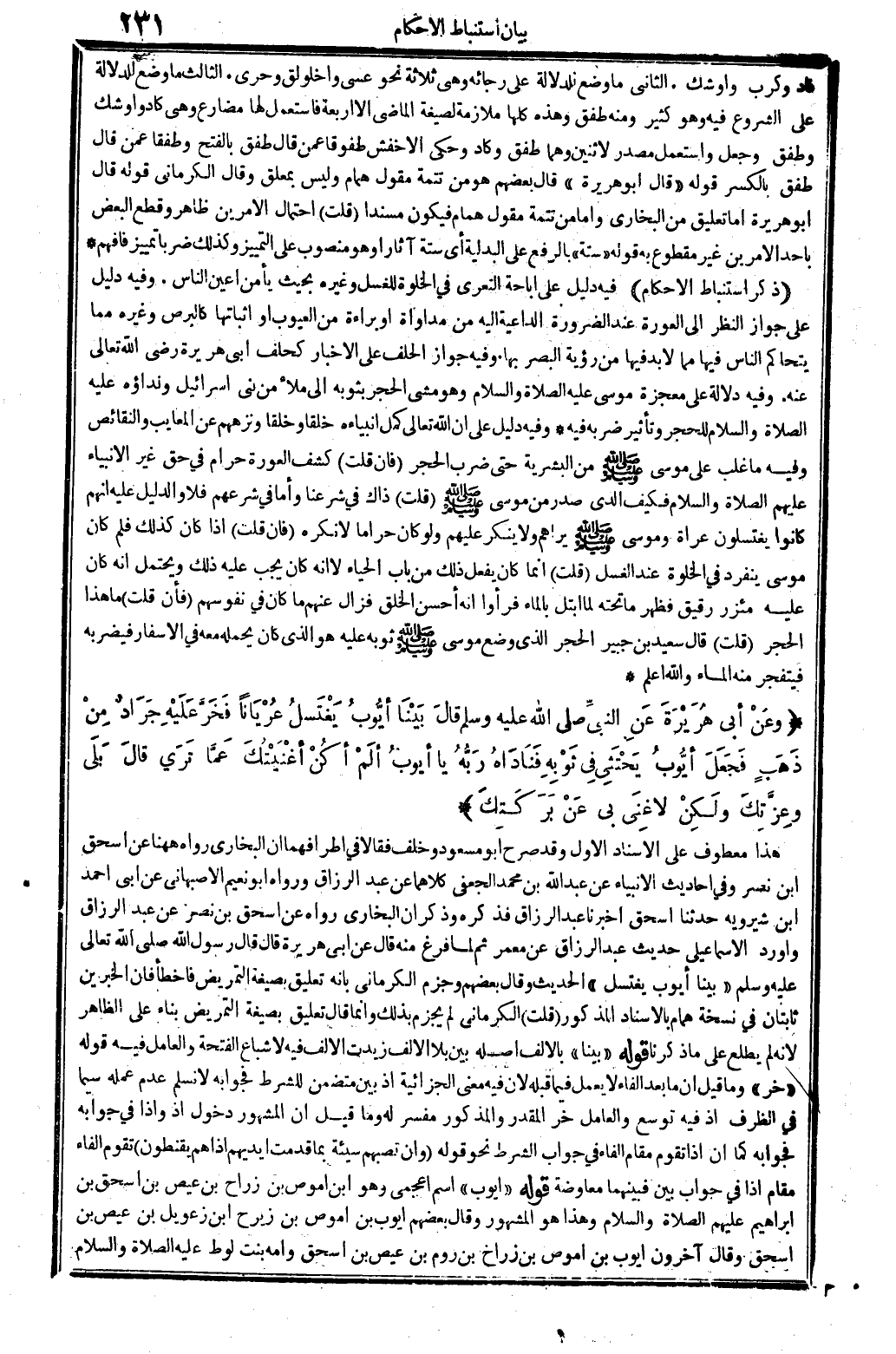 (وَعَن أبي هُرَيْرَة عَن النَّبِي - صَلَّى اللَّهُ عَلَيْهِ وَسَلَّم َ - قَالَ بَينا أَيُّوب يغْتَسل عُريَانا فَخر عَلَيْهِ جَراد من ذهب فَجعل أَيُّوب يحتثي فِي ثَوْبه فناداه ربه يَا أَيُّوب ألم أكن أغنيتك عَمَّا ترى قَالَ بلَى وَعزَّتك وَلَكِن لَا غنى بِي عَن بركتك) هَذَا مَعْطُوف على الْإِسْنَاد الأول وَقد صرح أَبُو مَسْعُود وَخلف فَقَالَا فِي أطرافهما أَن البُخَارِيّ رَوَاهُ هَهُنَا عَن اسحق بن نصر وَفِي أَحَادِيث الْأَنْبِيَاء عَن عبد الله بن مُحَمَّد الْجعْفِيّ كِلَاهُمَا عَن عبد الرَّزَّاق وَرَوَاهُ أَبُو نعيم الْأَصْبَهَانِيّ عَن أبي أَحْمد بِهن شيرويه حَدثنَا اسحق أخبرنَا عبد الرَّزَّاق فَذكره وَذكر أَن البُخَارِيّ رَوَاهُ عَن اسحق بن نصر عَن عبد الرَّزَّاق وَأورد الْإِسْمَاعِيلِيّ حَدِيث عبد الرَّزَّاق عَن معمر ثمَّ لما فرغ مِنْهُ قَالَ عَن أبي هُرَيْرَة قَالَ قَالَ رَسُول الله - صَلَّى اللَّهُ عَلَيْهِ وَسَلَّم َ - " بَينا أَيُّوب يغْتَسل " الحَدِيث وَقَالَ بَعضهم وَجزم الْكرْمَانِي بِأَنَّهُ تَعْلِيق بِصِيغَة التمريض فَأَخْطَأَ فَإِن الْخَبَرَيْنِ ثابتان فِي نُسْخَة همام بِالْإِسْنَادِ الْمَذْكُور (قلت) الْكرْمَانِي لم يجْزم بذلك وَإِنَّمَا قَالَ تَعْلِيق بِصِيغَة التمريض بِنَاء على الظَّاهِر لِأَنَّهُ لم يطلع على مَا ذكرنَا قَوْله " بَينا " بِالْألف أَصله بَين بِلَا الْألف زيدت الْألف فِيهِ لإشباع الفتحة وَالْعَامِل فِيهِ قَوْله " خر " وَمَا قيل أَن مَا بعد الْفَاء لَا يعْمل فِيمَا قبله لِأَن فِيهِ معنى الجزائية إِذْ بَين مُتَضَمّن للشّرط فَجَوَابه لَا نسلم عدم عمله سِيمَا فِي الظّرْف إِذْ فِيهِ توسع وَالْعَامِل خر الْمُقدر وَالْمَذْكُور مُفَسّر لَهُ وَمَا قيل أَن الْمَشْهُور دُخُول إِذا وَإِذا فِي جَوَابه فَجَوَابه كَمَا أَن إِذا تقوم مقَام الْفَاء فِي جَوَاب الشَّرْط نَحْو قَوْله {وَإِن تصبهم سَيِّئَة بِمَا قدمت أَيْديهم إِذا هم يقنطون} تقوم الْفَاء مقَام إِذا فِي جَوَاب بَين فبينهما مُعَاوضَة قَوْله " أَيُّوب " اسْم أعجمي وَهُوَ ابْن أموص بن زراح بن عيص بن اسحق بن إِبْرَاهِيم عَلَيْهِم الصَّلَاة وَالسَّلَام وَهَذَا هُوَ الْمَشْهُور وَقَالَ بَعضهم أَيُّوب بن أموص بن زيرح ابْن زعويل بن عيص بن اسحق وَقَالَ آخَرُونَ أَيُّوب بن أموص بن زراح بن روم بن عيص بن اسحق وَأمه بنت لوط عَلَيْهِ الصَّلَاة وَالسَّلَام