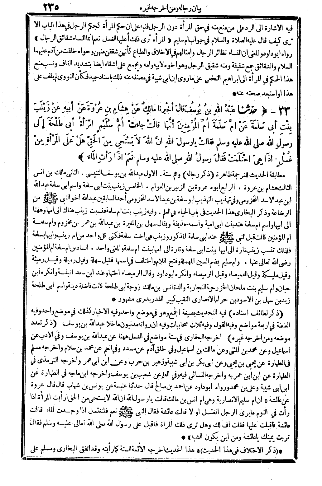 ذكر رِجَاله وهم سِتَّة: الأول: عبد اللهبن يُوسُف التنيسِي. الثَّانِي: مَالك بن أنس. الثَّالِث: هِشَام بن عُرْوَة. الرَّابِع: أَبوهُ عُرْوَة بن الزبير بن الْعَوام. الْخَامِس: زَيْنَب بنت أبي سَلمَة، وَاسم أبي سَلمَة عبد الله بن عبد الْأسد المَخْزُومِي، وَفِي (تَهْذِيب التَّهْذِيب) أَبُو سَلمَة بن عبد الْأسد المَخْزُومِي أحد السَّابِقين عبد الله أَخُو النَّبِي صلى الله عَلَيْهِ وَسلم من الرضَاعَة، وَذكر البُخَارِيّ هَذَا الحَدِيث فِي بَاب الْحيَاء فِي الْعلم. وَفِيه زَيْنَب بنت أم سَلمَة، فنسبت زَيْنَب هُنَاكَ إِلَى أمهَا، وهاهناإلى أَبِيهَا وَاسم أم سَلمَة: هِنْد بنت أبي أُميَّة، واسْمه حُذَيْفَة وَيُقَال: سهل بن المغير بن عبد الله بن عمر بن مَخْزُوم، وَأم سَلمَة أم الْمُؤمنِينَ، كَانَت قبل النَّبِي صلى الله عَلَيْهِ وَسلم عِنْد أبي سَلمَة الْمَذْكُور، وَزَيْنَب هِيَ أُخْت سَلمَة، فكنى كل وَاحِد من أم زينتب وأبيها بسلمة، فَلذَلِك تنْسب زَيْنَب تَارَة إِلَى أَبِيهَا ببنت أبي سَلمَة، وَتارَة إِلَى أمهَا ببنت أم سَلمَة، وَالْمعْنَى وَاحِد. السَّادِس: أم سَلمَة، أم الْمُؤمنِينَ، رَضِي الله تَعَالَى عَنْهَا. وَأم سليم، بِضَم السِّين الْمُهْملَة وَفتح اللَّام، وَاخْتلف فِي اسْمهَا، فَقيل: سهلة، وَقيل: رميلة، وَقيل رميثة وَقيل: مليكَة، وَقيل: الغميصاء، وَقيل: الرميصاء، وَأنْكرهُ أَبُو دَاوُد، وَقَالَ الرميصاء أُخْتهَا، وَعند ابْن سعد، أنيفة، وَأنْكرهُ ابْن حبَان، وَأم سليم بنت ملْحَان الخزرجية النجارية، وَالِدَة أنس بن مَالك زَوْجَة أبي طَلْحَة، كَانَت فاضلة دينة، وَاسم أبي طَلْحَة، زيد بن سهل بن الْأسود بن حرَام الْأنْصَارِيّ، النَّقِيب، كَبِير الْقدر، بَدْرِي مَشْهُور.