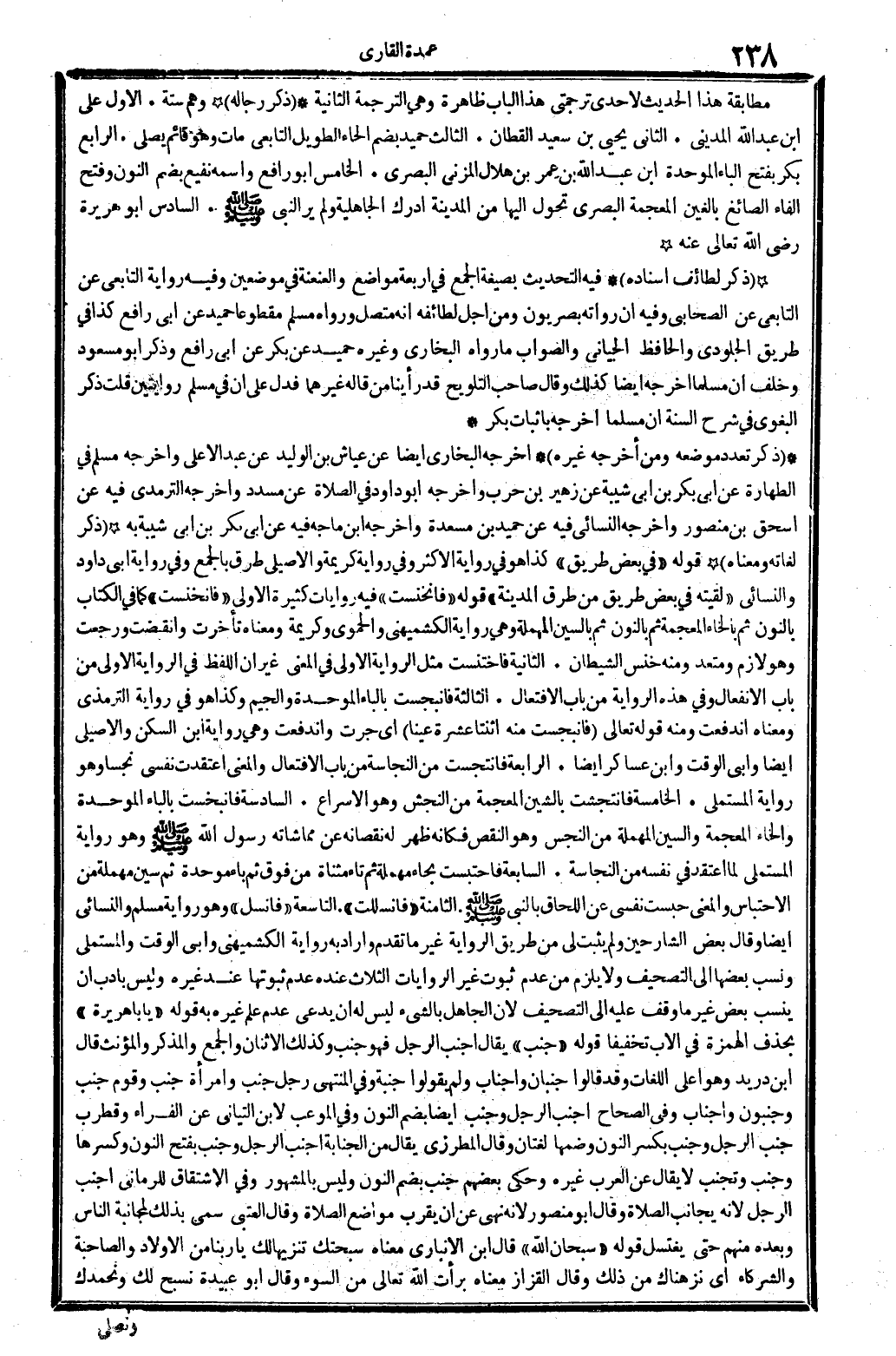 ذكر لغاته وَمَعْنَاهُ قَوْله (فِي بعض طَرِيق) كَذَا هُوَ فِي رِوَايَة الْأَكْثَر، وَفِي رِوَايَة كَرِيمَة والأصيلي. طرق: بِالْجمعِ وَفِي رِوَايَة أبي دَاوُد وَالنَّسَائِيّ: (لَقيته فِي بعض طَرِيق من طرق الْمَدِينَة) قَوْله: (فانخنست) فِيهِ رِوَايَات كَثِيرَة. الأولى: (فانخنست) كَمَا فِي الْكتاب بالنُّون ثمَّ بِالْخَاءِ الْمُعْجَمَة ثمَّ بالنُّون ثمَّ بِالسِّين الْمُهْملَة، وَهِي رِوَايَة الْكشميهني والحموي وكريمة. وَمَعْنَاهُ تَأَخَّرت وأنقبضت وَرجعت، وَهُوَ لَازم ومتعد، وَمِنْه خنس الشَّيْطَان. الثَّانِيَة: فاختنست، مثل الرِّوَايَة الأولى فِي الْمَعْنى، غير أَن اللَّفْظ فِي الرِّوَايَة الأولى من بَاب الانفعال، وَفِي هَذِه الرِّوَايَة من بَاب الافتعال. الثَّالِثَة: فانبجست، بِالْبَاء الْمُوَحدَة وَالْجِيم، وَكَذَا هُوَ فِي رِوَايَة التِّرْمِذِيّ، وَمَعْنَاهُ اندفعت وَمِنْه قَوْله تَعَالَى: {فانبجست مِنْهُ اثْنَتَا عشرَة عينا} (سُورَة الْأَعْرَاف: 16) أَي: جرت واندفعت، وَهِي رِوَايَة ابْن السكن والأصيلي أَيْضا وَأبي الْوَقْت وَابْن عَسَاكِر أَيْضا. الرَّابِعَة: فانتجست، من النَّجَاسَة من بَاب الافتعال، وَالْمعْنَى: اعتقدت نَفسِي نجسا وَهُوَ رِوَايَة الْمُسْتَمْلِي. الْخَامِسَة: فانتجشت، بالشين الْمُعْجَمَة، من النجش، وَهُوَ الْإِسْرَاع. السَّادِسَة: فانبخست، بِالْبَاء الْمُوَحدَة وَالْخَاء الْمُعْجَمَة وَالسِّين الْمُهْملَة من النخس، وَهُوَ النَّقْص، فَكَأَنَّهُ ظهر لَهُ نقصانه عَن مماشاته رَسُول الله صلى الله عَلَيْهِ وَسلم، وَهُوَ رِوَايَة المتسملي لما اعْتقد فِي نَفسه من النَّجَاسَة. السَّابِعَة: فاحتبست، نحاء مُهْملَة ثمَّ تَاء مثناة من فَوق ثمَّ بَاء مُوَحدَة ثمَّ سين مُهْملَة، من الاحتباس، وَالْمعْنَى: حبست نَفسِي عَن اللحاق بِالنَّبِيِّ صلى الله عَلَيْهِ وَسلم. الثَّامِنَة: (فانسللت) . التَّاسِعَة: (فانسل) ، وَهُوَ رِوَايَة مُسلم وَالنَّسَائِيّ أَيْضا. وَقَالَ بعض الشَّارِحين: وَلم يثبت لي من طَرِيق الرِّوَايَة غير مَا تقدم، وَأَرَادَ بِهِ رِوَايَة الْكشميهني وَأبي الْوَقْت وَالْمُسْتَمْلِي، وَنسب بَعْضهَا إِلَى التَّصْحِيف، وَلَا يلْزم من عدم ثُبُوت غير الرِّوَايَات الثَّلَاث عِنْده عدم ثُبُوتهَا عِنْد غَيره، وَلَيْسَ بأدب أَن ينْسب بعض غير مَا وقف عَلَيْهِ إِلَى التَّصْحِيف، لِأَن الْجَاهِل بالشَّيْء لَيْسَ لَهُ أَن يَدعِي عدم علم غَيره بِهِ. قَوْله: (يَا با هُرَيْرَة) بِحَذْف الْهمزَة فِي الْأَب تَخْفِيفًا. قَوْله: (جنب) يُقَال: أجنب الرجل فَهُوَ جنب، وَكَذَلِكَ الإثنان وَالْجمع والمذكر والمؤنث، قَالَ ابْن دُرَيْد، وَهُوَ أَعلَى اللُّغَات، وَقد قَالُوا: جنبان وأجناب، وَلم يَقُولُوا: جنبة، وَفِي (الْمُنْتَهى) رجل جنب وَامْرَأَة جنب وَقوم جنب وجنبو وأجناب، وَفِي (الصِّحَاح) أجنب الرجل وجنب أَيْضا، بِضَم النُّون. وَفِي (الموعب) لِابْنِ التياني عَن الْفراء وقطرب جنب الرجل وجنب بسكر النُّون وَضمّهَا، لُغَتَانِ. وَقَالَ المطرزي: يُقَال: من الْجَنَابَة أجنب الرجل وجنب بِفَتْح النُّون وَكسرهَا، وجنب وتجنب، لَا يُقَال عَن الْعَرَب غَيره وَحكى بَعضهم: جنب بِضَم النُّون، وَلَيْسَ بالمشهور. وَفِي (الِاشْتِقَاق) للرماني: وأجنب الرجل لِأَنَّهُ يجانب الصَّلَاة. وَقَالَ أَبُو مَنْصُور: لِأَنَّهُ نهى عَن أَن يقرب مَوَاضِع الصَّلَاة وَقَالَ الْعُتْبِي: سمي بذلك لمجانبة النَّاس وَبعده مِنْهُم، حَتَّى يغْتَسل. قَوْله: (سُبْحَانَ الله) قَالَ ابْن الْأَنْبَارِي مَعْنَاهُ: سبحتك تَنْزِيها لَك يَا رَبنَا من الْأَوْلَاد والصاحبة والشركاء، أَي: نزهناك من ذَلِك. وَقَالَ الْقَزاز: مَعْنَاهُ: برأت الله تَعَالَى من السوء، وَقَالَ أَبُو عُبَيْدَة: نُسَبِّح لَك بحَمْدك