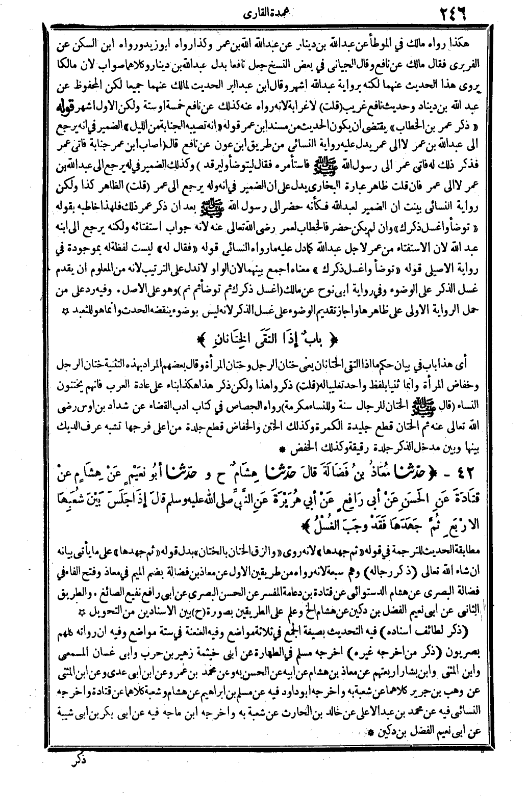 هَكَذَا رَوَاهُ مَالك فِي (الْمُوَطَّأ) عَن عبد الله بن دِينَار عَن عبد الله بن عمر، وَكَذَا رَوَاهُ أَبُو زيد، وَرَوَاهُ ابْن السكن عَن الْفربرِي فَقَالَ مَالك عَن نَافِع، وَقَالَ: الجياني فِي بعض النّسخ، جعل نَافِعًا بدل عبد الله بن دِينَار، وَكِلَاهُمَا صَوَاب، لِأَن مَالِكًا يروي هَذَا الحَدِيث عَنْهُمَا. لكنه بروايه عبد الله أشهر وَقَالَ ابْن عبد الْبر، الحَدِيث لمَالِك عَنْهُمَا جَمِيعًا، لَكِن الْمَحْفُوظ عَن عبد الله بن دِينَار، وَحَدِيث نَافِع غَرِيب. قلت: لَا غرابة، لِأَنَّهُ رَوَاهُ عَنهُ كَذَلِك عَن نَافِع خَمْسَة أَو سِتَّة، وَلكنه الأول أشهر. قَوْله: (ذكر عمر بن الْخطاب) يَقْتَضِي أَن يكون الحَدِيث من مُسْند ابْن عمر قَوْله: (أَنه تصيبه الْجَنَابَة من اللَّيْل) الضَّمِير فِي أَنه يرجع إِلَى عبد الله بن عمر لَا إِلَى عمر يدل عَلَيْهِ رِوَايَة النَّسَائِيّ من طَرِيق ابْن عون عَن نَافِع قَالَ: [حم (أصَاب ابْن عمر جَنَابَة فَأتى عمر فَذكر ذَلِك لَهُ فَأتى عمر إِلَى رَسُول الله صلى الله عَلَيْهِ وَسلم فاستأمره فَقَالَ: ليتوضأ وليرقد) [/ حم وَكَذَلِكَ الضَّمِير فِي لَهُ، يرجع إِلَى عبد الله بن عمر لَا إِلَى عمر. فَإِن قلت: ظَاهر عبارَة البُخَارِيّ يدل على أَن الضَّمِير فِي أَنه وَله يرجع إِلَى عمر. قلت: الظَّاهِر كَذَا، وَلَكِن رِوَايَة النَّسَائِيّ بيّنت أَن الضَّمِير لعبد الله، فَكَأَنَّهُ حضر إِلَى رَسُول الله صلى الله عَلَيْهِ وَسلم بعد أَن ذكر عمر ذَلِك، فَلهَذَا خاطبه بقوله: (تَوَضَّأ واغسل ذكرك) وَإِن لم يكن حضر فالخطاب لعمر، رَضِي الله تَعَالَى عَنهُ، لِأَنَّهُ جَوَاب استفتائه، وَلكنه يرجع إِلَى ابْنه عبد الله لِأَن الاستفتاء من عمر لأجل عبد الله كَمَا دلّ عَلَيْهِ مَا رَوَاهُ النَّسَائِيّ قَوْله: (فَقَالَ لَهُ) لَيست لَفْظَة لَهُ بموجودة فِي رِوَايَة الْأصيلِيّ قَوْله: (تَوَضَّأ واغسل ذكرك) مَعْنَاهُ إجمع بَينهمَا لِأَن الْوَاو وَلَا تدل على التَّرْتِيب لِأَنَّهُ من الْمَعْلُوم أَن يقدم غسل الذّكر على الْوضُوء وَفِي رِوَايَة أبي نوح عَن مَالك: اغسل ذكرك ثمَّ تَوَضَّأ ثمَّ نم وَهُوَ على الأَصْل.