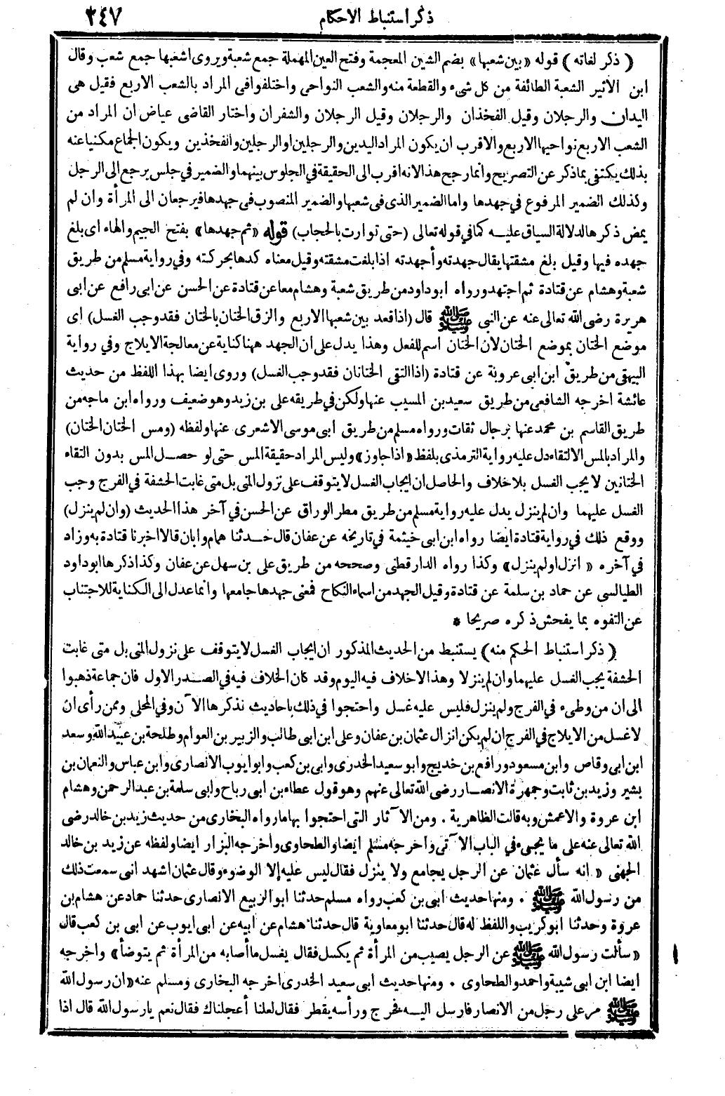 ذكر لغاته قَوْله: (بَين شعبها) بِضَم الشين الْمُعْجَمَة وَفتح الْعين الْمُهْملَة جمع شُعْبَة، ويروي: أشعبها، جمع شعب، وَقَالَ ابْن الْأَثِير: الشعبة الطَّائِفَة من كل شَيْء، والقطعة مِنْهُ والشعب، النواحي، وَاخْتلفُوا فِي المُرَاد بِالشعبِ الْأَرْبَع، فَقيل: هِيَ اليدان وَالرجلَانِ، وَقيل: الفخذان وَالرجلَانِ، وَقيل: الرّجلَانِ والشفران، وَاخْتَارَ القَاضِي عِيَاض، أَن المُرَاد من الشّعب الْأَرْبَع واحيها الْأَرْبَع، وَالْأَقْرَب أَن يكون المُرَاد الْيَدَيْنِ وَالرّجلَيْنِ أَو الرجلَيْن والفخذين وَيكون الْجِمَاع مكنياً عَنهُ بذلك، يَكْتَفِي بِمَا ذكر عَن التَّصْرِيح، وَإِنَّمَا رجح هَذَا لِأَنَّهُ أقرب إِلَى الْحَقِيقَة فِي الْجُلُوس بَينهمَا، وَالضَّمِير فِي جلس، يرجع إِلَى الرجل، وَكَذَلِكَ الضَّمِير الْمَرْفُوع فِي: جهدها، وَأما الضَّمِير الَّذِي فِي شعبها، وَالضَّمِير الْمَنْصُوب فِي: جهدهاد، فيرجعان إِلَى الْمَرْأَة، وَإِن لم يمض ذكرهَا الدّلَالَة السِّيَاق عَلَيْهِ كَمَا فِي قَوْله تَعَالَى: {حَتَّى تَوَارَتْ بالحجاب} (سُورَة ص: 32) قَوْله: (ثمَّ جهدها) بِفَتْح الْجِيم وَالْهَاء أَي: بلغ جهده فِيهَا وَقيل: بلغ مشقتها يُقَال: جهدته وأجهدته إِذا بلغت مشقته، وَقيل: مَعْنَاهُ كدها بحركته وَفِي رِوَايَة مُسلم من طَرِيق شُعْبَة وَهِشَام عَن قَتَادَة ثمَّ اجْتهد، وَرَوَاهُ أَبُو دَاوُد من طَرِيق شُعْبَة وَهِشَام مَعًا عَن قَتَادَة عَن الْحسن عَن أبي رَافع عَن أبي هُرَيْرَة، رَضِي الله تَعَالَى عَنهُ، عَن النَّبِي صلى الله عَلَيْهِ وَسلم قَالَ: (إِذا قعد بَين شعبها الْأَرْبَع، وألزق الْخِتَان بالختان فقد وَجب الْغسْل) أَي: مَوضِع الْخِتَان بِموضع الْخِتَان، لِأَن الْخِتَان اسْم للْفِعْل، وَهَذَا يدل على أَن الْجهد هَاهُنَا كِنَايَة عَن معالجة الْإِيلَاج، وَفِي رِوَايَة الْبَيْهَقِيّ من طَرِيق ابْن أبي عرُوبَة عَن قَتَادَة (إِذا التقى الختانان فقد وَجب الْغسْل) وَرُوِيَ أَيْضا بِهَذَا اللَّفْظ من حَدِيث عَائِشَة، أخرجه الشَّافِعِي من طَرِيق سعيد بن الْمسيب عَنْهَا، وَلَكِن فِي طَريقَة عَليّ بن زيد، وَهُوَ ضَعِيف وَرَوَاهُ ابْن مَاجَه من طَرِيق الْقَاسِم بن مُحَمَّد عَنْهَا بِرِجَال ثِقَات، رَوَاهُ مُسلم من طَرِيق أبي مُوسَى الْأَشْعَرِيّ عَنْهَا، وَلَفظه: (وسم الْخِتَان الْخِتَان) وَالْمرَاد بالمس، الالتقاء عَلَيْهِ رِوَايَة التِّرْمِذِيّ بِلَفْظ: (إِذا جَاوز) وَلَيْسَ المُرَاد حَقِيقَة الْمس، حَتَّى لَو حصل الْمس بِدُونِ التقاء الختانين لَا يجب الْغسْل بِلَا خلاف، وَالْحَاصِل أَن إِيجَاب الْغسْل لَا يتَوَقَّف على نزُول الْمَنِيّ، بل مَتى غَابَتْ الْحَشَفَة فِي الْفرج وَجب الْغسْل عَلَيْهِمَا، وَإِن لم ينزل يدل عَلَيْهِ رِوَايَة مُسلم من طَرِيق مطر الْوراق عَن الْحسن فِي آخر هَذَا الحَدِيث: (وَإِن لم ينزل) وَوَقع ذَلِك فِي رِوَايَة قَتَادَة أَيْضا، رَوَاهُ ابْن أبي خَيْثَمَة فِي (تَارِيخه) عَن عَفَّان قَالَ: حَدثنَا همام وَأَبَان قَالَا أخبرنَا قَتَادَة بِهِ وَزَاد فِي آخِره: (أنزل أَو لم ينزل) ، وَكَذَا رَوَاهُ الدَّارَقُطْنِيّ وَصَححهُ من طَرِيق عَليّ بن سهل عَن عَفَّان، وَكَذَا ذكرهَا أَبُو دَاوُد الطَّيَالِسِيّ عَن حَمَّاد بن سَلمَة عَن قَتَادَة، وَقيل: الْجهد من أَسمَاء النِّكَاح، فَمَعْنَى جهدها جَامعهَا، وَإِنَّمَا عدل إِلَى الْكِنَايَة للاجتناب عَن التفوه بِمَا يفحش ذكره صَرِيحًا.