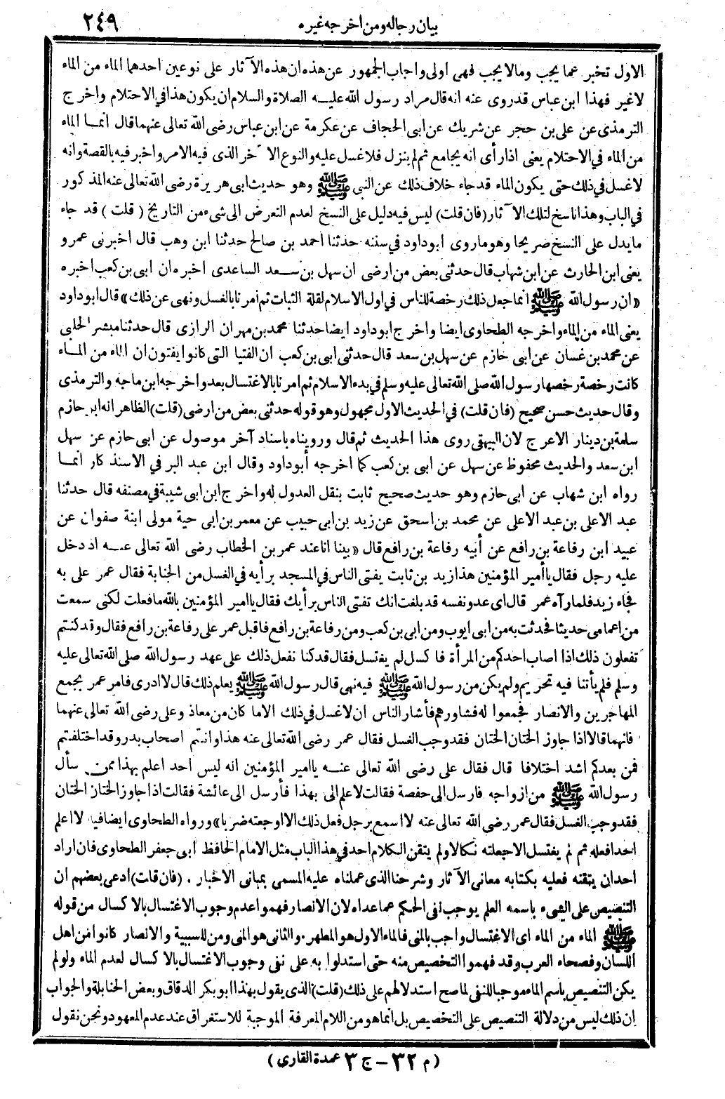 وَأجَاب الْجُمْهُور عَن هَذِه أَن هَذِه الْآثَار على نَوْعَيْنِ: أَحدهمَا: المَاء من المَاء، لَا غَيره فَهَذَا ابْن عَبَّاس قد روى عَنهُ أَنه قَالَ: مُرَاد رَسُول الله عَلَيْهِ الصَّلَاة وَالسَّلَام أَن يكون هَذَا فِي الِاحْتِلَام، وَأخرج التِّرْمِذِيّ عَن عَليّ بن حجر عَن شريك عَن أبي الْحجاب عَن عِكْرِمَة عَن ابْن عَبَّاس رَضِي الله تَعَالَى عَنْهُمَا، قَالَ: إِنَّمَا المَاء من المَاء فِي الِاحْتِلَام، يَعْنِي إِذا رأى أَنه يُجَامع ثمَّ ينزل فَلَا غسل عَلَيْهِ، وَالنَّوْع الآخر: الَّذِي فِيهِ الْأَمر، وَأخْبر فِيهِ الْقِصَّة، وَأَنه: لَا غل فِي ذَلِك حَتَّى يكون المَاء، قد جَاءَ خلاف ذَلِك عَن النَّبِي صلى الله عَلَيْهِ وَسلم وَهُوَ حَدِيث أبي هُرَيْرَة رَضِي الله تَعَالَى عَنهُ الْمَذْكُور فِي الْبَاب، وَهَذَا نَاسخ لتِلْك الْآثَار. فَإِن قتل: لَيْسَ فِيهِ دَلِيل على النّسخ لعدم التَّعَرُّض إِلَى شَيْء من التَّارِيخ. قلت: قد جَاءَ مَا يدل على النّسخ صَرِيحًا وَهُوَ مَا روى أَبُو دَاوُد فِي (سنَنه) حَدثنَا أَحْمد بن صَالح حَدثنَا ابْن وهب، قَالَ: أَخْبرنِي عَمْرو يَعْنِي بن الحاري عَن ابْن شهَاب، قَالَ: حَدثنِي بعض من أرضي: أَن سهل بن سعد السَّاعِدِيّ أخبرهُ أَن أبي بن كَعْب أخبرهُ: (أَن رَسُول الله صلى الله عَلَيْهِ وَسلم إِنَّمَا جعل ذَلِك رخصَة للنَّاس فِي أول الْإِسْلَام لقلَّة الثَّبَات ثمَّ أمرنَا بِالْغسْلِ، وَنهى عَن ذَلِك) قَالَ أَبُو دَاوُد: يَعْنِي المَاء من المَاء، وَأخرجه الطَّحَاوِيّ أَيْضا، وَأخرج أَبُو دَاوُد أَيْضا حَدثنَا مُحَمَّد بن مهْرَان الرَّازِيّ، قَالَ: حَدثنَا مُبشر الْحلَبِي عَن مُحَمَّد بن غَسَّان عَن أبي حَازِم عَن سهل بن سعد. قَالَ: حَدثنِي أبي بن كَعْب أَن الْفتيا الَّتِي كَانُوا يفتون إِن المَاء من المَاء، كَانَت رخصَة رخصها رَسُول الله صلى الله عَلَيْهِ وَسلم فِي بَدْء الْإِسْلَام ثمَّ أمرنَا بالاغتسال بعد، وَأخرجه ابْن مَاجَه وَالتِّرْمِذِيّ وَقَالَ: حَدِيث حسن صَحِيح، فَإِن قلت: فِي الحَدِيث الأول مَجْهُول وَهُوَ قَوْله: حَدثنِي بعض من أرضي. قلت: الظَّاهِر أَنه أَبُو حَازِم سَلمَة بن دِينَار الْأَعْرَج لِأَن الْبَيْهَقِيّ روى هَذَا الحَدِيث. ثمَّ قَالَ: روينَاهُ بِإِسْنَاد آخر مَوْصُول عَن أبي حَازِم عَن سهل ابْن سعد، والْحَدِيث مَحْفُوظ عَن سهل عَن أبي بن كَعْب كَمَا أخرجه أَبُو دَاوُد. وَقَالَ ابْن عبد الْبر فِي (الأستذكار) إِنَّمَا رَوَاهُ ابْن شهَاب عَن أبي حَازِم، وَهُوَ حَدِيث صَحِيح ثَابت بِنَقْل الْعُدُول لَهُ وَأخرج ابْن أبي شيبَة فِي (مُصَنفه) قَالَ: حَدثنَا عبد الْأَعْلَى بن عبد الْأَعْلَى عَن مُحَمَّد بن إِسْحَاق عَن زيد بن أبي حبيب عَن معمر بن أبي حَيَّة، مولى ابْنة صَفْوَان، عَن عبيد بن رِفَاعَة بن رَافع عَن أَبِيه رِفَاعَة بن رَافع، قَالَ: (بَينا أَنا عِنْد عمر بن الْخطاب، رَضِي الله تَعَالَى عَنهُ، إِذْ دخل عَلَيْهِ رجل فَقَالَ: يَا أَمِير الْمُؤمنِينَ، هَذَا زيد بن ثَابت يُفْتِي النَّاس فِي الْمَسْجِد بِرَأْيهِ فِي الْغسْل من الْجَنَابَة، فَقَالَ عمر: عَليّ بِهِ، فجَاء زيد، فَلَمَّا رَآهُ عمر، قَالَ: أَي عَدو نَفسه، قد بلغت أَنَّك تُفْتِي النَّاس بِرَأْيِك! فَقَالَ: يَا أَمِير الْمُؤمنِينَ، بِاللَّه مَا فعلت، لكني سَمِعت من أعمامي حَدِيثا فَحدثت بِهِ، من أبي أَيُّوب، وَمن أبي بن كَعْب، وَمن رِفَاعَة بن رَافع، فاقبل عمر على رِفَاعَة بن رَافع فَقَالَ: وَقد كُنْتُم تَفْعَلُونَ ذَلِك؟ إِذا أصَاب أحدكُم من الْمَرْأَة فأكسل لم يغْتَسل؟ فَقَالَ: قد كُنَّا نَفْعل ذَلِك على عهد رَسُول الله صلى الله عَلَيْهِ وَسلم فَلم يأتنا فِيهِ تَحْرِيم، وَلم يكن من رَسُول الله صلى الله عَلَيْهِ وَسلم فِيهِ نهي، قَالَ: رَسُول الله صلى الله عَلَيْهِ وَسلم يعلم ذَلِك؟ قَالَ: لَا أَدْرِي فَأمر 