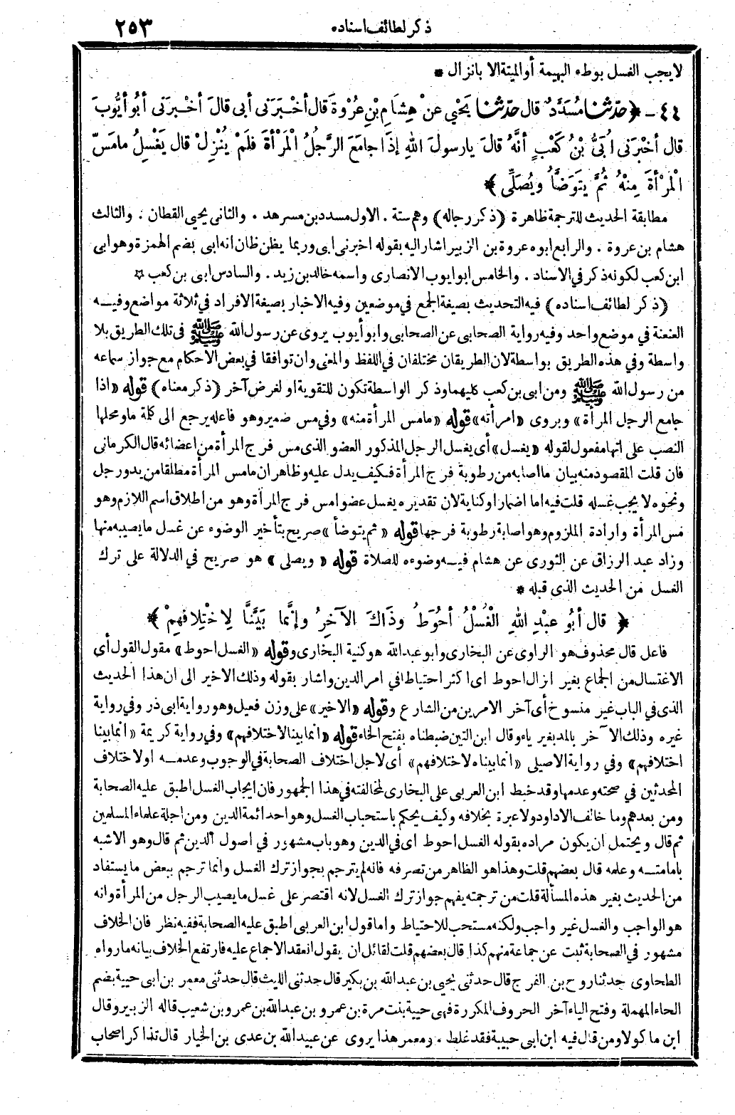 293 - حدّثنا مُسَدَّدُ قالَ حدّثنا يَحْيَى عَنْ هِشَامِ بَنْ عُرْوة قالَ أخْبَرَنِي أبي قالَ أخْبَرَنِي أبُو أيُّوبَ قَالَ أخْبَرَني أُبَيُّ بْنُ كَعْبٍ قالَ يَا رَسُول الله إذَا جَامَعَ الرَّجْلُ المَرْأَةَ فَلَمْ يُنْزِلْ قالَ يَغْسِلُ مَا مَسّ المَرْأَةَ مِنْهُ ثُمَّ يَتَوَضَأُ ويُصَلِي.