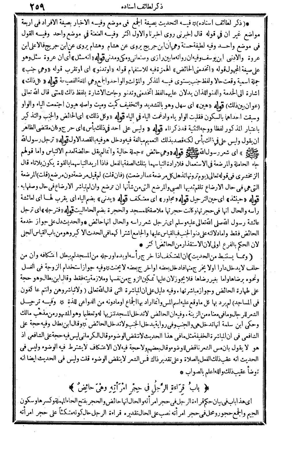 ذكر مَعْنَاهُ وَإِعْرَابه: قَوْله: (أَنه سُئِلَ) أَي: عُرْوَة سُئِلَ، وَهُوَ على صِيغَة الْمَجْهُول. قَوْله: (أتخدمني الْحَائِض؟) الْهمزَة فِيهِ للاستفهام. قَوْله: (أَو تَدْنُو؟) أَي: أَو تقرب؟ قَوْله: (وَهِي جنب) جملَة إسمية وَقعت حَالا. وَلَفظ جنب، يَسْتَوِي فِيهِ الْمُذكر والمؤنث وَالْوَاحد وَالْجمع، وَهِي اللُّغَة الفصيحة قَوْله: (كل ذَلِك) إِشَارَة إِلَى الْخدمَة، والدنو اللَّذَان يدلان عَلَيْهِمَا لفظ أتخدمني وتدنو؟ وَجَاءَت الْإِشَارَة بِلَفْظ ذَلِك للمثنى قَالَ الله تَعَالَى: {عوان بَين ذَلِك} (سُورَة الْبَقَرَة: 68) قَوْله: (هَين) أَي: سهل، وَهُوَ بِالتَّشْدِيدِ وَالتَّخْفِيف: كميت وميت، وَأَصله: هيون إجتمعت الْيَاء وَالْوَاو وسبقت إِحْدَاهمَا بِالسُّكُونِ، فقلبت الْوَاو يَاء، وأدغمت الْيَاء فِي الْيَاء. قَوْله: (وكل ذَلِك) أَي: الْحَائِض وَالْجنب، والتذكير بِاعْتِبَار الْمَذْكُور لفظا، وَوجه التَّثْنِيَة قد ذَكرْنَاهُ. قَوْله: (وَلَيْسَ على أحد فِي ذَلِك بَأْس) أَي: حرج، وَكَانَ مُقْتَضى الظَّاهِر أَن يَقُول: وَلَيْسَ عَليّ فِي ذَلِك بَأْس، لكنه قصد بذلك التَّعْمِيم مُبَالغَة فِيهِ، وَدخل هُوَ فِيهِ بِالْقَصْدِ الأول. قَوْله: (ترجل رَسُول الله صلى الله عَلَيْهِ وَسلم) أَي: شعر رَسُول الله صلى الله عَلَيْهِ وَسلم. قَوْله: (وَهِي حَائِض) جملَة حَالية، وَإِنَّمَا لم يقل: حائضة، لعدم الالتباس، وَأما قَوْلهم: جَاءَ الحاملة والمرضعة، فِي الِاسْتِعْمَال، فلإرادة التباسهما بِتِلْكَ الصّفة بِالْفِعْلِ، فَإِذا أُرِيد التباسهما بِالْقُوَّةِ. يكون بِلَا تَاء، وَقَالَ الزَّمَخْشَرِيّ فِي قَوْله تَعَالَى: {يَوْم ترونها تذهل كل مُرْضِعَة عَمَّا أرضعت} (سُورَة الْحَج: 2) فَإِن قلت: لم قيل مُرْضِعَة دون مرضع؟ قلت: الْمُرضعَة الَّتِي هِيَ فِي حَال الْإِرْضَاع تلقم ثديها الصَّبِي، والمرضع الَّتِي من شَأْنهَا أَن ترْضع وَإِن لم تباشر الْإِرْضَاع فِي حَال وصفهَا بِهِ. قَوْله: (حِينَئِذٍ) أَي: حِين الترجيل. قَوْله: (مجاور) أَي: معتكف. قَوْله: (بدني) بِضَم الْيَاء أَي: يقرب لَهَا، أَي: لعَائِشَة رَأسه، وَالْحَال أَنَّهَا فِي حُجْرَتهَا، وَكَانَت حُجْرَتهَا ملاصقة لِلْمَسْجِدِ، والحجرة، بِضَم الْحَاء الْبَيْت. قَوْله: (فترجله) أَي: ترجل عَائِشَة رَسُول الله صلى الله عَلَيْهِ وَسلم، أَي: ترجل شعر رَأسه، وَالْحَال أَنَّهَا حَائِض.