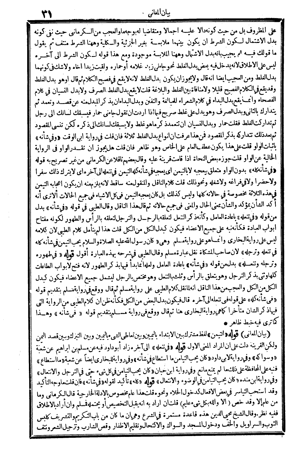 على المظروف، بل من حَيْثُ كَونه دَالا عَلَيْهِ إِجْمَالا ومتقاضياً لَهُ بِوَجْه مَا، وَالْعجب من الْكرْمَانِي حَيْثُ نفى كَونه بدل الاشتمال لكَون الشَّرْط أَن يكون بَينهمَا مُلَابسَة بِغَيْر الْجُزْئِيَّة والكلية. وَهَهُنَا الشَّرْط مُنْتَفٍ. ثمَّ يَقُول: مَا قَوْلك فِيهِ؟ ثمَّ يُجيب بِأَنَّهُ بدل الاشتمال، وَهَهُنَا الملابسة مَوْجُودَة، وَمَعَ هَذَا قَوْله: لكَون الشَّرْط. إِلَى آخِره، لَيْسَ على الْإِطْلَاق لِأَنَّهُ يدْخل فِيهِ بعض الْغَلَط، نَحْو: جَاءَنِي زيد غُلَامه أَو حِمَاره، وَلَقِيت زيدا أَخَاهُ. وَلَا شكّ فِي كَونهَا بدل الْغَلَط. وَمن العجيب أَيْضا أَنه قَالَ: وَلَا يجوز أَن يكون بدل الْغَلَط لِأَنَّهُ لَا يَقع فِي فصيح الْكَلَام، ثمَّ قَالَ: أَو هُوَ بدل الْغَلَط وَقد يَقع فِي الْكَلَام الفصيح قَلِيلا، وَلَا مُنَافَاة بَين الْغَلَط والبلاغة. قلت: لَا يَقع بدل الْغَلَط الصّرْف وَلَا بدل النسْيَان فِي كَلَام الفصحاء، وَإِنَّمَا يَقع بدل البداء فِي كَلَام الشُّعَرَاء للْمُبَالَغَة والتفنن، وَبدل البداء أَن يذكر الْمُبدل مِنْهُ عَن قصد وتعمد ثمَّ يتدارك بِالثَّانِي، وَيدل الصّرْف وَهُوَ يدل على غلط صَرِيح فِيمَا إِذا أردْت أَن تَقول: جَاءَنِي حمَار فيسبقك لسَانك إِلَى رجل ثمَّ تداركت الْغَلَط فَقلت: حمَار، وَبدل النسْيَان أَن تتعمد ذكر مَا هُوَ غلط، وَلَا يسبقك لسَانك إِلَى ذكره، لَكِن تنسى الْمَقْصُود ثمَّ بعد ذَلِك تتداركه بِذكر الْمَقْصُود، فَمن هَذَا عرفت أَن أَنْوَاع بدل الْغَلَط ثَلَاثَة. فَإِن قلت: فِي رِوَايَة ابي الْوَقْت: (وَفِي شَأْنه) ، بِإِثْبَات الْوَاو، قلت: على هَذَا يكون عطف الْعَام على الْخَاص، وَهُوَ ظَاهر. فان قلت: هَل يجوز أَن تقدر: الْوَاو، وَفِي الرِّوَايَة الخالية عَن: الْوَاو؟ قلت: جوزه بعض النُّحَاة إِذا قَامَت قرينَة عَلَيْهِ. وَقَالَ بَعضهم نَاقِلا عَن الْكرْمَانِي من غير تَصْرِيح بِهِ، قَوْله: (فِي شَأْنه كُله) بِدُونِ: الْوَاو، مُتَعَلق: بيعجبه، لَا: بالتيمن، أَي يُعجبهُ فِي شَأْنه كُله التَّيَمُّن فِي تنعله ... إِلَى آخِره أَي: لَا يتْرك ذَلِك سفرا وَلَا حضرا، وَلَا فِي فراغة وَلَا شغله وَنَحْو ذَلِك. قلت: كَلَام النَّاقِل وَالْمَنْقُول مِنْهُ سَاقِط، لِأَنَّهُ يلْزم مِنْهُ أَن يكون إعجابه التَّيَمُّن فِي هَذِه الثَّلَاثَة مَخْصُوصَة فِي حالاته كلهَا، وَلَيْسَ كَذَلِك، بل كَانَ يُعجبهُ التَّيَمُّن فِي كل الْأَشْيَاء فِي جَمِيع الْحَالَات. أَلا ترى أَنه أكد الشَّأْن بمؤكد؟ والشأن بِمَعْنى الْحَال، وَالْمعْنَى فِي جَمِيع حالاته؟ ثمَّ قَالَ هَذَا النَّاقِل: وَقَالَ الطَّيِّبِيّ، فِي قَوْله: (فِي شَأْنه) بدل من قَوْله: (فِي تنعله) ، بِإِعَادَة الْعَامِل، وَكَأَنَّهُ ذكر التنعل لتَعَلُّقه بِالرجلِ، والترجل لتَعَلُّقه بِالرَّأْسِ، وَالطهُور لكَونه مِفْتَاح أَبْوَاب الْعِبَادَة، فَكَأَنَّهُ نبه على جَمِيع الْأَعْضَاء، فَيكون كبدل الْكل من الْكل. قلت: هَذَا لم يتَأَمَّل كَلَام الطَّيِّبِيّ، لِأَن كَلَامه لَيْسَ على رِوَايَة البُخَارِيّ وَإِنَّمَا هُوَ على رِوَايَة مُسلم، وَهِي: (كَانَ رَسُول الله، عَلَيْهِ الصَّلَاة وَالسَّلَام، يحب التَّيَمُّن فِي شَأْنه كُله: فِي تنعله وَترَجله) . لِأَن صَاحب الْمشكاة نقل عبارَة مُسلم، وَقَالَ الطَّيِّبِيّ فِي شَرحه: بِهَذِهِ الْعبارَة أَقُول. قَوْله: (فِي طهوره وَترَجله وتنعله) بدل من قَوْله: (فِي شَأْنه) ، بِإِعَادَة الْعَامِل وَلَعَلَّه إِنَّمَا بَدَأَ فِيهَا بِذكر الطّهُور لِأَنَّهُ فتح لأبواب الطَّاعَات كلهَا، وثنى بِذكر التَّرَجُّل وَهُوَ يتَعَلَّق بِالرَّأْسِ، وَثلث بالتنعل وَهُوَ مُخْتَصّ بِالرجلِ ليشْمل جَمِيع الْأَعْضَاء، فَيكون كبدل الْكل من الْكل، وَالْعجب من هَذَا النَّاقِل أَنه لما نقل كَلَام الطَّيِّبِيّ على رِوَايَة مُسلم