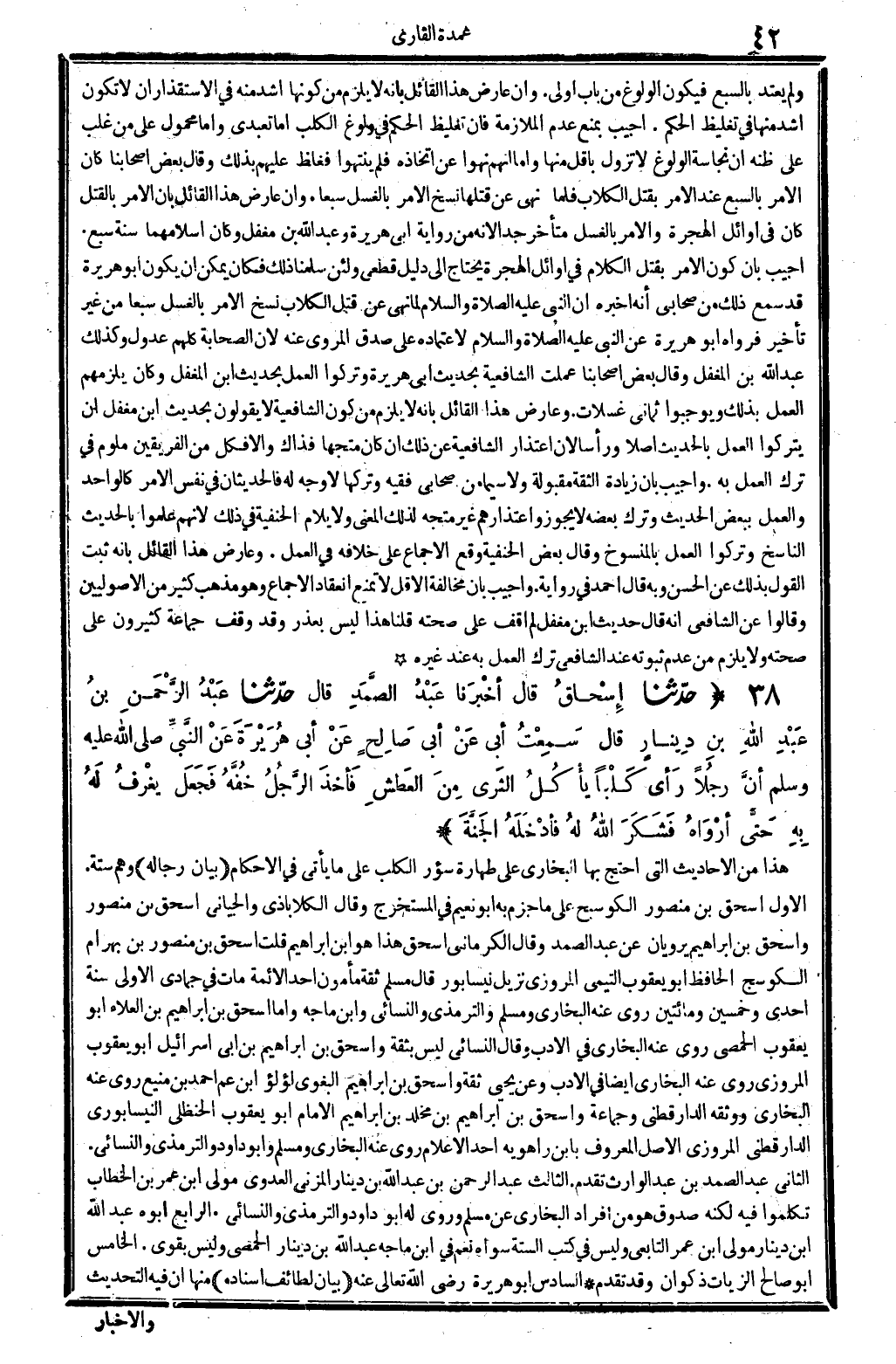 بَيَان رِجَاله وهم سِتَّة، الأول: أسْحَاق بن مَنْصُور الكوسج، على مَا جزم بِهِ أَبُو نعيم فِي (الْمُسْتَخْرج) ، وَقَالَ الكلاباذى والجياني: اسحاق بن مَنْصُور، وَإِسْحَاق بن إِبْرَاهِيم يرويان عَن عبد الصَّمد. وَقَالَ الْكرْمَانِي: إِسْحَاق هَذَا هُوَ ابْن إِبْرَاهِيم. قلت: إِسْحَاق بن مَنْصُور بن بهْرَام الكوسج الْحَافِظ، أَبُو يَعْقُوب التَّيْمِيّ الْمروزِي نزيل نيسابور. قَالَ مُسلم: ثِقَة مَأْمُون أحد الْأَئِمَّة، مَاتَ فِي جُمَادَى الأولى سنة إِحْدَى وَخمسين ومائين، روى عَنهُ البُخَارِيّ وَمُسلم وَالتِّرْمِذِيّ وَالنَّسَائِيّ وَابْن مَاجَه، وَأما إِسْحَاق بن إِبْرَاهِيم بن الْعَلَاء، أَبُو يَعْقُوب الْحِمصِي، روى عَنهُ البُخَارِيّ فِي الْأَدَب. وَقَالَ النَّسَائِيّ: لَيْسَ بِثِقَة. وَإِسْحَاق بن ابراهيم بن أبي إِسْرَائِيل أَبُو يَعْقُوب الْمروزِي، روى عَنهُ البُخَارِيّ أَيْضا فِي الْأَدَب، وَعَن يحيى ثِقَة. وَإِسْحَاق بن إِبْرَاهِيم الْبَغَوِيّ لُؤْلُؤ ابْن عَم أَحْمد بن منيع، روى عَنهُ البُخَارِيّ، وَوَثَّقَهُ الدَّارَقُطْنِيّ وَجَمَاعَة، وَإِسْحَاق بن إِبْرَاهِيم بن مخلد بن إِبْرَاهِيم الإِمَام، أَبُو يَعْقُوب الْحَنْظَلِي النَّيْسَابُورِي الدَّارَقُطْنِيّ الْمروزِي الأَصْل، الْمَعْرُوف بِابْن رَاهَوَيْه، أحد الْأَعْلَام، روى عَنهُ البُخَارِيّ وَمُسلم وَأَبُو دَاوُد وَالتِّرْمِذِيّ وَالنَّسَائِيّ. الثَّانِي: عبد الصَّمد بن عبد الْوَارِث، تقدم. الثَّالِث: عبد الرَّحْمَن بن عبد الله بن دِينَار الْمُزنِيّ الْعَدوي، مولى ابْن عمر بن الْخطاب، تكلمُوا فِيهِ لكنه صَدُوق، وَهُوَ من أَفْرَاد البُخَارِيّ عَن مُسلم، وروى لَهُ أَبُو دَاوُد وَالتِّرْمِذِيّ وَالنَّسَائِيّ. الرَّابِع: أَبوهُ عبد الله ابْن دِينَار، مولى ابْن عمر التَّابِعِيّ، وَلَيْسَ فِي كتب السِّتَّة سواهُ. نعم فِي ابْن مَاجَه: عبد الله بن دِينَار الْحِمصِي، وَلَيْسَ بِقَوي. الْخَامِس: ابو صَالح الزيات ذكْوَان، وَقد تقدم. السَّادِس: أَبُو هُرَيْرَة؟ رَضِي الله تَعَالَى عَنهُ.