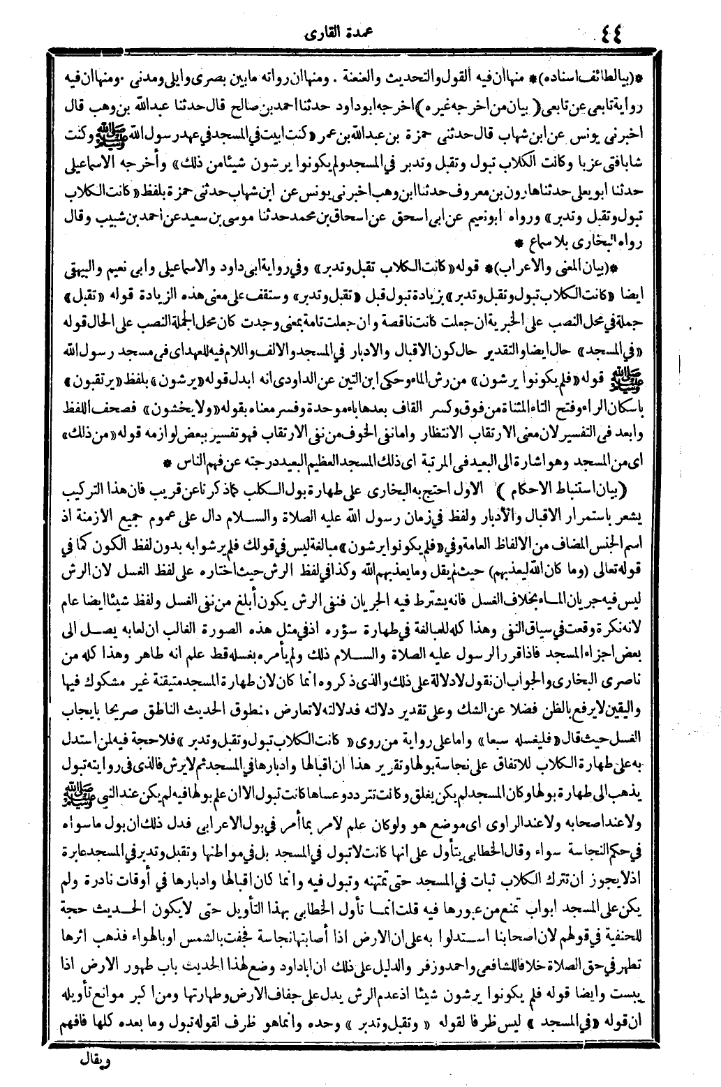 بَيَان الْمَعْنى وَالْإِعْرَاب قَوْله: (كَانَت الْكلاب تقبل وتدبر) وَفِي رِوَايَة أبي دَاوُد والإسماعيلي وَأبي نعيم وَالْبَيْهَقِيّ أَيْضا: (كَانَت الْكلاب تبول وَتقبل وتدبر) ، بِزِيَاد: تبول، قبل: (تقبل وتدبر) . وستقف على معنى هَذِه الزِّيَادَة. قَوْله: (تقبل) جملَة فِي مَحل النصب على الخبرية إِن جعلت: كَانَت، نَاقِصَة. وَإِن جعلت تَامَّة بِمَعْنى: وجدت، كَانَ مَحل الْجُمْلَة النصب على الْحَال. قَوْله: (فِي الْمَسْجِد) حَال أَيْضا، وَالتَّقْدِير: حَال كَون الإقبال والإدبار فِي الْمَسْجِد، وَالْألف وَاللَّام فِيهِ للْعهد. اي: فِي مَسْجِد رَسُول الله صلى الله عَلَيْهِ وَسلم. قَوْله: (فَلم يَكُونُوا يرشون) من: رش المَاء، وَحكى ابْن التِّين عَن الدَّاودِيّ أَنه أبدل قَوْله: (يرشون) بِلَفْظ: (يرتقبون) ، بِإِسْكَان الرَّاء وَفتح التَّاء الْمُثَنَّاة من فَوق وَكسر الْقَاف بعْدهَا بَاء مُوَحدَة، وَفسّر مَعْنَاهُ بقوله: (وَلَا يَخْشونَ) فصحف اللَّفْظ وَأبْعد فِي التَّفْسِير لِأَن معنى: الارتقاب: الِانْتِظَار. وَأما نفي الْخَوْف من نفي الارتقاب فَهُوَ تَفْسِير بِبَعْض لوازمه. قَوْله: (من ذَلِك) أَي من الْمَسْجِد، وَهُوَ إِشَارَة إِلَى الْبعيد فِي الْمرتبَة، أَي: ذَلِك الْمَسْجِد الْعَظِيم الْبعيد دَرَجَته عَن فهم النَّاس.