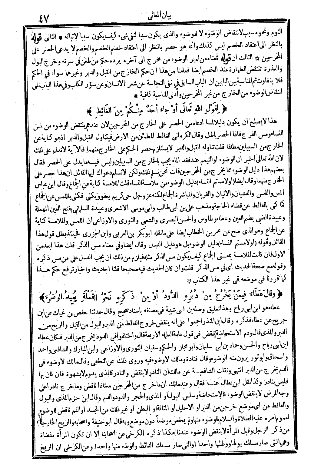 هَذَا لَا يصلح أَن يكون دَلِيلا لما ادَّعَاهُ من الْحصْر على الْخَارِج من المخرجين، لِأَن عِنْدهم ينْتَقض الْوضُوء من لمس النِّسَاء وَمَسّ الْفرج، فَإِذا الْحصْر بَاطِل. وَقَالَ الْكرْمَانِي: الْغَائِط المطمئن من الأَرْض، فَيتَنَاوَل الْقبل والدبر، إِذْ هُوَ كِنَايَة عَن الْخَارِج من السَّبِيلَيْنِ مُطلقًا. قلت: تنَاوله الْقبل والدبر لَا يسْتَلْزم حصر الحكم على الْخَارِج مِنْهُمَا، فالآية لَا تدل على ذَلِك، لَان الله تَعَالَى أخبر أَن الْوضُوء، أَو التَّيَمُّم عِنْد فقد المَاء، يجب بالخارج من السَّبِيلَيْنِ، وَلَيْسَ فِيهِ مَا يدل على الْحصْر. فَقَالَ بَعضهم: هَذَا دَلِيل الْوضُوء مِمَّا يخرج من المخرجين. قلت: نَحن نسلم ذَلِك، وَلَكِن لَا نسلم دعواك أَيهَا الْقَائِل: إِن هَذَا حصر على الْخَارِج مِنْهُمَا. وَقَالَ أَيْضا: {أَو لامستم النِّسَاء} (النِّسَاء: 43، الْمَائِدَة: 6) دَلِيل الْوضُوء من ملامسة النِّسَاء: قلت: الْمُلَامسَة كِنَايَة عَن الْجِمَاع، وَقَالَ ابْن عَبَّاس: الْمس واللمس والغشيان والإتيان والقربان والمباشرة: الْجِمَاع، لكنه عز وَجل حَيّ كريم يعْفُو ويكني، فكنى باللمس عَن الْجِمَاع كَمَا كنى بالغائط عَن قَضَاء الْحَاجة، وَمذهب عَليّ بن أبي طَالب، وَأبي مُوسَى الْأَشْعَرِيّ وَعبيدَة السَّلمَانِي، بِفَتْح الْعين الْمُهْملَة، وَعبيدَة الضَّبِّيّ، بِضَم الْعين، وَعَطَاء وَطَاوُس وَالْحسن الْبَصْرِيّ وَالشعْبِيّ وَالثَّوْري وَالْأَوْزَاعِيّ: أَن اللَّمْس وَالْمُلَامَسَة كِنَايَة عَن الْجِمَاع، وَهُوَ الَّذِي صَحَّ عَن عمر بن الْخطاب أَيْضا على مَا نَقله أَبُو بكر بن الْعَرَبِيّ وَابْن الْجَزرِي، فَحِينَئِذٍ بَطل قَول هَذَا الْقَائِل: وَقَوله: {اَوْ لامستم النِّسَاء} (النِّسَاء: 43، الْمَائِدَة: 6) دَلِيل الْوضُوء، بل هُوَ دَلِيل الْغسْل وَقَالَ أَيْضا: وَفِي مَعْنَاهُ مس الذّكر. قلت: هَذَا أبعد من الأول، فَإِن كَانَت الْمُلَامسَة بِمَعْنى الْجِمَاع، كَيفَ يكون مس الذّكر مثله؟ فَيلْزم من ذَلِك أَن يجب الْغسْل على من مس ذكره. وَقَوله: مَعَ صِحَة الحَدِيث، اي: فِي مس الذّكر. قلت: وَإِن كَانَ الحَدِيث فِيهِ صَحِيحا، قُلْنَا: أَحَادِيث وأخبار ترفع حكم هَذَا، كَمَا قَررنَا فِي مَوْضِعه فِي غير هَذَا الْكتاب.