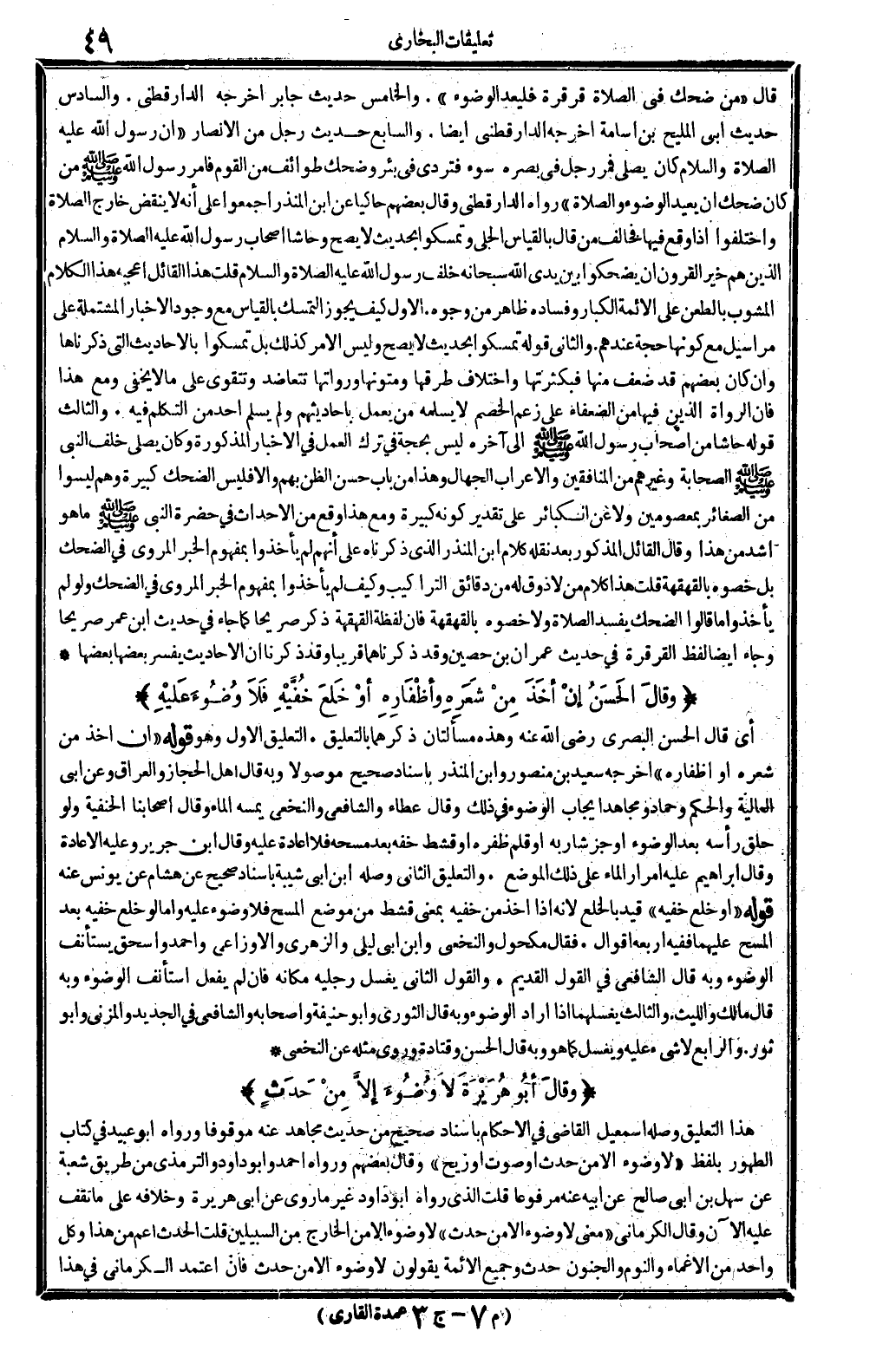 قَالَ: (من ضحك فِي الصَّلَاة قرقرة فليعد الْوضُوء) . وَالْخَامِس: حَدِيث جَابر أخرجه الدَّارَقُطْنِيّ. وَالسَّادِس: حَدِيث ابي الْمليح بن أُسَامَة، أخرجه الدَّارَقُطْنِيّ أَيْضا. وَالسَّابِع: حَدِيث رجل من الْأَنْصَار: (أَن رَسُول الله، عَلَيْهِ الصَّلَاة وَالسَّلَام، كَانَ يُصَلِّي، فَمر رجل فِي بَصَره سوء فتردى فِي بِئْر وَضحك طوائف من الْقَوْم، فَأمر رَسُول الله صلى الله عَلَيْهِ وَسلم من كَانَ ضحك أَن يُعِيد الْوضُوء وَالصَّلَاة) ، رَوَاهُ الدَّارَقُطْنِيّ، وَقَالَ بَعضهم حاكياً عَن ابْن الْمُنْذر: أَجمعُوا على أَنه لَا ينْقض خَارج الصَّلَاة، وَاخْتلفُوا إِذا وَقع فِيهَا فَخَالف من قَالَ بِالْقِيَاسِ الْجَلِيّ، وتمسكوا بِحَدِيث لَا يَصح، وحاشا أَصْحَاب رَسُول الله، عَلَيْهِ الصَّلَاة وَالسَّلَام، الَّذين هم خير الْقُرُون، أَن يضحكوا بَين يَدي الله سُبْحَانَهُ خلف رَسُول الله، عَلَيْهِ الصَّلَاة وَالسَّلَام. قلت: هَذَا الْقَائِل أعجبه هَذَا الْكَلَام المشوب بالطعن على الْأَئِمَّة الْكِبَار، وفساده ظَاهر من وجوده: الأول: كَيفَ يجوز التَّمَسُّك بِالْقِيَاسِ مَعَ وجود الْأَخْبَار الْمُشْتَملَة على مَرَاسِيل مَعَ كَونهَا حجَّة عِنْدهم. وَالثَّانِي قَوْله: تمسكوا بِحَدِيث لَا يَصح، وَلَيْسَ الْأَمر كَذَلِك، بل تمسكوا بالأحاديث الَّتِي ذَكرنَاهَا وَإِن كَانَ بَعضهم قد ضعف مِنْهَا، فبكثرتها وَاخْتِلَاف طرقها ومتونها ورواتها تتعاضد وتتقوى على مَا لَا يخفى، وَمَعَ هَذَا فَإِن الروَاة الَّذين فِيهَا من الضُّعَفَاء على زعم الْخصم لَا يُسلمهُ من يعْمل بأحاديثهم، وَلم يسلم أحد من التَّكَلُّم فِيهِ. وَالثَّالِث: قَوْله: حاشا من أَصْحَاب رَسُول الله صلى الله عَلَيْهِ وَسلم ... إِلَى آخِره، لَيْسَ بِحجَّة فِي ترك الْعَمَل فِي الْأَخْبَار الْمَذْكُورَة، وَكَانَ يُصَلِّي خلف النَّبِي، صلى الله عَلَيْهِ وَسلم الصَّحَابَة وَغَيرهم من الْمُنَافِقين والأعراب الْجُهَّال، وَهَذَا من بَاب حسن الظَّن بهم، وإلاَّ فَلَيْسَ الضحك كَبِيرَة، وهم لَيْسُوا من الصَّغَائِر بمعصومين وَلَا عَن الْكَبَائِر، على تَقْدِير كَونه كَبِيرَة، وَمَعَ هَذَا وَقع من الْأَحْدَاث فِي حَضْرَة النَّبِي صلى الله عَلَيْهِ وَسلم مَا هُوَ أَشد من هَذَا. وَقَالَ الْقَائِل الْمَذْكُور، بعد نَقله كَلَام ابْن الْمُنْذر الَّذِي ذَكرْنَاهُ: على أَنهم لم يَأْخُذُوا بِمَفْهُوم الْخَبَر الْمَرْوِيّ فِي الضحك، بل خصوه بالقهقهة. قلت: هَذَا كَلَام من لَا ذوق لَهُ من دقائق التراكيب، وَكَيف لم يَأْخُذُوا بِمَفْهُوم الْخَبَر الْمَرْوِيّ فِي الضحك، وَلَو لم يَأْخُذُوا مَا قَالُوا: الضحك يفْسد الصَّلَاة وَلَا خصوه بالقهقهة؟ فَإِن لَفظه القهقهة ذكر صَرِيحًا كَمَا جَاءَ فِي حَدِيث ابْن عمر صَرِيحًا. وَجَاء أَيْضا لفظ: القرقرة، فِي حَدِيث عمرَان بن حُصَيْن. وَقد ذكرناهما قَرِيبا، وَقد ذكرنَا أَن الْأَحَادِيث يُفَسر بَعْضهَا بَعْضًا.