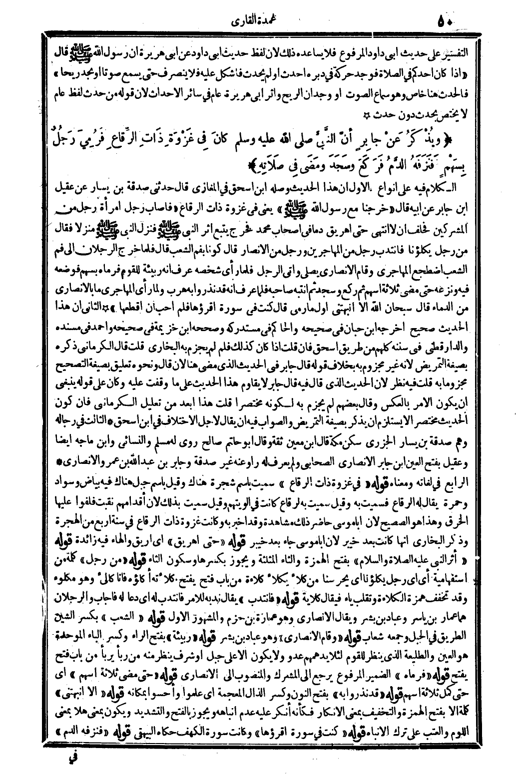 الرَّابِع: فِي لغاته وَمَعْنَاهُ قَوْله: (فِي غَزْوَة ذَات الرّقاع) سميت بإسم شَجَرَة هُنَاكَ، وَقيل: باسم جبل هُنَاكَ فِيهِ بَيَاض وَسَوَاد وَحُمرَة، يُقَال لَهُ: الرّقاع، فسميت بِهِ. وَقيل: سميت بِهِ لرقاع كَانَت فِي أَلْوِيَتهم. وَقيل: سميت بذلك لِأَن أَقْدَامهم نقبت فلفوا عَلَيْهَا الْخرق، وَهَذَا هُوَ الصَّحِيح، لِأَن أَبَا مُوسَى حَاضر ذَلِك مُشَاهدَة وَقد أخبر بِهِ، وَكَانَت غَزْوَة ذَات الرّقاع فِي سنة أَربع من الْهِجْرَة. وَذكر البُخَارِيّ أَنَّهَا كَانَت بعد خَيْبَر، لِأَن أَبَا مُوسَى جَاءَ بعد خَيْبَر. قَوْله: (حَتَّى أهريق) أَي: أريق، وَالْهَاء فِيهِ زَائِدَة. قَوْله: (أثر النَّبِي، عَلَيْهِ الصَّلَاة وَالسَّلَام) ، بِفَتْح الْهمزَة والثاء الْمُثَلَّثَة، وَيجوز بِكَسْرِهَا وَسُكُون الثَّاء. قَوْله: (من رجل) ، كلمة: من، استفهامية أَي: أَي رجل يكلؤنا؟ اي: يحرسنا؟ من كلأ يكلأ كلاءة، من بَاب: فتح يفتح. كلأته أكلؤه فَأَنا كالىء، وَهُوَ مكلوء. وَقد تخفف همزَة الكلاءة وتقلب يَاء فَيُقَال: كلاية. قَوْله: (فَانْتدبَ) ، يُقَال نَدبه لِلْأَمْرِ فَانْتدبَ لَهُ اي: دَعَا لَهُ فَأجَاب، وَالرجلَانِ هما: عمار بن يَاسر وَعباد بن بشر. وَيُقَال الْأنْصَارِيّ، وَهُوَ عمَارَة بن حزم، وَالْمَشْهُور الأول. قَوْله: (الشّعب) ، بِكَسْر الشين: الطَّرِيق فِي الْجَبَل، وَجمعه شعاب. قَوْله: (وَقَامَ الْأنْصَارِيّ) ، وَهُوَ عباد بن بشر. قَوْله: (ربيئة) ، بِفَتْح الرَّاء وَكسر الْبَاء الْمُوَحدَة: هُوَ الْعين والطليعة الَّذِي ينظر للْقَوْم لِئَلَّا يدهمهم عَدو، وَلَا يكون إلاَّ على جبل أَو شرف ينظر مِنْهُ، من: ربأ يربأ من بَاب: فتح يفتح. قَوْله: (فَرَمَاهُ) ، الضَّمِير الْمَرْفُوع يرجع إِلَى الْمُشرك، والمنصوب إِلَى الْأنْصَارِيّ. قَوْله: (حَتَّى مضى ثَلَاثَة أسْهم) اي: حَتَّى كمل ثَلَاثَة أسْهم. قَوْله: (قد نذروا بِهِ) ، بِفَتْح النُّون وَكسر الذَّال الْمُعْجَمَة: أَي علمُوا وأحسوا بمكانه. قَوْله: (أَلا انبهتني) كلمة: ألاَّ، بِفَتْح الْهمزَة وَالتَّخْفِيف بِمَعْنى الْإِنْكَار، فَكَأَنَّهُ أنكر عَلَيْهِ عدم إنباهه، وَيجوز بِالْفَتْح وَالتَّشْدِيد، وَيكون بِمَعْنى: هلا، بِمَعْنى اللوم والعتب على ترك الإنباه. قَوْله: (كنت فِي سُورَة أقرؤها) ، وَكَانَت سُورَة الْكَهْف، حَكَاهُ الْبَيْهَقِيّ. قَوْله: (فنزفه الدَّم) ،