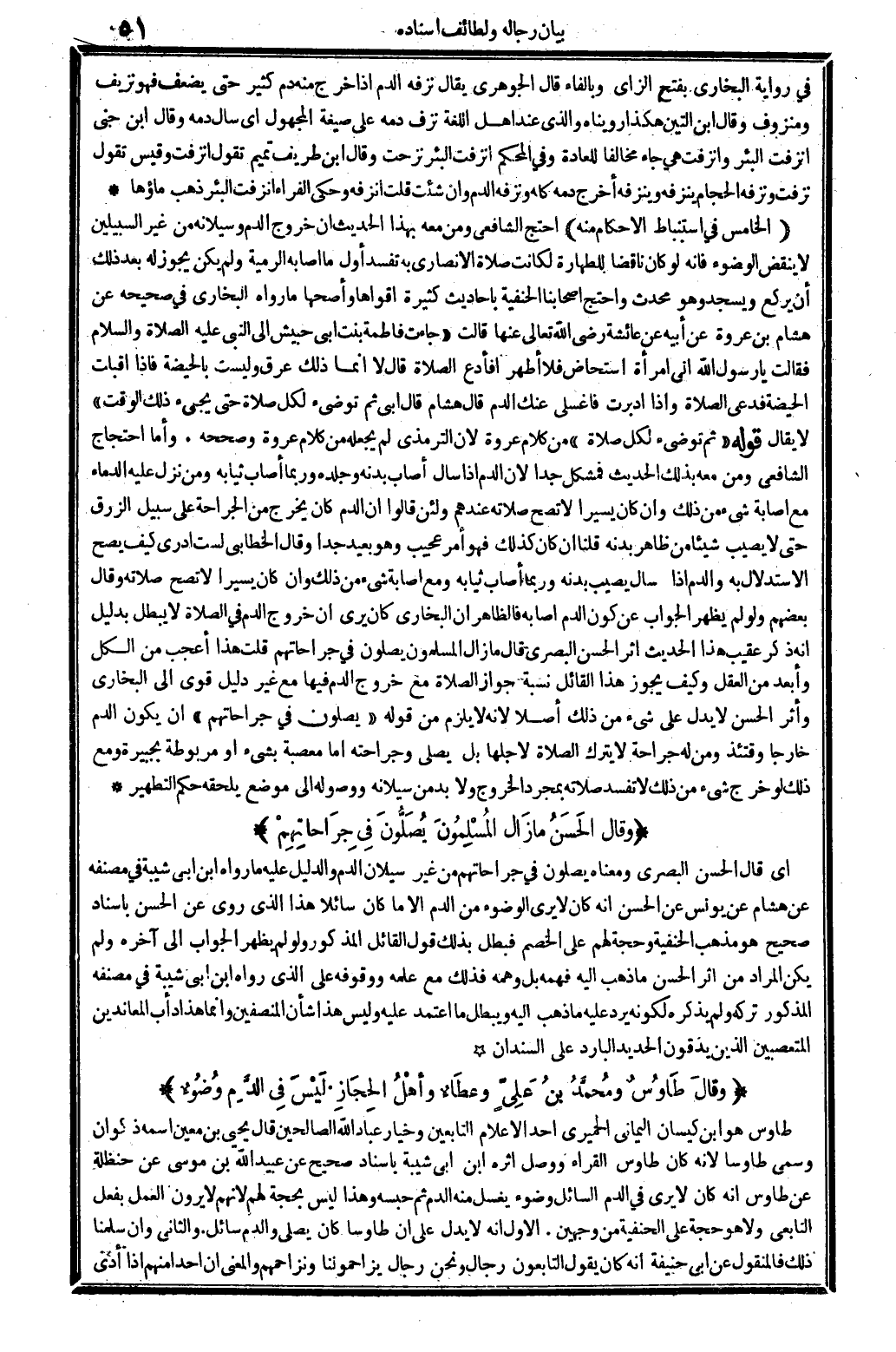 طَاوس هُوَ ابْن كيسَان الْيَمَانِيّ الْحِمْيَرِي، أحد الْأَعْلَام التَّابِعين وَخيَار عباد الله الصَّالِحين. قَالَ يحيى بن معِين: اسْمه ذكْوَان، وَسمي طاوساً لِأَنَّهُ كَانَ طَاوس الْقُرَّاء، وَوصل أَثَره ابْن ابي شيبَة بِإِسْنَاد صَحِيح عَن عبيد الله بن مُوسَى عَن حَنْظَلَة عَن طَاوس أَنه كَانَ لَا يرى فِي الدَّم السَّائِل وضوء يغسل مِنْهُ الدَّم ثمَّ حَبسه، وَهَذَا لَيْسَ بِحجَّة لَهُم لأَنهم لَا يرَوْنَ الْعَمَل بِفعل التَّابِعِيّ، وَلَا هُوَ حجَّة على الْحَنَفِيَّة من وَجْهَيْن: الأول: أَنه لَا يدل على أَن طاوساً كَانَ يُصَلِّي وَالدَّم سَائل. وَالثَّانِي: وَإِن سلمنَا ذَلِك، فالمنقول عَن أبي حنيفَة أَنه كَانَ يَقُول: التابعون رجال وَنحن رجال يزاحموننا ونزاحمهم، وَالْمعْنَى أَن أحدا مِنْهُم إِذا أدّى