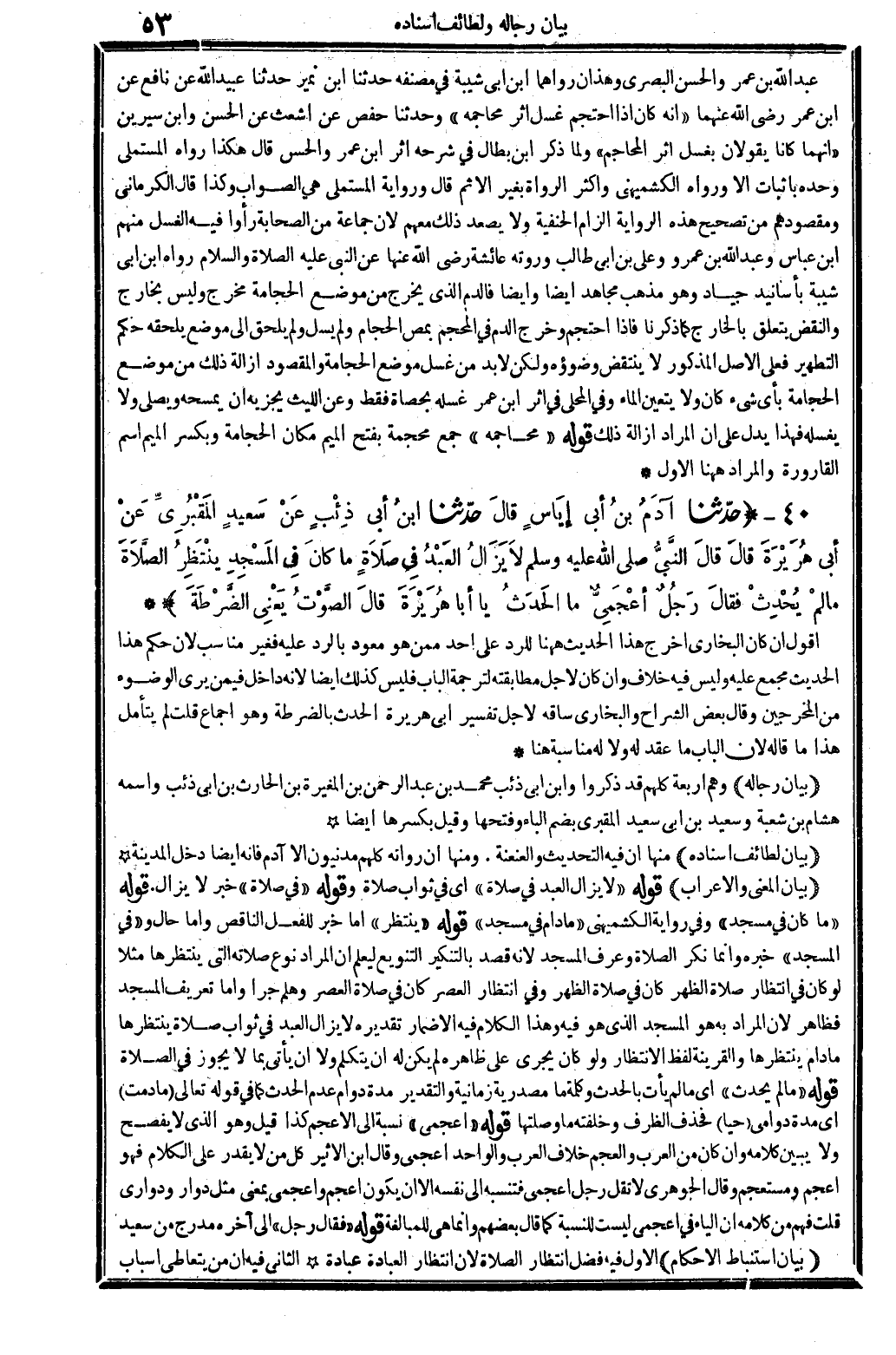 بَيَان الْمَعْنى وَالْإِعْرَاب قَوْله: (لَا يزَال العَبْد فِي صَلَاة) اي: فِي ثَوَاب صَلَاة. قَوْله: (فِي صَلَاة) خبر: لَا يزَال. قَوْله: (مَا كَانَ فِي مَسْجِد) ، وَفِي رِوَايَة الْكشميهني: (مَا دَامَ فِي مَسْجِد) . قَوْله: (ينْتَظر) : إِمَّا خبر للْفِعْل النَّاقِص، وَإِمَّا حَال. و (فِي الْمَسْجِد) خَبره، وَإِنَّمَا نكر الصَّلَاة وَعرف الْمَسْجِد لِأَنَّهُ قصد بالتنكير التنويع، ليعلم أَن المُرَاد نوع صلَاته الَّتِي ينتظرها، مثلا لَو كَانَ فِي انْتِظَار صَلَاة الظّهْر كَانَ فِي صَلَاة الظّهْر، وَفِي انْتِظَار الْعَصْر كَانَ فِي صَلَاة الْعَصْر، وهلم جراً. وَأما تَعْرِيف الْمَسْجِد فَظَاهر، لِأَن المُرَاد بِهِ هُوَ الْمَسْجِد الَّذِي هُوَ فِيهِ، وَهَذَا الْكَلَام فِيهِ الْإِضْمَار، تَقْدِيره: لَا يزَال العَبْد فِي ثَوَاب صَلَاة ينتظرها مَا دَامَ ينتظرها، والقرينة لفظ الِانْتِظَار، وَلَو كَانَ يجْرِي على ظَاهره لم يكن لَهُ أَن يتَكَلَّم، وَلَا أَن يَأْتِي بِمَا لَا يجوز فِي الصَّلَاة. قَوْله: (مَا لم يحدث) أَي: مَا لم يَأْتِ بِالْحَدَثِ. وَكلمَة: مَا، مَصْدَرِيَّة زمانية، وَالتَّقْدِير: مُدَّة دوَام. عدم الْحَدث، كَمَا قَوْله تَعَالَى: {مَا دمت} (مَرْيَم: 31) أَي: مُدَّة دوامي {حَيا} (مَرْيَم: 31) فَحذف الظّرْف وخلفته: مَا، وصلتها. قَوْله: (أعجمي) نِسْبَة إِلَى الْأَعْجَم، كَذَا قيل، وَهُوَ الَّذِي لَا يفصح وَلَا يبين كَلَامه وَإِن كَانَ من الْعَرَب، والعجم خلاف الْعَرَب، وَالْوَاحد أعجمي. وَقَالَ ابْن الاثير: كل من لَا يقدر على الْكَلَام فَهُوَ اعجم ومستعجم. وَقَالَ الْجَوْهَرِي: لَا نقل: رجل أعجمي، فتنسبه إِلَى نَفسه إلاَّ أَن يكون أعجم؛ وأعجمي بِمَعْنى مثل: دوار ودواري. قلت: فهم من كَلَامه أَن الْيَاء فِي: أعجمي، لَيست للنسبة، كَمَا قَالَ بَعضهم، وَإِنَّمَا هِيَ للْمُبَالَغَة. قَوْله: (فَقَالَ رجل) إِلَى آخِره: مدرج من سعيد.
