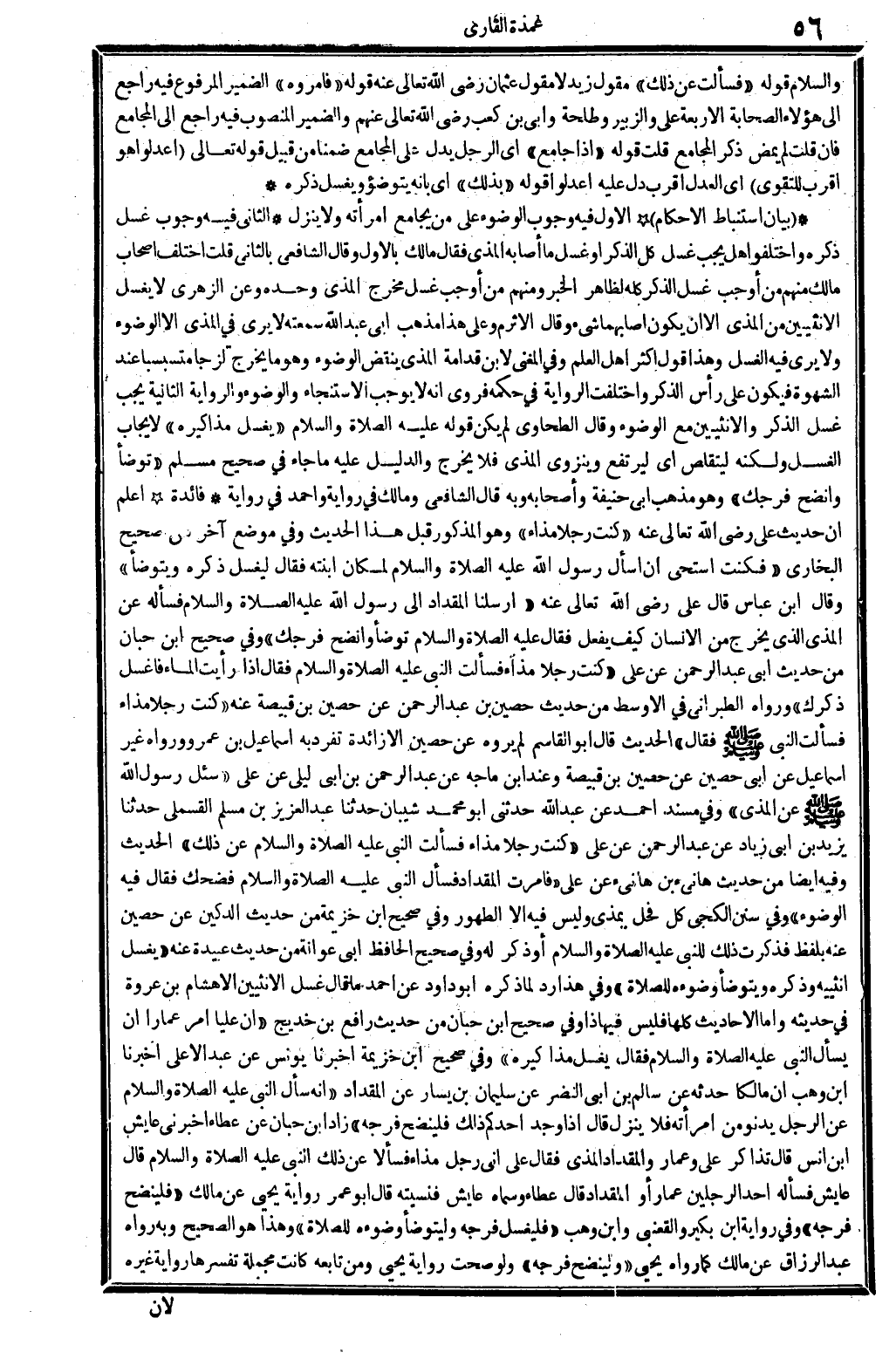 فَائِدَة إعلم أَن حَدِيث عَليّ، رَضِي الله تَعَالَى عَنهُ: (كنت رجلا مذَّاء) ، وَهُوَ الْمَذْكُور قبل هَذَا الحَدِيث وَفِي مَوضِع آخر من (صَحِيح البُخَارِيّ) : (فَكنت أستحى أَن اسْأَل رَسُول الله، عَلَيْهِ الصَّلَاة وَالسَّلَام، لمَكَان ابْنَته. فَقَالَ: ليغسل ذكره وَيتَوَضَّأ) . وَقَالَ ابْن عَبَّاس: قَالَ عَليّ، رَضِي الله تَعَالَى عَنهُ: (أرسلنَا الْمِقْدَاد إِلَى رَسُول الله، عَلَيْهِ الصَّلَاة وَالسَّلَام، فَسَأَلَهُ عَن الْمَذْي الَّذِي يخرج من الْإِنْسَان، كَيفَ يفعل؟ فَقَالَ، عَلَيْهِ الصَّلَاة وَالسَّلَام: تَوَضَّأ وانضح فرجك) . وَفِي (صَحِيح ابْن حبَان) من حَدِيث أبي عبد الرَّحْمَن عَن عَليّ: (كنت رجلا مذَّاء فَسَأَلت النَّبِي، عَلَيْهِ الصَّلَاة وَالسَّلَام، فَقَالَ: إِذا رَأَيْت المَاء فاغسل ذكرك) . وَرَوَاهُ الطَّبَرَانِيّ فِي (الْأَوْسَط) من حَدِيث حُصَيْن بن عبد الرَّحْمَن عَن حُصَيْن بن قبيصَة عَنهُ: (كنت رجلا مذَّاءً فَسَأَلت النَّبِي صلى الله عَلَيْهِ وَسلم فَقَالَ) الحَدِيث. قَالَ ابو الْقَاسِم: لم يروه عَن حُصَيْن إلاَّ زَائِدَة، تفرد بِهِ إِسْمَاعِيل بن عَمْرو، وَرَوَاهُ غير إِسْمَاعِيل عَن أبي حُصَيْن عَن حُصَيْن بن قبيصَة. وَعند ابْن مَاجَه عَن عبد الرَّحْمَن بن أبي ليلى عَن عَليّ: (سُئِلَ رَسُول الله صلى الله عَلَيْهِ وَسلم عَن الْمَذْي) . وَفِي (مُسْند) أَحْمد عَن عبد الله: حَدثنِي أَبُو مُحَمَّد شَيبَان حَدثنَا عبد الْعَزِيز بن مُسلم الْقَسْمَلِي حَدثنَا يزِيد بن أبي زِيَاد عَن عبد الرَّحْمَن عَن عَليّ: (كنت رجلا مذَّاءً، فَسَأَلت النَّبِي، عَلَيْهِ الصَّلَاة وَالسَّلَام، عَن ذَلِك) الحَدِيث، وَفِيه أَيْضا من حَدِيث هانىء بن هانىء عَن عَليّ: (فَأمرت الْمِقْدَاد فَسَأَلَ النَّبِي، عَلَيْهِ الصَّلَاة وَالسَّلَام، فَضَحِك فَقَالَ: فِيهِ الْوضُوء) . وَفِي (سنَن الْكَجِّي) كل: فَحل يمذي، وَلَيْسَ فِيهِ إلاَّ الطّهُور. وَفِي (صَحِيح ابْن خُزَيْمَة) من حَدِيث الدكين عَن حُصَيْن عَنهُ بِلَفْظ: فَذكرت ذَلِك للنَّبِي، عَلَيْهِ الصَّلَاة وَالسَّلَام. أَو ذكر لَهُ. وَفِي (صَحِيح الْحَافِظ ابي عوَانَة) من حَدِيث عُبَيْدَة عَنهُ: (يغسل انثييه وَذكره وَيتَوَضَّأ وضوء للصَّلَاة) . وَفِي هَذَا رد لما ذكره أَبُو دَاوُد عَن أَحْمد مَا قَالَ: غسل الْأُنْثَيَيْنِ إلاَّ هِشَام بن عُرْوَة فِي حَدِيثه.