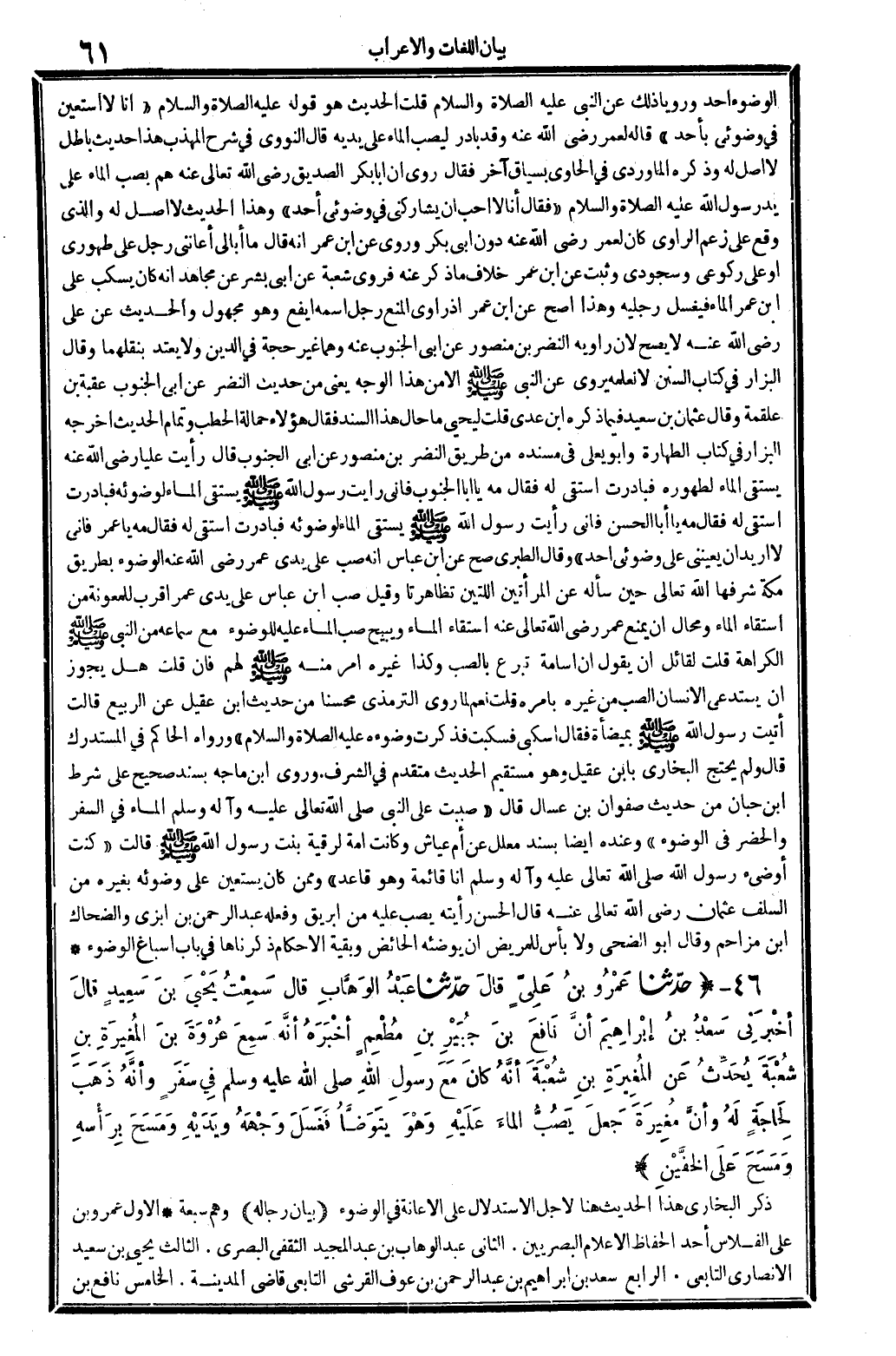 بَيَان رِجَاله وهم سَبْعَة. الأول: عَمْرو بن عَليّ الفلاس، أحد الْحفاظ الْأَعْلَام الْبَصرِيين. الثَّانِي: عبد الْوَهَّاب بن عبد الْمجِيد الثَّقَفِيّ الْبَصْرِيّ. الثَّالِث: يحيى بن سعيد الْأنْصَارِيّ التَّابِعِيّ. الرَّابِع: سعد بن إِبْرَاهِيم بن عبد الرَّحْمَن بن عَوْف الْقرشِي التَّابِعِيّ، قَاضِي الْمَدِينَة. الْخَامِس: نَافِع