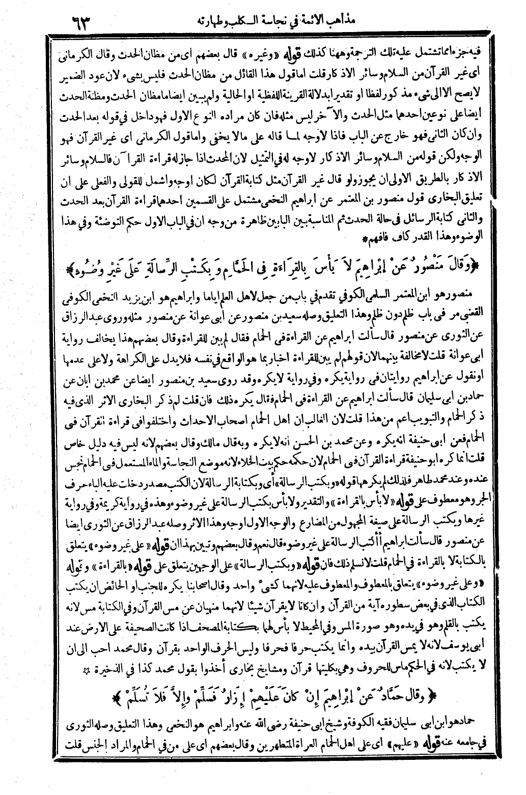وَاخْتلفُوا فِي قِرَاءَة الْقُرْآن فِي الْحمام. فَعَن ابي حنيفَة أَنه يكره، وَعَن مُحَمَّد بن الْحسن أَنه لَا يكره، وَبِه قَالَ مَالك. وَقَالَ بَعضهم: لِأَنَّهُ لَيْسَ فِيهِ دَلِيل خَاص، قلت: إِنَّمَا كره أَبُو حنيفَة قِرَاءَة الْقُرْآن فِي الْحمام لِأَن حكمه حكم بَيت الْخَلَاء، لِأَنَّهُ مَوضِع النَّجَاسَة، وَالْمَاء الْمُسْتَعْمل فِي الْحمام نجس عِنْده، وَعند مُحَمَّد طَاهِر، فَلذَلِك لم يكرهها. قَوْله: (وبكتب الرسَالَة) أَي: وبكتابة الرسَالَة، لِأَن الْكتب مصدر دخلت عَلَيْهِ الْبَاء حرف الْجَرّ، وَهُوَ مَعْطُوف على قَوْله: (لَا بَأْس بِالْقِرَاءَةِ) ، وَالتَّقْدِير: وَلَا بَأْس بكتب الرسَالَة على غير وضوء، وَهَذِه فِي رِوَايَة كَرِيمَة، وَفِي رِوَايَة غَيرهَا: وَيكْتب الرسَالَة، على صِيغَة الْمَجْهُول من الْمُضَارع، وَالْوَجْه الأول أوجه، وَهَذَا الْأَثر وَصله عبد الرَّزَّاق عَن الثَّوْريّ أَيْضا عَن مَنْصُور، قَالَ: سَأَلت إِبْرَاهِيم: أأكتب الرسَالَة على غير وضوء؟ قَالَ: نعم، وَقَالَ بَعضهم: وَتبين بِهَذَا أَن قَوْله: (على غير وضوء) يتَعَلَّق بِالْكِتَابَةِ لَا بالقراء فِي الْحمام. قلت: لَا نسلم ذَلِك، فَإِن قَوْله: (وبكتب الرسَالَة) على الْوَجْهَيْنِ يتَعَلَّق على قَوْله: (بِالْقِرَاءَةِ) . وَقَوله: (وعَلى غير وضوء) يتَعَلَّق بالمعطوف عَلَيْهِ لِأَنَّهُمَا كشيء وَاحِد. وَقَالَ أَصْحَابنَا: يكره للْجنب أَو الْحَائِض أَن يكْتب الْكتاب الَّذِي فِي بعض سطوره آيَة من الْقُرْآن وَإِن كَانَا لَا يقرآن شَيْئا، لِأَنَّهُمَا منهيان عَن مس الْقُرْآن، وَفِي الْكِتَابَة مس، لِأَنَّهُ يكْتب بالقلم وَهُوَ فِي يَده، وَهُوَ صُورَة الْمس: وَفِي (الْمُحِيط) : لَا بَأْس لَهما بِكِتَابَة الْمُصحف إِذا كَانَت الصَّحِيفَة على الأَرْض عِنْد أبي يُوسُف لِأَنَّهُ لَا يمس الْقُرْآن بِيَدِهِ وَإِنَّمَا يكْتب حرفا فحرفاً، وَلَيْسَ الْحَرْف الْوَاحِد بقرآن. وَقَالَ مُحَمَّد: أجب إِلَى أَن لَا يكْتب لِأَنَّهُ فِي الحكم مَاس للحروف، وَهِي بكليتها قُرْآن ومشايخ بخاري أخذُوا بقول مُحَمَّد، كَذَا فِي (الذَّخِيرَة) .