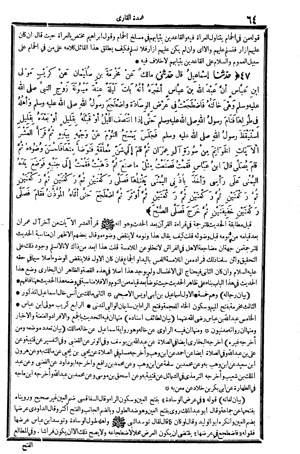 بَيَان لغاته قَوْله: (فِي عرض الوسادة) ، بِفَتْح الْعين وَسُكُون الرَّاء، وَقَالَ السفاقسي؛ ضم الْعين غير صَحِيح، ورويناه بِفَتْحِهَا عَن جمَاعَة، وَقَالَ ابو عبد الْملك: رُوِيَ بِفَتْح الْعين وَهُوَ ضد الطول، وبالضم الْجَانِب، وَالْفَتْح أَكثر. وَقَالَ الدَّاودِيّ عرضهَا بِضَم الْعين، وَأنْكرهُ أَبُو الْوَلِيد، وَقَالَ: لَو كَانَ كَمَا قَالَ لقَالَ: توسد النَّبِي صلى الله عَلَيْهِ وَسلم وَأَهله طول الوسادة، وتوسد ابْن عَبَّاس عرضهَا. فَقَوله: (فاضطجع فِي عرضهَا) يَقْتَضِي أَن يكون الْعرض محلا لاضطجاعه، وَلَا يَصح ذَلِك إلاَّ أَن يكون فراشا. وَفِي (الْمطَالع)