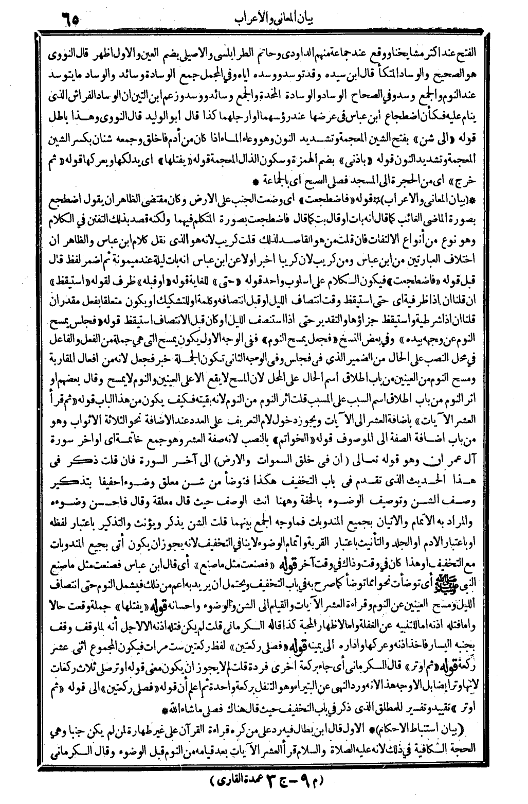 بَيَان الْمعَانِي وَالْإِعْرَاب قَوْله: (فاضطجعت) أَي: وضعت الْجنب على الأَرْض وَكَانَ مُقْتَضى الظَّاهِر أَن يَقُول: اضْطجع بِصُورَة الْمَاضِي الْغَائِب، كَمَا قَالَ: إِنَّه بَات. أَو قَالَ: بت كَمَا قَالَ: فاضطجعت، بِصُورَة الْمُتَكَلّم فيهمَا، وَلكنه قصد بذلك التفنن فِي الْكَلَام وَهُوَ نوع من أَنْوَاع الِالْتِفَات. فَإِن قلت: من هُوَ القاصد لذَلِك؟ قلت: كريب، لِأَنَّهُ هُوَ الَّذِي نقل كَلَام ابْن عَبَّاس، وَالظَّاهِر أَن اخْتِلَاف العبارتين من ابْن عَبَّاس وَمن كريب، لِأَنَّهُ كريباً أخبر أَولا عَن ابْن عَبَّاس أَنه باتت لَيْلَة عِنْد مَيْمُونَة، ثمَّ أضمر لفظ: قَالَ، قبل قَوْله: (فاضطجعت) ، فَيكون الْكَلَام على أسلوب وَاحِد. قَوْله: (حَتَّى) للغاية. قَوْله: (أَو قبله) ظرف لقَوْله: (اسْتَيْقَظَ) . إِن قُلْنَا: إِن: اذا ظرفية اي: حَتَّى اسْتَيْقَظَ وَقت انتصاف اللَّيْل، أَو قبل انتصافه. وَكلمَة: أَو، للتشكيك أَو يكون مُتَعَلقا بِفعل مُقَدّر. إِن قُلْنَا: إِن إِذا، شَرْطِيَّة و: اسْتَيْقَظَ، جزاؤها، وَالتَّقْدِير: حَتَّى إِذا استنصف اللَّيْل، أَو كَانَ قبل الانتصاف، اسْتَيْقَظَ. قَوْله: (فَجَلَسَ يمسح النّوم عَن وَجهه بِيَدِهِ) وَفِي بعض النّسخ: (فَجعل يمسح النّوم) . فَفِي الْوَجْه الأول يكون: يمسح، الَّتِي هِيَ جملَة من الْفِعْل وَالْفَاعِل فِي مَحل النصب على الْحَال من الضَّمِير الَّذِي فِي: فَجَلَسَ وَفِي الْوَجْه الثَّانِي: تكون الْجُمْلَة خبر: فَجعل، لِأَنَّهُ من أَفعَال المقاربة. وَمسح النّوم من الْعَينَيْنِ من بَاب إِطْلَاق اسْم الْحَال على الْمحل، لِأَن الْمسْح لَا يَقع إلاَّ على الْعَينَيْنِ، وَالنَّوْم لَا يمسح. وَقَالَ بَعضهم: أَو أثر النّوم من بَاب إِطْلَاق إسم السَّبَب على الْمُسَبّب. قلت: أثر النّوم من النّوم لِأَنَّهُ بَقِيَّته، فَكيف يكون من هَذَا الْبَاب؟ قَوْله: (ثمَّ قَرَأَ الْعشْر الْآيَات) بِإِضَافَة الْعشْر إِلَى الْآيَات، وَيجوز دُخُول لَام التَّعْرِيف على الْعدَد عِنْد الْإِضَافَة، نَحْو: الثَّلَاثَة الأثواب، وَهُوَ من بَاب إِضَافَة الصّفة إِلَى الْمَوْصُوف. قَوْله: (الْخَوَاتِم) بِالنّصب لِأَنَّهُ صفة: الْعشْر، وَهُوَ جمع خَاتِمَة أَي: أَوَاخِر سُورَة آل عمرَان، وَهُوَ قَوْله تَعَالَى: {إِن فِي خلق السَّمَوَات وَالْأَرْض} (آل عمرَان: 190) الى آخر السُّورَة. فَإِن قلت: ذكر فِي هَذَا الحَدِيث الَّذِي تقدم فِي بَاب التَّخْفِيف، هَكَذَا: فَتَوَضَّأ من شن مُعَلّق وضُوءًا خَفِيفا، بتذكير وصف الشن، وتوصيف الْوضُوء بالخفة، وَهَهُنَا أنث الْوَصْف حَيْثُ قَالَ: معلقَة، وَقَالَ: فَأحْسن وضوءه، وَالْمرَاد بِهِ الْإِتْمَام والإتيان بِجَمِيعِ المندوبات. فَمَا وَجه الْجمع بَينهمَا؟ قلت: الشن: يذكر وَيُؤَنث، والتذكير بِاعْتِبَار لَفظه أَو بِاعْتِبَار الْأدم أَو الْجلد، والتأنيث بِاعْتِبَار الْقرْبَة، وإتمام الْوضُوء لَا يُنَافِي التَّخْفِيف، لِأَنَّهُ يجوز أَن يكون أَتَى بِجَمِيعِ المندوبات مَعَ التَّخْفِيف، أَو هَذَا كَانَ فِي وَقت، وَذَاكَ فِي وَقت آخر. قَوْله: (فصنعت مثل مَا صنع) أَي: قَالَ ابْن عَبَّاس: فصنعت مثل مَا صنع النَّبِي صلى الله عَلَيْهِ وَسلم أَي: تَوَضَّأت نَحوا مِمَّا تَوَضَّأ، كَمَا صرح بِهِ فِي بَاب التَّخْفِيف، وَيحْتَمل أَن يُرِيد بِهِ أَعم من ذَلِك فَيشْمَل النّوم حَتَّى انتصاف اللَّيْل وَمسح الْعَينَيْنِ عَن النّوم وَقِرَاءَة الْعشْر الْآيَات وَالْقِيَام إِلَى الشن وَالْوُضُوء وإحسانه. قَوْله: (يفتلها) جملَة وَقعت حَالا، وَأما فتله أُذُنه: إِمَّا للتّنْبِيه عَن الْغَفْلَة وَإِمَّا لإِظْهَار الْمحبَّة. كَذَا قَالَه الْكرْمَانِي. قلت: لم يكن فتله أُذُنه إلاَّ لأجل أَنه لما وقف وقف بجنبه الْيَسَار فَأخذ أُذُنه وعركها وأداره إِلَى يَمِينه. قَوْله: (فصلى رَكْعَتَيْنِ) لفظ: رَكْعَتَيْنِ، سِتّ مَ