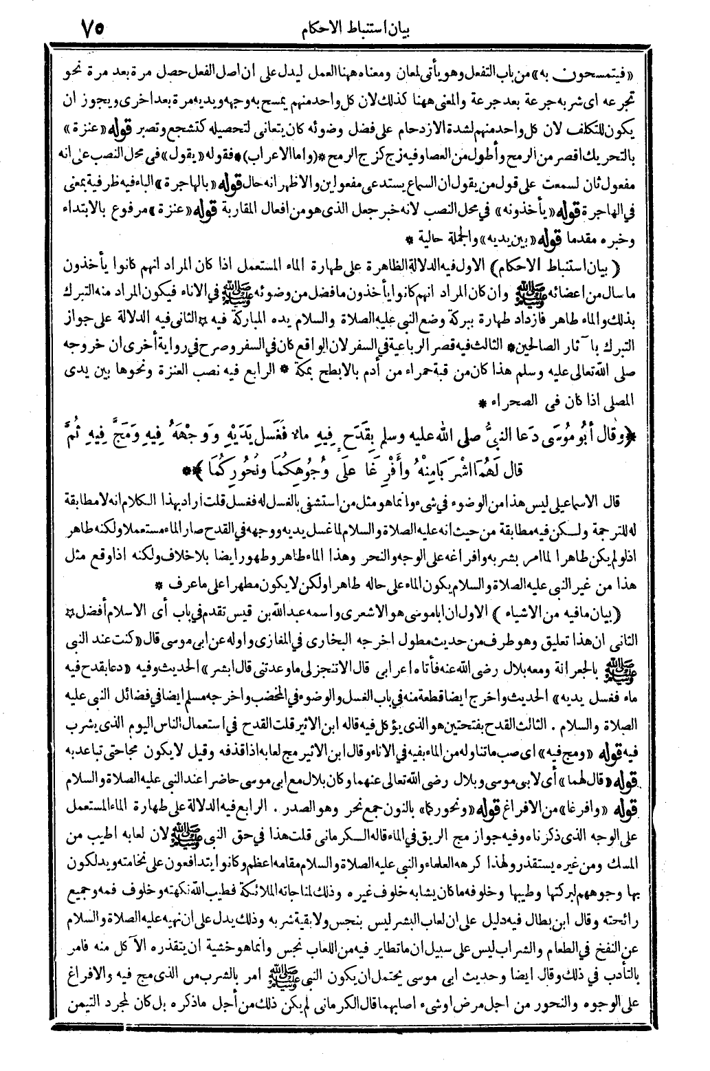 بَيَان إستنباط الْأَحْكَام: الأول: فِيهِ الدّلَالَة الظَّاهِرَة على طَهَارَة المَاء الْمُسْتَعْمل إِذا كَانَ المُرَاد أَنهم كَانُوا يَأْخُذُونَ مَا سَالَ من أَعْضَائِهِ صلى الله عَلَيْهِ وَسلم، وَإِن كَانَ المُرَاد أَنهم كَانُوا يَأْخُذُونَ مَا فضل من وضوئِهِ صلى الله عَلَيْهِ وَسلم فِي الْإِنَاء فَيكون المُرَاد مِنْهُ التَّبَرُّك بذلك، وَالْمَاء طَاهِر فازداد طَهَارَة ببركة وضع النَّبِي صلى الله عَلَيْهِ وَسلم، يَده الْمُبَارَكَة فِيهِ. الثَّانِي: فِيهِ الدّلَالَة على جَوَاز التَّبَرُّك بآثار الصَّالِحين. الثَّالِث: فِيهِ قصر الرباعة فِي السّفر، لِأَن الْوَاقِع كَانَ فِي السّفر، وَصرح فِي رِوَايَة أُخْرَى أَن خُرُوجه صلى الله عَلَيْهِ وَسلم، وَهَذَا كَانَ من قبَّة حَمْرَاء من أَدَم بِالْأَبْطح بِمَكَّة. الرَّابِع: فِيهِ نصب العنزة وَنَحْوهَا بَين يَدي الْمُصَلِّي إِذا كَانَ فِي الصَّحرَاء.