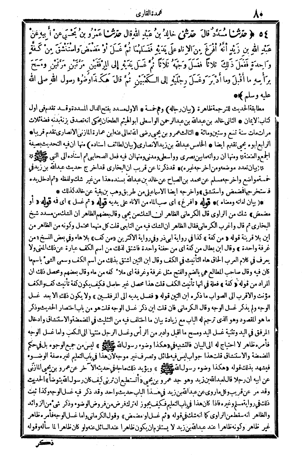 بَيَان لغاته وَمَعْنَاهُ قَوْله: (أفرغ) اي: صب المَاء فِي الْإِنَاء على يَدَيْهِ. قَوْله: (ثمَّ غسل) أَي: فَمه. قَوْله: (أَو مضمض) شكّ من الرَّاوِي. قَالَ الْكرْمَانِي: الظَّاهِر أَن الشَّك من يحيى. وَقَالَ بَعضهم: الظَّاهِر أَن الشَّك من مُسَدّد شيخ البُخَارِيّ، ثمَّ قَالَ: وَأغْرب الْكرْمَانِي فَقَالَ: الظَّاهِر أَن الشَّك فِيهِ من التَّابِعِيّ: قلت: كل مِنْهُمَا مُحْتَمل، وَكَونه من الظَّاهِر من أَيْن بِلَا قرينَة؟ قَوْله: (من كفة) كَذَا فِي رِوَايَة أبي ذَر، وَفِي رِوَايَة الْأَكْثَر بن: (من كف) بِلَا هَاء، وَفِي بعض النّسخ: (من غرفَة وَاحِدَة) . وَقَالَ ابْن بطال: من كفة، أَي: من حفْنَة وَاحِدَة، فاشتق لذَلِك من اسْم الْكَفّ عبارَة عَن ذَلِك الْمَعْنى، وَلَا يعرف فِي كَلَام الْعَرَب إِلْحَاق هَاء التَّأْنِيث فِي الْكَفّ. وَقَالَ ابْن التِّين: اشتق بذلك من اسْم الْكَفّ، وَسمي الشَّيْء باسم مَا كَانَ فِيهِ. وَقَالَ صَاحب (الْمطَالع) : هِيَ بِالضَّمِّ وَالْفَتْح مثل غرفَة وغرفة، أَي: مَلأ كَفه من مَاء. وَقَالَ بَعضهم: ومحصل ذَلِك أَن المُرَاد من قَوْله: (كَفه) فعلة فِي أَنَّهَا تَأْنِيث الْكَفّ. قلت: هَذَا مُحَصل غير حَاصِل، فَكيف يكون كفة تَأْنِيث كف، والكف مؤنث؟ وَالْأَقْرَب إِلَى الصَّوَاب مَا ذكره ابْن التِّين قَوْله: (فَغسل يَدَيْهِ إِلَى الْمرْفقين) . وَلَا يكون ذَلِك إلاَّ بعد غسل الْوَجْه، وَلم يذكر غسل الْوَجْه. وَقَالَ الْكرْمَانِي: فان قلت: أَيْن ذكر غسل الْوَجْه؟ قلت: هُوَ من بَاب اخْتِصَار الحَدِيث وَذكر مَا هُوَ الْمَقْصُود، وَهُوَ الَّذِي ترْجم لَهُ الْبَاب مَعَ زِيَادَة بَيَان مَا اخْتلف فِيهِ من التَّثْلِيث فِي الْمَضْمَضَة وَالِاسْتِنْشَاق وَإِدْخَال الْمرْفق فِي الْيَد وتثنية غسل الْيَد وَمسح مَا أقبل وَأدبر من الرَّأْس وَغسل الرجل منتهياً إِلَى الكعب، وَأما غسل الْوَجْه فَأمره ظَاهر لَا احْتِيَاج لَهُ إِلَى الْبُنيان؛ فالتشبيه فِي: (هَكَذَا وضوء رَسُول الله صلى الله عَلَيْهِ وَسلم) لَيْسَ من جَمِيع الْوُجُوه، بل فِي حكم الْمَضْمَضَة وَالِاسْتِنْشَاق. قلت: هَذَا جَوَاب لَيْسَ فِيهِ طائل، وَتصرف غير موجه، لِأَن هَذَا فِي بَاب التَّعْلِيم لغيره صفة الْوضُوء، فَيشْهد بذلك قَوْله: (هَكَذَا وضوء رَسُول الله صلى الله عَلَيْهِ وَسلم) ، وَيُؤَيّد ذَلِك مَا جَاءَ فِي حَدِيث الآخر عَن عَمْرو بن يحيى الْمَازِني، عَن أَبِيه أَن رجلا قَالَ لعبد الله بن زيد، وَهُوَ حد عَمْرو بن يحيى: (أتستطيع أَن تريني كَيفَ كَانَ رَسُول الله يتَوَضَّأ) ؟ الحَدِيث ... وَقد مر عَن قريب، وكل مَا رُوِيَ عَن عبد الله بن زيد فِي هَذَا الْبَاب حَدِيث وَاحِد وَقد ذكر فِيهِ غسل الْوَجْه، وَكَذَا ثَبت ذَلِك فِي رِوَايَة مُسلم وَغَيره، فَإِذا كَانَ هَذَا فِي بَاب التَّعْلِيم فَكيف يجوز لَهُ ترك فرض من فروض الْوضُوء وَذكر شَيْء من الزَّوَائِد؟ وَالظَّاهِر أَنه سقط من الرَّاوِي كَمَا أَنه شكّ فِي قَوْله: (ثمَّ غسل أَو مضمض) . وَقَول الْكرْمَانِي: واما غسل الْوَجْه فَأمره ظَاهر، غير ظَاهر، وَكَونه ظَاهرا عِنْد عبد الله بن زيد لَا يسْتَلْزم أَن يكون ظَاهرا عِنْد السَّائِل عَنهُ، وَلَو كَانَ ظَاهرا لما سَأَلَهُ. وَقَوله