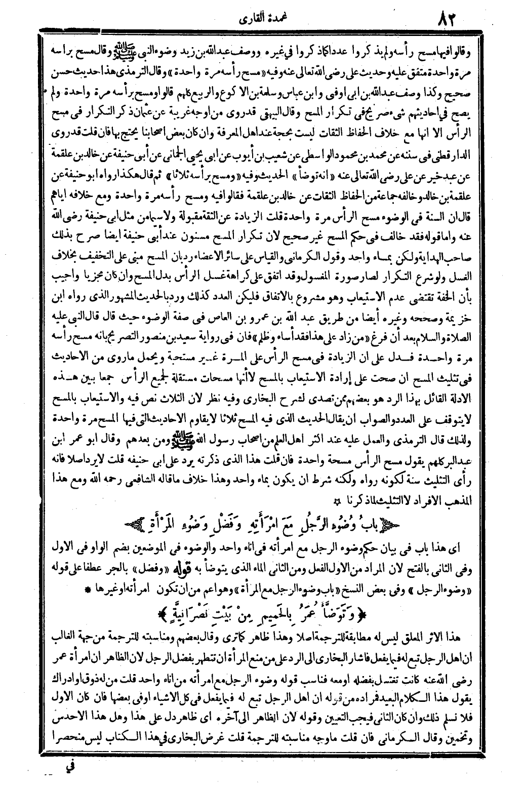 وَقَالُوا فِيهَا: مسح رَأسه، وَلم يذكرُوا عددا، كَمَا ذكرُوا فِي غَيره، وَوصف عبد الله بن زيد وضوء النَّبِي صلى الله عَلَيْهِ وَسلم وَقَالَ: مسح براسه مرّة وَاحِدَة، مُتَّفق عَلَيْهِ. وَحَدِيث عَليّ، رَضِي الله تَعَالَى عَنهُ، وَفِيه: (مسح رَأسه مرّة وَاحِدَة) . وَقَالَ التِّرْمِذِيّ: هَذَا حَدِيث حسن صَحِيح، وَكَذَا وصف عبد الله بن أبي أوفى وَابْن عَبَّاس وَسَلَمَة بن الْأَكْوَع وَالربيع، كلهم قَالُوا: وَمسح بِرَأْسِهِ مرّة وَاحِدَة، وَلم يَصح فِي أَحَادِيثهم شَيْء صَرِيح فِي تكْرَار الْمسْح. وَقَالَ الْبَيْهَقِيّ: قد رُوِيَ من أوجه غَرِيبَة عَن عُثْمَان ذكرُ التّكْرَار فِي مسح الرَّأْس، إلاَّ أَنَّهَا مَعَ خلاف الْحفاظ الثِّقَات لَيست بِحجَّة عِنْد أهل الْمعرفَة، وَإِن كَانَ بعض أَصْحَابنَا يحْتَج بهَا. فان قلت: قد روى الدَّارَقُطْنِيّ فِي (سنَنه) عَن مُحَمَّد بن مَحْمُود الوَاسِطِيّ عَن شُعَيْب بن أَيُّوب عَن أبي يحيى الجماني عَن أبي حنيفَة عَن خَالِد بن عَلْقَمَة عَن عبد خير عَن عَلَيْهِ رَضِي الله تَعَالَى عَنهُ: (أَنه تَوَضَّأ) الحَدِيث، وَفِيه: (وَمسح بِرَأْسِهِ ثَلَاثًا) ، ثمَّ قَالَ: هَكَذَا رَوَاهُ أَبُو حنيفَة عَن عَلْقَمَة بن خَالِد. وَخَالفهُ جمَاعَة من الْحفاظ الثِّقَات عَن خَالِد بن عَلْقَمَة، فَقَالُوا فِيهِ: وَمسح رَأسه مرّة وَاحِدَة وَمَعَ خلَافَة إيَّاهُم قَالَ: إِن السّنة فِي الْوضُوء مسح الرَّأْس مرّة وَاحِدَة. قلت: الزِّيَادَة عَن الثِّقَة مَقْبُولَة، وَلَا سِيمَا من مثل أبي حنيفَة، رَضِي الله عَنهُ. وَأما قَوْله: فقد خَالف فِي حكم الْمسْح، غير صَحِيح، لِأَن تكْرَار الْمسْح مسنون عَن أبي حنيفَة أَيْضا، صرح بذلك صَاحب (الْهِدَايَة) : وَلَكِن بِمَاء وَاحِد. وَقَول الْكرْمَانِي وَالْقِيَاس على سَائِر الْأَعْضَاء، ردَّ بِأَن الْمسْح مَبْنِيّ على التَّخْفِيف، بِخِلَاف الْغسْل، وَلَو شرع التّكْرَار لصار صُورَة المغسول. وَقد اتّفق على كَرَاهَة غسل الرَّأْس بدل الْمسْح وَإِن كَانَ مجزياً. وَأجِيب: بِأَن الخفة تَقْتَضِي عدم الِاسْتِيعَاب، وَهُوَ مَشْرُوع بالِاتِّفَاقِ، فَلْيَكُن الْعدَد كَذَلِك ورد بِالْحَدِيثِ الْمَشْهُور الَّذِي رَوَاهُ ابْن خُزَيْمَة وَصَححهُ وَغَيره أَيْضا من طَرِيق عبد الله بن عَمْرو بن الْعَاصِ فِي صفة الْوضُوء حَيْثُ قَالَ: قَالَ النَّبِي، عَلَيْهِ الصَّلَاة وَالسَّلَام، بعد أَن فرغ: (من زَاد على هَذَا فقد أَسَاءَ وظلم) . فَإِن فِي رِوَايَة سعيد بن مَنْصُور التَّصْرِيح بِأَنَّهُ مسح رَأسه مرّة وَاحِدَة، فَدلَّ على أَن الزِّيَادَة فِي مسح الرَّأْس على الْمرة غير مُسْتَحبَّة، وَيحمل مَا رُوِيَ من الْأَحَادِيث فِي تثليث الْمسْح، إِن صحت على إِرَادَة الِاسْتِيعَاب بِالْمَسْحِ، لَا أَنَّهَا مسحات مُسْتَقلَّة لجَمِيع الرَّأْس، جمعا بَين هَذِه الْأَدِلَّة الْقَائِل بِهَذَا الرَّد هُوَ بَعضهم مِمَّن تصدى لشرح البُخَارِيّ، وَفِيه نظر، لِأَنَّهُ الثَّلَاث نَص فِيهِ، والاستيعاب بِالْمَسْحِ لَا يتَوَقَّف على الْعدَد، وَالصَّوَاب أَن يُقَال: الحَدِيث الَّذِي فِيهِ الْمسْح ثَلَاثًا لَا يُقَاوم الْأَحَادِيث الَّتِي فِيهَا الْمسْح مرّة وَاحِدَة، وَلذَلِك قَالَ التِّرْمِذِيّ: وَالْعَمَل عَلَيْهِ عِنْد أَكثر أهل الْعلم من أَصْحَاب رَسُول الله صلى الله عَلَيْهِ وَسلم وَمن بعدهمْ. وَقَالَ ابو عمر ابْن عبد الْبر: كلهم يَقُول مسح الرَّأْس مسحة وَاحِدَة. فَإِن قلت: هَذَا الَّذِي ذكرته يرد على أبي حنيفه. قلت: لَا يرد أصلا، فَإِنَّهُ رأى التَّثْلِيث سنة لكَونه رَوَاهُ، وَلكنه شَرط أَن يكون بِمَاء وَاحِد، وَهَذَا خلاف مَا قَالَه الشَّافِعِي، رَحمَه الله، وَمَعَ هَذَا الْمَذْهَب: الْإِفْرَاد لَا التثليثْ، لما ذكرنَا.