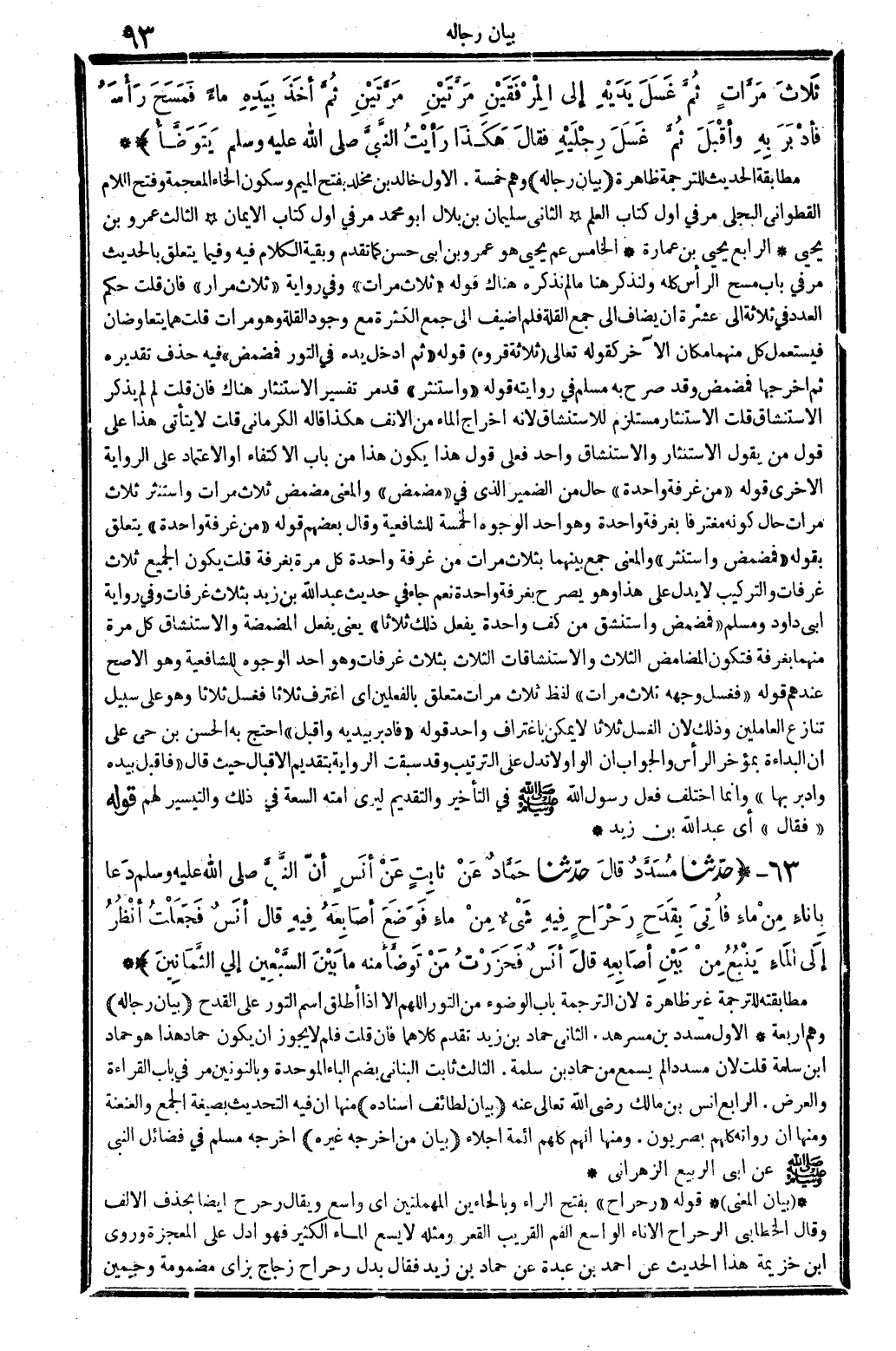 ثَلاثَ مَرَّاتٍ ثُمَّ غَسَلَ يَدَيْهِ إِلَى الْمِرْفَقَيْنِ مَرَّتَيْنِ مَرَّتَيْنِ ثُمَّ أخَذَ بِيَدِهِ مَاء فَمَسَحَ رَأْسَهُ فأدْبَرَ بِهِ وأقْبَلَ ثُمَّ غَسَلَ رِجْلَيْهِ فقالَ هَكَذَا رَأيْتُ النَّبيَّ صلى الله عَلَيْهِ وَسلم يَتَوَضَّأُ..