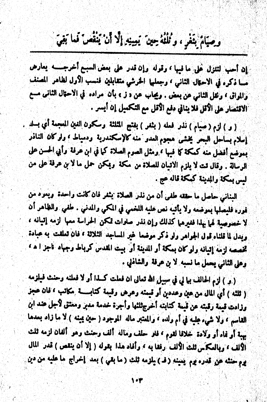(وَ) لَزِمَ الْحَالِفَ بِمَالِي فِي سَبِيلِ اللَّهِ تَعَالَى إنْ فَعَلْت كَذَا أَوْ لَأَفْعَلَنَّهُ وَحَنِثَ فَيَلْزَمُهُ (ثُلُثُهُ) أَيْ الْمَالِ مِنْ عَيْنٍ وَعَدَدَيْنِ أَوْ قِيمَتُهُ وَعَرَضٌ وَقِيمَةُ كِتَابَةِ مُكَاتَبٍ، فَإِنْ عَجَزَ وَزَادَتْ قِيمَةُ رَقَبَتِهِ عَنْ قِيمَةِ كِتَابَتِهِ أَخْرَجَ ثُلُثَهَا وَأُجْرَةَ خِدْمَةِ مُدَبَّرٍ وَمُعْتَقٍ لِأَجَلٍ عِنْدَ ابْنِ الْقَاسِمِ، وَلَا شَيْءَ عَلَيْهِ فِي أُمِّ وَلَدِهِ، وَالْمُعْتَبَرُ مَالُهُ الْمَوْجُودُ (حِينَ يَمِينِهِ) لَا مَا زَادَ بَعْدَهَا بِهِبَةٍ أَوْ نَمَاءٍ أَوْ وِلَادَةٍ خِلَافًا لِقَوْمٍ، فَلَوْ حَلَفَ، وَمَالُهُ أَلْفٌ وَحَنِثَ وَهُوَ أَلْفَانِ لَزِمَهُ ثُلُثُ الْأَلْفِ، وَبِالْعَكْسِ ثُلُثُ الْأَلْفِ رِفْقًا بِهِ، وَأَفَادَ هَذَا بِقَوْلِهِ (إلَّا أَنْ يَنْقُصَ) قَدْرُ الْمَالِ يَوْمَ حِنْثِهِ عَنْ قَدْرِهِ يَوْمَ يَمِينِهِ (فَ) يَلْزَمُهُ ثُلُثُ (مَا بَقِيَ) بَعْدَ إخْرَاجِ مَا عَلَيْهِ مِنْ دَيْنٍ