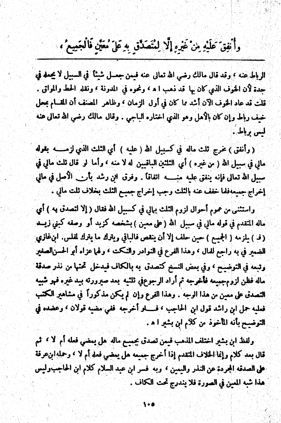 (وَأَنْفَقَ) مُخْرِجٌ ثُلُثَ مَالِهِ فِي كَسَبِيلِ اللَّهِ (عَلَيْهِ) أَيْ الثُّلُثَ الَّذِي لَزِمَهُ بِقَوْلِهِ مَالِي فِي سَبِيلِ اللَّهِ (مِنْ غَيْرِهِ) أَيْ الثُّلُثَيْنِ الْبَاقِيَيْنِ لَهُ لَا مِنْهُ، وَأَمَّا لَوْ قَالَ ثُلُثُ مَالِي فِي سَبِيلِ اللَّهِ تَعَالَى فَإِنَّهُ يُنْفَقُ عَلَيْهِ مِنْهُ اتِّفَاقًا. وَفَرَّقَ ابْنُ رُشْدٍ بِأَنَّ الْأَصْلَ فِي مَالِي إخْرَاجُ جَمِيعِهِ فَلَمَّا خُفِّفَ عَنْهُ بِالثُّلُثِ وَجَبَ إخْرَاجُ جَمِيعِ الثُّلُثِ بِخِلَافِ ثُلُثِ مَالِي. وَاسْتَثْنَى مِنْ عُمُومِ أَحْوَالِ لُزُومِ الثُّلُثِ بِمَالِي فِي كَسَبِيلِ اللَّهِ فَقَالَ (إلَّا لِتَصَدُّقٍ بِهِ) أَيْ مَالِهِ الْمُتَقَدِّمِ فِي قَوْلِهِ مَالِي فِي سَبِيلِ اللَّهِ (عَلَى مُعَيَّنٍ) بِشَخْصِهِ كَزَيْدٍ أَوْ وَصْفِهِ كَبَنِي زَيْدٍ (فَ) يَلْزَمُهُ (الْجَمِيعُ) حِينَ حَلَفَ إلَّا أَنْ يَنْقُصَ فَالْبَاقِي وَيَتْرُكُ مَا يُتْرَكُ لِمُفْلِسٍ. ابْنُ غَازِيٍّ الضَّمِيرُ فِي بِهِ رَاجِعٌ لِلْمَالِ، وَهَذَا الْفَرْعُ فِي النَّوَادِرِ وَالنُّكَتِ، وَلَهُمَا عَزَاهُ أَبُو الْحَسَنِ الصَّغِيرُ وَتَبِعَهُ فِي التَّوْضِيحِ، وَفِي بَعْضِ النُّسَخِ كَتَصَدُّقٍ بِهِ بِالْكَافِ فَيَدْخُلَ تَحْتَهَا مَنْ نَذَرَ صَدَقَةَ مَالِهِ فَظَنَّ لُزُومَ جَمِيعِهِ فَأَخْرَجَهُ ثُمَّ أَرَادَ الرُّجُوعَ فِي ثُلُثَيْهِ بَعْدَ صَيْرُورَتِهِ بِيَدِ غَيْرِهِ فَهُوَ شَبِيهُ التَّصَدُّقِ عَلَى مُعَيَّنٍ مِنْ هَذَا الْوَجْهِ.