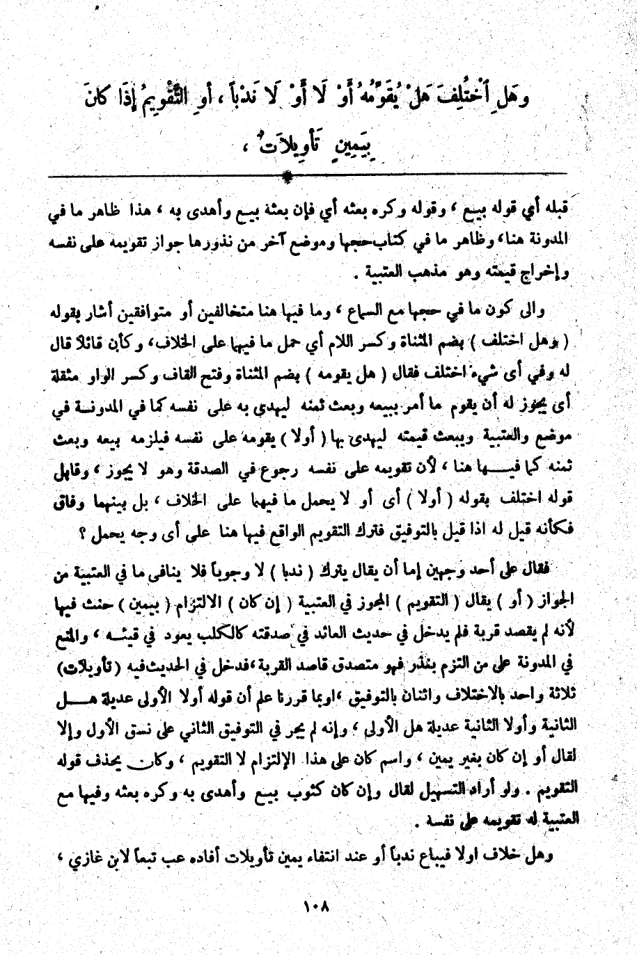 وَالْمَنْعُ فِي الْمُدَوَّنَةِ عَلَى مَنْ الْتَزَمَ بِنَذْرٍ فَهُوَ مُتَصَدِّقٌ قَاصِدٌ الْقُرْبَةَ، فَدَخَلَ فِي الْحَدِيثِ فِيهِ (تَأْوِيلَاتٌ) ثَلَاثَةٌ: وَاحِدٌ بِالِاخْتِلَافِ وَاثْنَانِ بِالتَّوْفِيقِ، وَبِمَا قَرَّرْنَا عُلِمَ أَنَّ قَوْلَهُ أَوَّلًا، الْأَوْلَى عَدِيلَةُ هَلْ الثَّانِيَةِ وَأَوَّلًا الثَّانِيَةُ عَدِيلَةُ هَلْ الْأُولَى، وَإِنَّهُ لَمْ يَجْرِ فِي التَّوْفِيقِ الثَّانِي عَلَى نَسَقِ الْأَوَّلِ وَإِلَّا لَقَالَ أَوْ إنْ كَانَ بِغَيْرِ يَمِينٍ، وَاسْمُ كَانَ عَلَى هَذَا الِالْتِزَامُ لَا التَّقْوِيمُ، وَكَانَ يَحْذِفُ قَوْلَهُ التَّقْوِيمُ. وَلَوْ أَرَادَ التَّسْهِيلَ لَقَالَ: وَإِنْ كَانَ كَثَوْبٍ بِيعَ وَأُهْدِيَ بِهِ وَكُرِهَ بَعْثُهُ وَفِيهَا مَعَ الْعُتْبِيَّةِ لَهُ تَقْوِيمُهُ عَلَى نَفْسِهِ. وَهَلْ خِلَافُ أَوَّلًا فَيُبَاعُ نَدْبًا أَوْ عِنْدَ انْتِفَاءِ يَمِينٍ تَأْوِيلَاتٌ أَفَادَهُ عب تَبَعًا لِابْنِ غَازِيٍّ،