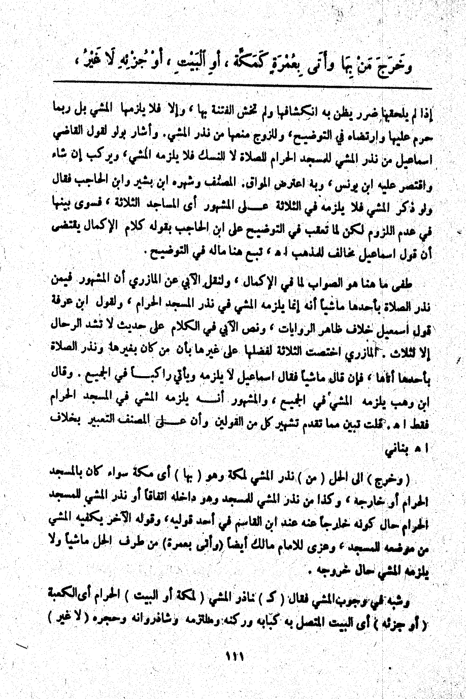 ـــــــــــــــــــــــــــــQإذَا لَمْ يَلْحَقْهَا ضَرَرٌ يُظَنُّ بِهِ انْكِشَافُهَا وَلَمْ تُخْشَ الْفِتْنَةُ بِهَا، وَإِلَّا فَلَا يَلْزَمُهَا الْمَشْيُ بَلْ رُبَّمَا حَرُمَ عَلَيْهَا، وَارْتَضَاهُ فِي التَّوْضِيحِ، وَلِلزَّوْجِ مَنْعُهَا مِنْ نَذْرِ الْمَشْيِ. وَأَشَارَ بِ وَلَوْ لِقَوْلِ الْقَاضِي إسْمَاعِيلَ مَنْ نَذَرَ الْمَشْيَ لِلْمَسْجِدِ الْحَرَامِ لِلصَّلَاةِ لَا لِلنُّسُكِ فَلَا يَلْزَمُهُ الْمَشْيُ، وَيَرْكَبُ إنْ شَاءَ وَاقْتَصَرَ عَلَيْهِ ابْنُ يُونُسَ، وَبِهِ اعْتَرَضَ الْمَوَّاقُ. الْمُصَنِّفَ وَشَهَرَهُ ابْنُ بَشِيرٍ وَابْنُ الْحَاجِبِ فَقَالَ: وَلَوْ ذَكَرَ الْمَشْيَ فَلَا يَلْزَمُهُ فِي الثَّلَاثَةِ عَلَى الْمَشْهُورِ أَيْ الْمَسَاجِدِ الثَّلَاثَةِ، فَسَوَّى بَيْنَهَا فِي عَدَمِ اللُّزُومِ لَكِنْ لَمَّا تَعَقَّبَ فِي التَّوْضِيحِ عَلَى ابْنِ الْحَاجِبِ بِقَوْلِهِ: كَلَامُ الْإِكْمَالِ يَقْتَضِي أَنَّ قَوْلَ إسْمَاعِيلَ مُخَالِفٌ لِلْمَذْهَبِ. اهـ. تَبِعَ هُنَا مَا لَهُ فِي التَّوْضِيحِ. طفى مَا هُنَا هُوَ الصَّوَابُ لِمَا فِي الْإِكْمَالِ، وَلِنَقْلِ الْآبِي عَنْ الْمَازِرِيِّ أَنَّ الْمَشْهُورَ فِيمَنْ نَذَرَ الصَّلَاةَ بِأَحَدِهَا مَاشِيًا أَنَّهُ إنَّمَا يَلْزَمُهُ الْمَشْيُ فِي نَذْرِ الْمَسْجِدِ الْحَرَامِ، وَلِقَوْلِ ابْنِ عَرَفَةَ قَوْلُ إسْمَاعِيلَ خِلَافُ ظَاهِرِ الرِّوَايَاتِ وَنَصُّ الْآبِي فِي الْكَلَامِ عَلَى حَدِيثِ «لَا تُشَدُّ الرِّحَالُ إلَّا لِثَلَاثٍ» . الْمَازِرِيُّ اخْتَصَّتْ الثَّلَاثَةَ لِفَضْلِهَا عَلَى غَيْرِهَا بِأَنَّ مَنْ كَانَ بِغَيْرِهَا وَنَذَرَ الصَّلَاةَ بِأَحَدِهَا أَتَاهَا، فَإِنْ قَالَ مَاشِيًا فَقَالَ إسْمَاعِيلُ لَا يَلْزَمُهُ وَيَأْتِي رَاكِبًا فِي الْجَمِيعِ. وَقَالَ ابْنُ وَهْبٍ يَلْزَمُهُ الْمَشْيُ فِي الْجَمِيعِ وَالْمَشْهُورُ أَنَّهُ يَلْزَمُهُ الْمَشْيُ فِي الْمَسْجِدِ الْحَرَامِ فَقَطْ. اهـ. قُلْت تَبَيَّنَ مِمَّا تَقَدَّمَ تَشْهِيرُ كُلٍّ مِنْ الْقَوْلَيْنِ أَنَّ عَلَى الْمُصَنِّفِ التَّعْبِيرَ بِخِلَافِ. اهـ بُنَانِيٌّ
