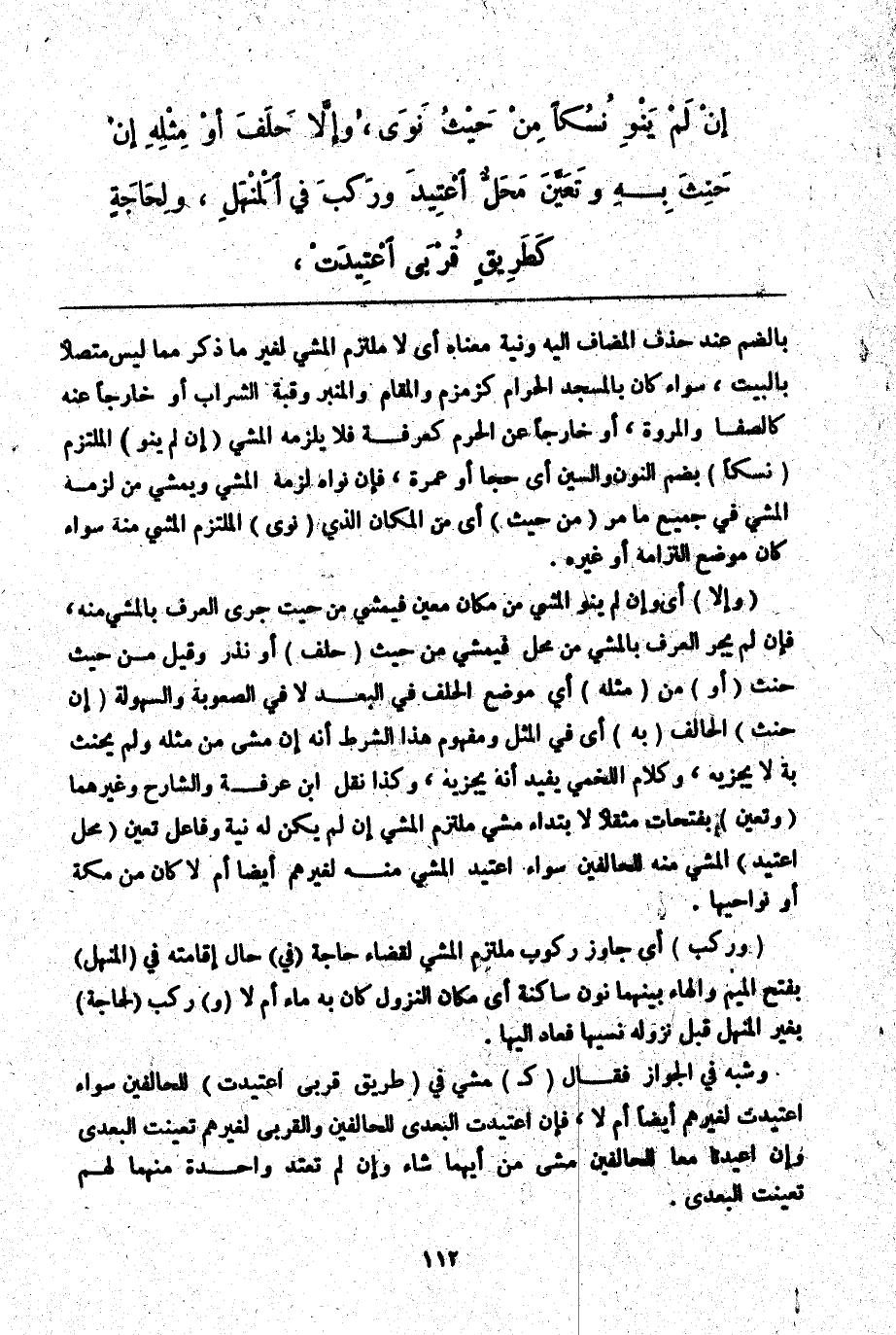 ـــــــــــــــــــــــــــــQبِالضَّمِّ عِنْدَ حَذْفِ الْمُضَافِ إلَيْهِ وَنِيَّةِ مَعْنَاهُ أَيْ لَا مُلْتَزِمَ الْمَشْيِ لِغَيْرِ مَا ذُكِرَ مِمَّا لَيْسَ مُتَّصِلًا بِالْبَيْتِ، سَوَاءٌ كَانَ بِالْمَسْجِدِ الْحَرَامِ كَزَمْزَمَ وَالْمَقَامِ وَالْمِنْبَرِ وَقُبَّةِ الشَّرَابِ أَوْ خَارِجًا عَنْهُ كَالصَّفَا وَالْمَرْوَةِ، أَوْ خَارِجًا عَنْ الْحَرَمِ كَعَرَفَةَ فَلَا يَلْزَمُهُ الْمَشْيُ (إنْ لَمْ يَنْوِ) الْمُلْتَزِمُ (نُسُكًا) بِضَمِّ النُّونِ وَالسِّينِ أَيْ حَجًّا أَوْ عُمْرَةً، فَإِنْ نَوَاهُ لَزِمَهُ الْمَشْيُ وَيَمْشِي مِنْ لَزِمَهُ الْمَشْيَ فِي جَمِيعِ مَا مَرَّ (مِنْ حَيْثُ) أَيْ مِنْ الْمَكَانِ الَّذِي (نَوَى) الْمُلْتَزِمُ الْمَشْيَ مِنْهُ سَوَاءٌ كَانَ مَوْضِعَ الْتِزَامِهِ أَوْ غَيْرَهُ.