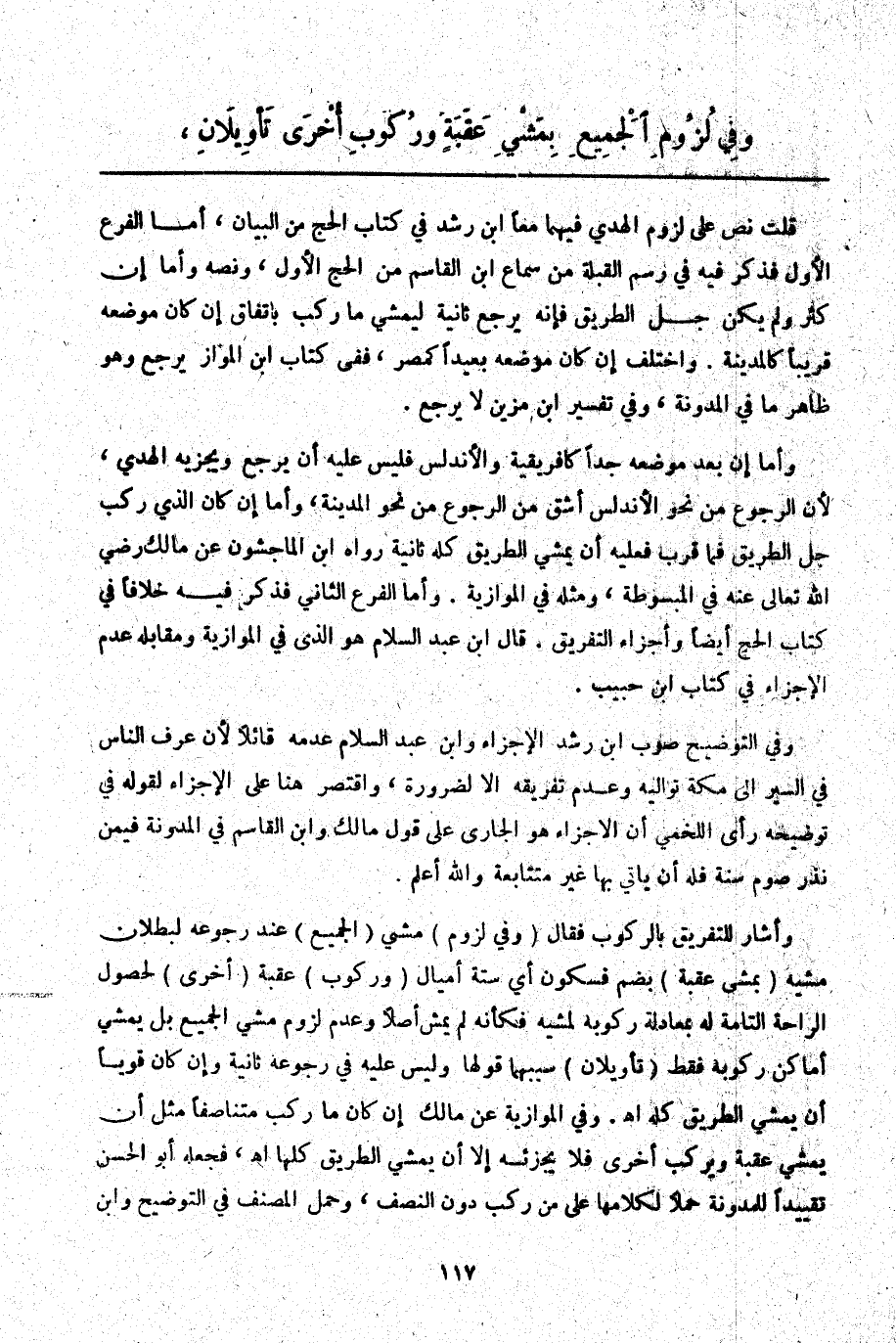 ـــــــــــــــــــــــــــــQقُلْت نَصَّ عَلَى لُزُومِ الْهَدْيِ فِيهِمَا مَعًا ابْنُ رُشْدٍ فِي كِتَابِ الْحَجِّ مِنْ الْبَيَانِ، أَمَّا الْفَرْعُ الْأَوَّلُ فَذَكَرَ فِيهِ فِي رَسْمِ الْقِبْلَةِ مِنْ سَمَاعِ ابْنِ الْقَاسِمِ مِنْ الْحَجِّ الْأَوَّلِ، وَنَصُّهُ وَأَمَّا إنْ كَثُرَ وَلَمْ يَكُنْ جُلَّ الطَّرِيقِ فَإِنَّهُ يَرْجِعُ ثَانِيَةً لِيَمْشِيَ مَا رَكِبَ بِاتِّفَاقٍ إنْ كَانَ مَوْضِعُهُ قَرِيبًا كَالْمَدِينَةِ. وَاخْتُلِفَ إنْ كَانَ مَوْضِعُهُ بَعِيدًا كَمِصْرِ، فَفِي كِتَابِ ابْنِ الْمَوَّازِ يَرْجِعُ وَهُوَ ظَاهِرُ مَا فِي الْمُدَوَّنَةِ، وَفِي تَفْسِيرِ ابْنِ مُزَيْنٍ لَا يَرْجِعُ.
