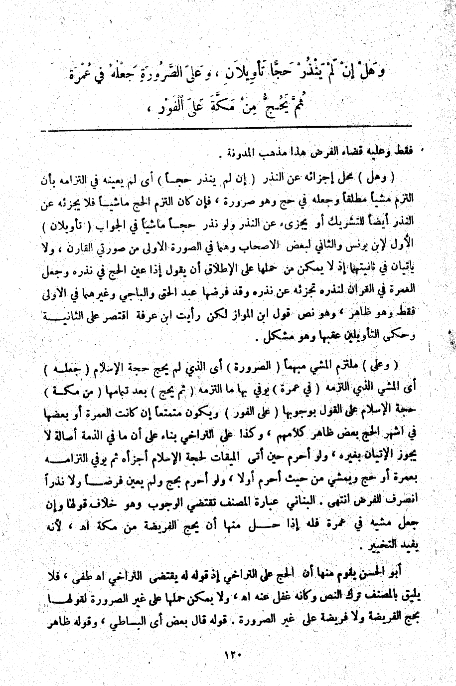(وَهَلْ) مَحَلُّ إجْزَائِهِ عَنْ النَّذْرِ (إنْ لَمْ يَنْذُرْ حَجًّا) أَيْ لَمْ يُعَيِّنْهُ فِي الْتِزَامِهِ بِأَنْ الْتَزَمَ مَشْيًا مُطْلَقًا وَجَعَلَهُ فِي حَجٍّ وَهُوَ ضَرُورَةٌ، فَإِنْ كَانَ الْتَزَمَ الْحَجَّ مَاشِيًا فَلَا يُجْزِئُهُ عَنْ النَّذْرِ أَيْضًا لِلتَّشْرِيكِ أَوْ يُجْزِئُ عَنْ النَّذْرِ وَلَوْ نَذَرَ حَجًّا مَاشِيًا فِي الْجَوَابِ (تَأْوِيلَانِ) : الْأَوَّلُ لِابْنِ يُونُسَ وَالثَّانِي لِبَعْضِ الْأَصْحَابِ وَهُمَا فِي الصُّورَةِ الْأُولَى مِنْ صُورَتَيْ الْقَارِنِ، وَلَا يَأْتِيَانِ فِي ثَانِيَتِهِمَا إذْ لَا يُمْكِنُ مِنْ حَمْلِهَا عَلَى الْإِطْلَاقِ أَنْ يَقُولَ إذَا عَيَّنَ الْحَجَّ فِي نَذْرِهِ وَجَعَلَ الْعُمْرَةَ فِي الْقِرَانِ لِنَذْرِهِ تُجْزِئُهُ عَنْ نَذْرِهِ وَقَدْ فَرَضَهَا عَبْدُ الْحَقِّ وَالْبَاجِيِّ وَغَيْرُهُمَا فِي الْأُولَى فَقَطْ وَهُوَ ظَاهِرٌ، وَهُوَ نَصُّ قَوْلِ ابْنِ الْمَوَّازِ لَكِنْ رَأَيْت ابْنَ عَرَفَةَ اقْتَصَرَ عَلَى الثَّانِيَةِ وَحَكَى التَّأْوِيلَيْنِ عَقِبَهَا وَهُوَ مُشْكِلٌ.