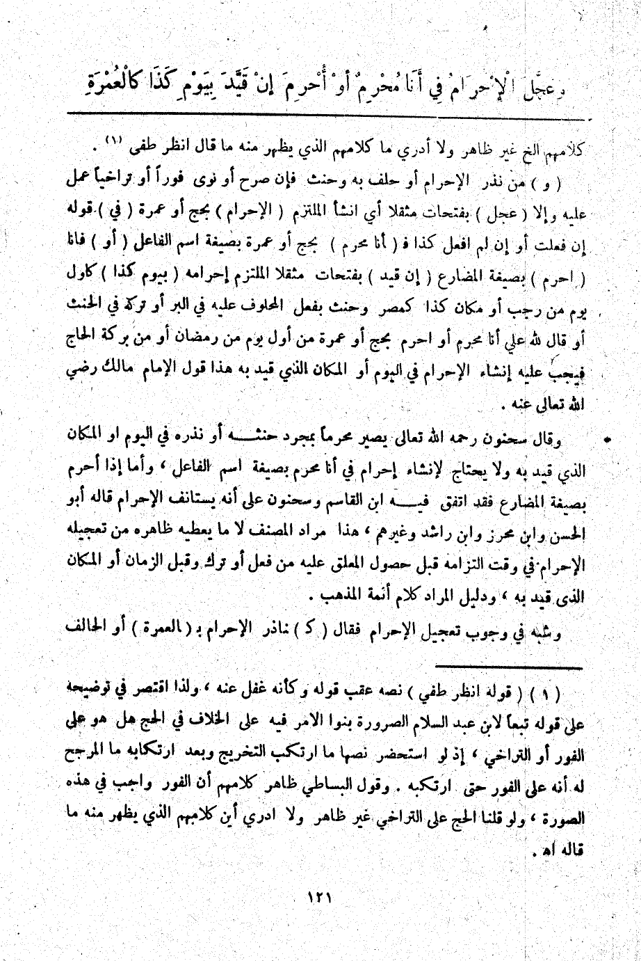 (وَ) مَنْ نَذَرَ الْإِحْرَامَ أَوْ حَلَفَ بِهِ وَحَنِثَ فَإِنْ صَرَّحَ أَوْ نَوَى فَوْرًا أَوْ تَرَاخِيًا عَمِلَ عَلَيْهِ وَإِلَّا (عَجَّلَ) بِفَتَحَاتٍ مُثَقَّلًا أَيْ أَنْشَأَ الْمُلْتَزِمُ (الْإِحْرَامَ) بِحَجٍّ أَوْ عُمْرَةٍ (فِي) قَوْلِهِ إنْ فَعَلْت أَوْ إنْ لَمْ أَفْعَلْ كَذَا فَ (أَنَا مُحْرِمٌ) بِحَجٍّ أَوْ عُمْرَةٍ بِصِيغَةِ اسْمِ الْفَاعِلِ (أَوْ) فَأَنَا (أُحْرِمُ) بِصِيغَةِ الْمُضَارِعِ (إنْ قَيَّدَ) بِفَتَحَاتٍ مُثَقَّلًا الْمُلْتَزِمُ إحْرَامَهُ (بِيَوْمِ كَذَا) كَأَوَّلِ يَوْمٍ مِنْ رَجَبٍ أَوْ مَكَانِ كَذَا كَمِصْرِ وَحَنِثَ بِفِعْلِ الْمَحْلُوفِ عَلَيْهِ فِي الْبِرِّ أَوْ تَرْكِهِ فِي الْحِنْثِ أَوْ قَالَ لِلَّهِ عَلَيَّ أَنَا مُحْرِمٌ أَوْ أُحْرِمُ بِحَجٍّ أَوْ عُمْرَةٍ مِنْ أَوَّلِ يَوْمٍ مِنْ رَمَضَانَ أَوْ مِنْ بَرَكَةِ الْحَاجِّ فَيَجِبُ عَلَيْهِ إنْشَاءُ الْإِحْرَامِ فِي الْيَوْمِ أَوْ الْمَكَانِ الَّذِي قَيَّدَ بِهِ هَذَا قَوْلُ الْإِمَامِ مَالِكٍ - رَضِيَ اللَّهُ تَعَالَى عَنْهُ -. وَقَالَ سَحْنُونٌ - رَحِمَهُ اللَّهُ تَعَالَى - يَصِيرُ مُحْرِمًا بِمُجَرَّدِ حِنْثِهِ أَوْ نَذْرِهِ فِي الْيَوْمِ أَوْ الْمَكَان الَّذِي قَيَّدَ بِهِ، وَلَا يَحْتَاجُ لِإِنْشَاءِ إحْرَامٍ فِي أَنَا مُحْرِمٌ بِصِيغَةِ اسْمِ الْفَاعِلِ، وَأَمَّا إذَا أَحْرَمَ بِصِيغَةِ الْمُضَارِعِ فَقَدْ اتَّفَقَ فِيهِ ابْنُ الْقَاسِمِ وَسَحْنُونٌ عَلَى أَنَّهُ يَسْتَأْنِفُ الْإِحْرَامَ قَالَهُ أَبُو الْحَسَنِ وَابْنُ مُحْرِزٍ وَابْنُ رَاشِدٍ وَغَيْرُهُمْ، هَذَا مُرَادُ الْمُصَنِّفِ لَا مَا يُعْطِيهِ ظَاهِرُهُ مِنْ تَعْجِيلِهِ الْإِحْرَامَ فِي وَقْتِ الْتِزَامِهِ قَبْلَ حُصُولِ الْمُعَلَّقِ عَلَيْهِ مِنْ فِعْلٍ أَوْ تَرْكٍ وَقَبْلَ الزَّمَانِ أَوْ الْمَكَانِ الَّذِي قَيَّدَ بِهِ، وَدَلِيلُ الْمُرَادِ كَلَامُ أَئِمَّةِ الْمَذْهَبِ.