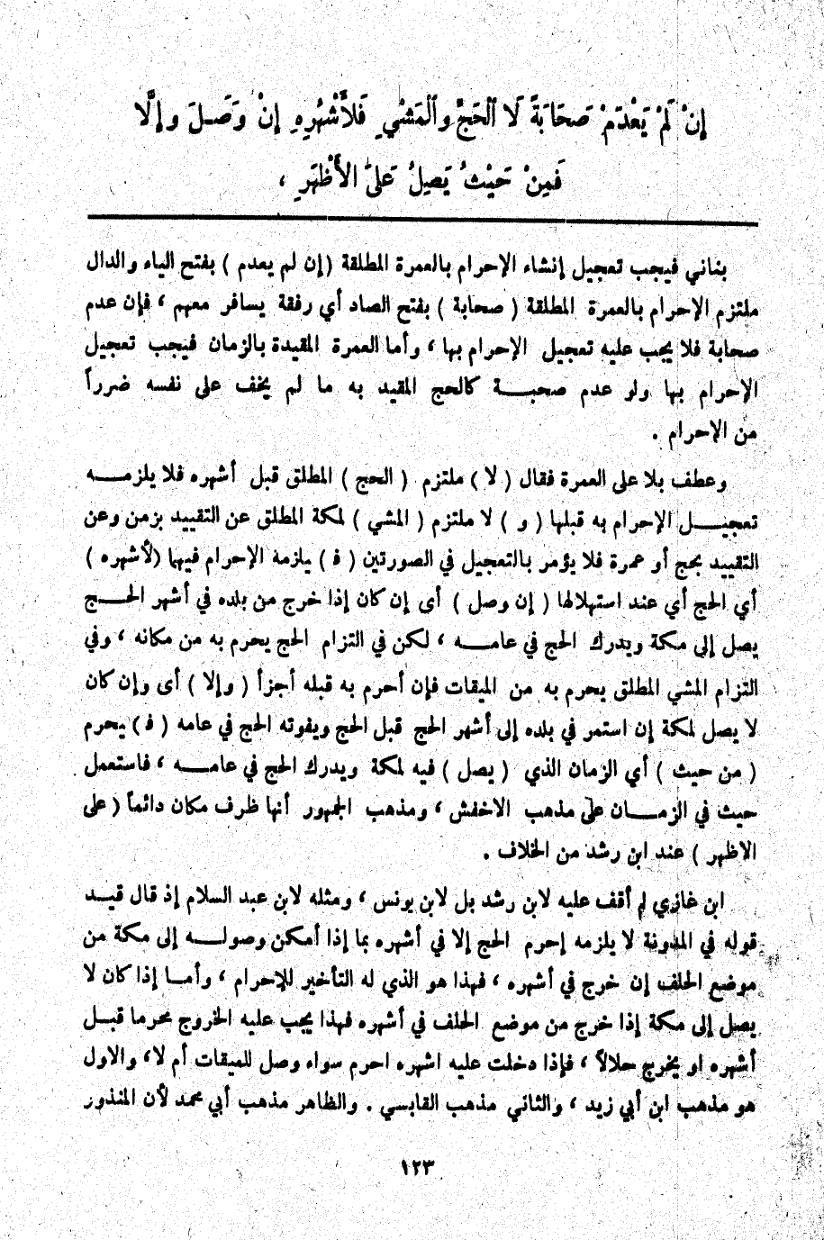 وَعَطَفَ بِلَا عَلَى الْعُمْرَةِ فَقَالَ (لَا) مُلْتَزِمُ (الْحَجِّ) الْمُطْلَقِ قَبْلَ أَشْهُرِهِ فَلَا يَلْزَمُهُ تَعْجِيلُ الْإِحْرَامِ بِهِ قَبْلَهَا (وَ) لَا مُلْتَزِمُ (الْمَشْيِ) لِمَكَّةَ الْمُطْلِقِ عَنْ التَّقْيِيدِ بِزَمَنٍ وَعَنْ التَّقْيِيدِ بِحَجٍّ أَوْ عُمْرَةٍ فَلَا يُؤْمَرُ بِالتَّعْجِيلِ فِي الصُّورَتَيْنِ (فَ) يَلْزَمُهُ الْإِحْرَامُ فِيهِمَا (لِأَشْهُرِهِ) أَيْ الْحَجِّ أَيْ عِنْدَ اسْتِهْلَالِهَا (إنْ وَصَلَ) أَيْ إنْ كَانَ إذَا خَرَجَ مِنْ بَلَدِهِ فِي أَشْهُرِ الْحَجِّ يَصِلُ إلَى مَكَّةَ وَيُدْرِكُ الْحَجَّ فِي عَامِهِ، لَكِنْ فِي الْتِزَامِ الْحَجِّ يُحْرِمُ بِهِ مِنْ مَكَانِهِ، وَفِي الْتِزَامِ الْمَشْيِ الْمُطْلَقِ يُحْرِمُ بِهِ مِنْ الْمِيقَاتِ فَإِنْ أَحْرَمَ بِهِ قَبْلَهُ أَجْزَأَ (وَإِلَّا) أَيْ وَإِنْ كَانَ لَا يَصِلُ لِمَكَّةَ إنْ اسْتَمَرَّ فِي بَلَدِهِ إلَى أَشْهُرِ الْحَجِّ قَبْلَ الْحَجِّ وَيَفُوتُهُ الْحَجُّ فِي عَامِهِ (فَ) يُحْرِمُ (مِنْ حَيْثُ) أَيْ الزَّمَانُ الَّذِي (يَصِلُ) فِيهِ لِمَكَّةَ وَيُدْرِكُ الْحَجَّ فِي عَامِهِ، فَاسْتَعْمَلَ حَيْثُ فِي الزَّمَانِ عَلَى مَذْهَبِ الْأَخْفَشِ، وَمَذْهَبُ الْجُمْهُورِ أَنَّهَا ظَرْفُ مَكَان دَائِمًا (عَلَى الْأَظْهَرِ) عِنْدَ ابْنِ رُشْدٍ مِنْ الْخِلَافِ. ابْنُ غَازِيٍّ لَمْ أَقِفْ عَلَيْهِ لِابْنِ رُشْدٍ بَلْ لِابْنِ يُونُسَ، وَمِثْلُهُ لِابْنِ عَبْدِ السَّلَامِ إذْ قَالَ قَيَّدَ قَوْلَهُ فِي الْمُدَوَّنَةِ لَا يَلْزَمُهُ إحْرَامُ الْحَجِّ إلَّا فِي أَشْهُرِهِ بِمَا إذَا أَمْكَنَ وُصُولُهُ إلَى مَكَّةَ مِنْ مَوْضِعِ الْحَلِفِ إنْ خَرَجَ فِي أَشْهُرِهِ، فَهَذَا هُوَ الَّذِي لَهُ التَّأْخِيرُ لِلْإِحْرَامِ، وَأَمَّا إذَا كَانَ لَا يَصِلُ إلَى مَكَّةَ إذَا خَرَجَ مِنْ مَوْضِعِ الْحَلِفِ فِي أَشْهُرِهِ فَهَذَا يَجِبُ عَلَيْهِ الْخُرُوجُ مُحْرِمًا قَبْلَ أَشْهُرِهِ أَوْ يَخْرُجُ حَلَالًا، فَإِذَا دَخَلَتْ عَلَيْهِ أَشْهُرُهُ أَحْرَمَ سَوَاءٌ وَصَلَ لِلْمِيقَاتِ أَمْ لَا