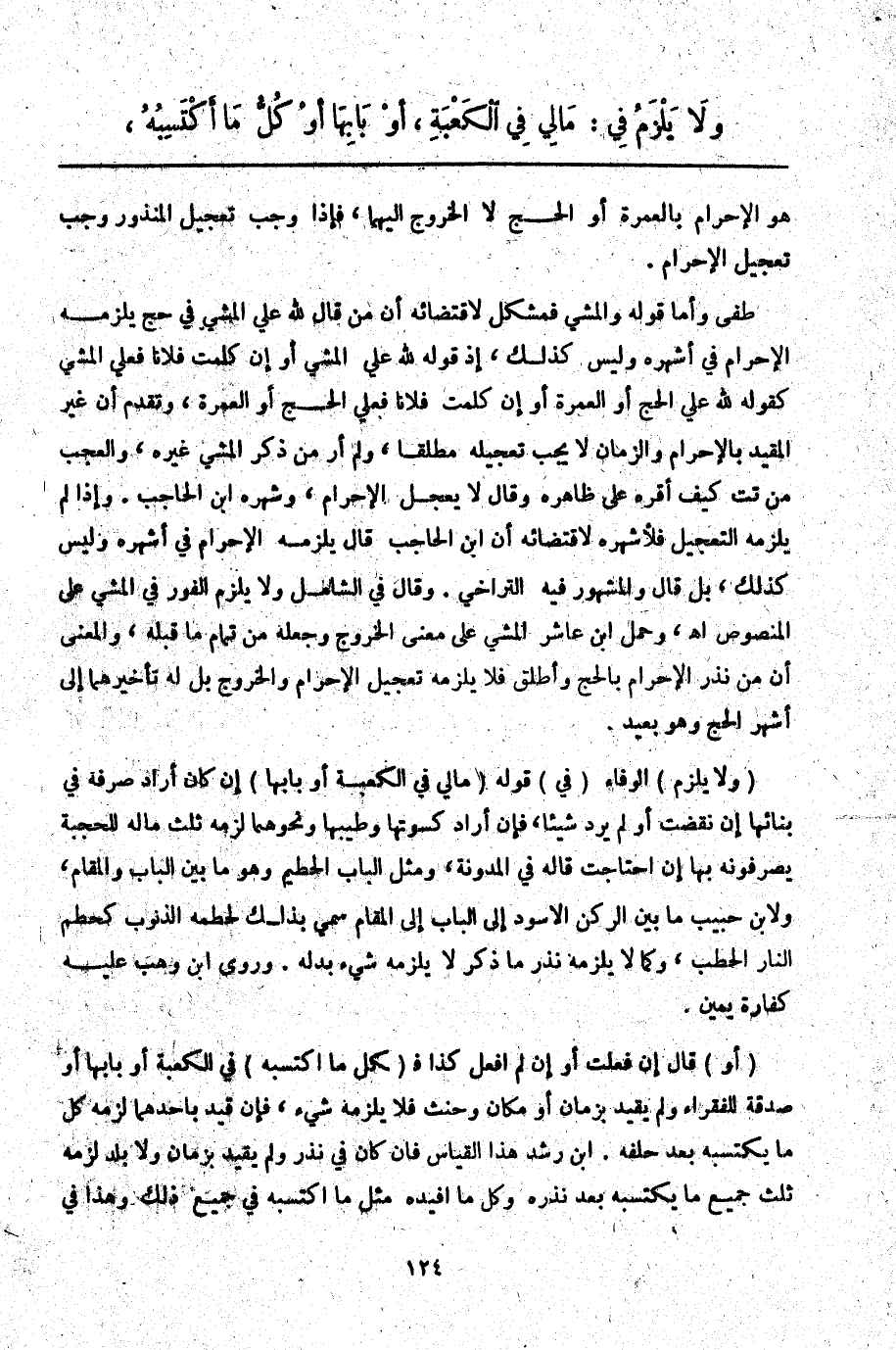(أَوْ) قَالَ إنْ فَعَلْت أَوْ إنْ لَمْ أَفْعَلْ كَذَا فَ (كُلُّ مَا أَكْتَسِبُهُ) فِي الْكَعْبَةِ أَوْ بَابِهَا أَوْ صَدَقَةٌ لِلْفُقَرَاءِ وَلَمْ يُقَيِّدْ بِزَمَانٍ أَوْ مَكَان وَحَنِثَ فَلَا يَلْزَمُهُ شَيْءٌ، فَإِنْ قَيَّدَ بِأَحَدِهِمَا لَزِمَهُ كُلُّ مَا يَكْتَسِبُهُ بَعْدَ حَلِفِهِ. ابْنُ رُشْدٍ هَذَا الْقِيَاسُ فَإِنْ كَانَ فِي نَذْرٍ وَلَمْ يُقَيِّدْ بِزَمَانٍ، وَلَا بَلَدٍ لَزِمَهُ ثُلُثُ جَمِيعِ مَا يَكْتَسِبُهُ بَعْدَ نَذْرِهِ وَكُلُّ مَا أُفِيدَهُ مِثْلَ مَا اكْتَسَبَهُ فِي جَمِيعِ ذَلِكَ وَهَذَا فِي