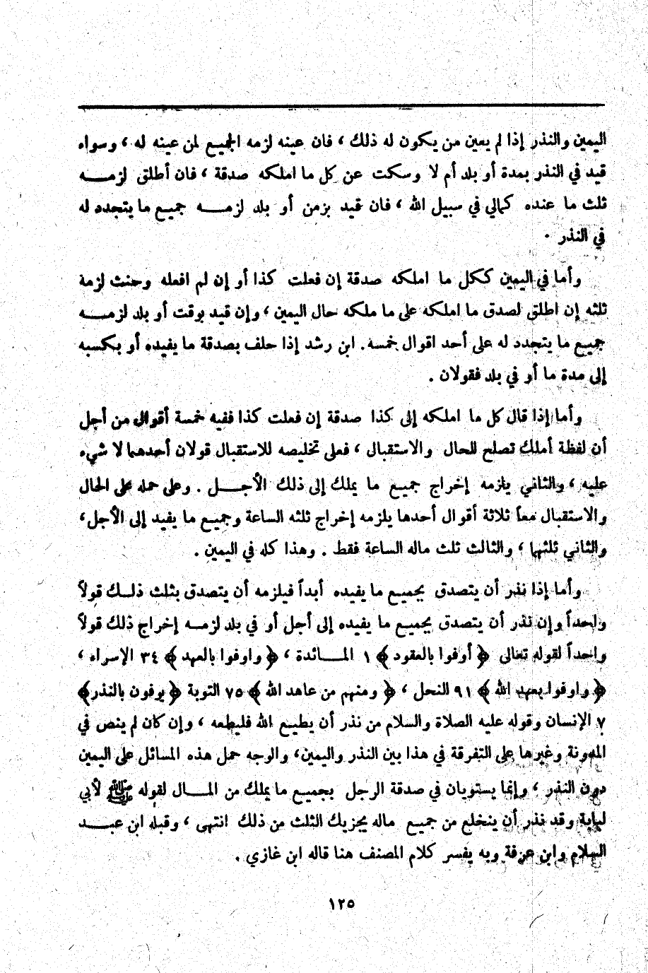 ـــــــــــــــــــــــــــــQالْيَمِينِ وَالنَّذْرِ إذَا لَمْ يُعَيِّنْ مَنْ يَكُونُ لَهُ ذَلِكَ، فَإِنْ عَيَّنَهُ لَزِمَهُ الْجَمِيعُ لِمَنْ عَيَّنَهُ لَهُ، وَسَوَاءٌ قَيَّدَ فِي النَّذْرِ بِمُدَّةٍ أَوْ بَلَدٍ أَوْ لَا وَسَكَتَ عَنْ كُلِّ مَا أَمْلِكُهُ صَدَقَةٌ، فَإِنْ أَطْلَقَ لَزِمَهُ ثُلُثُ مَا عِنْدَهُ كَمَالِي فِي سَبِيلِ اللَّهِ، فَإِنْ قَيَّدَ بِزَمَنٍ أَوْ بَلَدٍ لَزِمَهُ جَمِيعُ مَا يَتَجَدَّدُ لَهُ فِي النَّذْرِ. وَأَمَّا فِي الْيَمِينِ كَكُلِّ مَا أَمْلِكُهُ صَدَقَةٌ إنْ فَعَلْت كَذَا أَوْ إنْ لَمْ أَفْعَلْهُ وَحَنِثَ لَزِمَهُ ثُلُثُهُ إنْ أَطْلَقَ لِصِدْقِ مَا أَمْلِكُهُ عَلَى مَا مَلَكَهُ حَالَ الْيَمِينِ، وَإِنْ قَيَّدَ بِوَقْتٍ أَوْ بَلَدٍ لَزِمَهُ جَمِيعُ مَا يَتَجَدَّدُ لَهُ عَلَى أَحَدِ أَقْوَالٍ خَمْسَةٍ. ابْنُ رُشْدٍ إذَا حَلَفَ بِصَدَقَةِ مَا يُفِيدُهُ أَوْ يَكْسِبُهُ إلَى مُدَّةٍ مَا أَوْ فِي بَلَدٍ فَقَوْلَانِ. وَأَمَّا إذَا قَالَ كُلُّ مَا أَمْلِكُهُ إلَى كَذَا صَدَقَةٌ إنْ فَعَلْت كَذَا فَفِيهِ خَمْسَةُ أَقْوَالٍ مِنْ أَجْلِ أَنَّ لَفْظَةَ أَمْلِكُ تَصْلُحُ لِلْحَالِ وَالِاسْتِقْبَالِ، فَعَلَى تَخْلِيصِهِ لِلِاسْتِقْبَالِ قَوْلَانِ: أَحَدُهُمَا لَا شَيْءَ عَلَيْهِ، وَالثَّانِي يَلْزَمُهُ إخْرَاجُ جَمِيعِ مَا يَمْلِكُ إلَى ذَلِكَ الْأَجَلِ. وَعَلَى حَمْلِهِ عَلَى الْحَالِ وَالِاسْتِقْبَالِ مَعًا ثَلَاثَةُ أَقْوَالٍ: أَحَدُهَا يَلْزَمُهُ إخْرَاجُ ثُلُثِهِ السَّاعَةَ وَجَمِيعُ مَا يُفِيدُ إلَى الْأَجَلِ، وَالثَّانِي ثُلُثُهُمَا، وَالثَّالِثُ ثُلُثُ مَالِهِ السَّاعَةَ فَقَطْ. وَهَذَا كُلُّهُ فِي الْيَمِينِ.